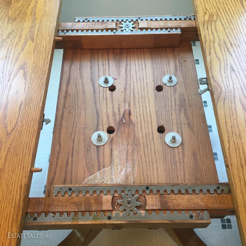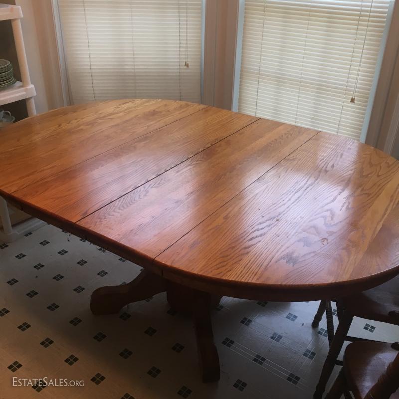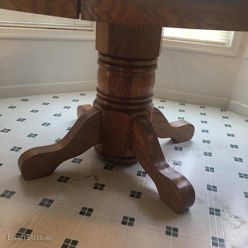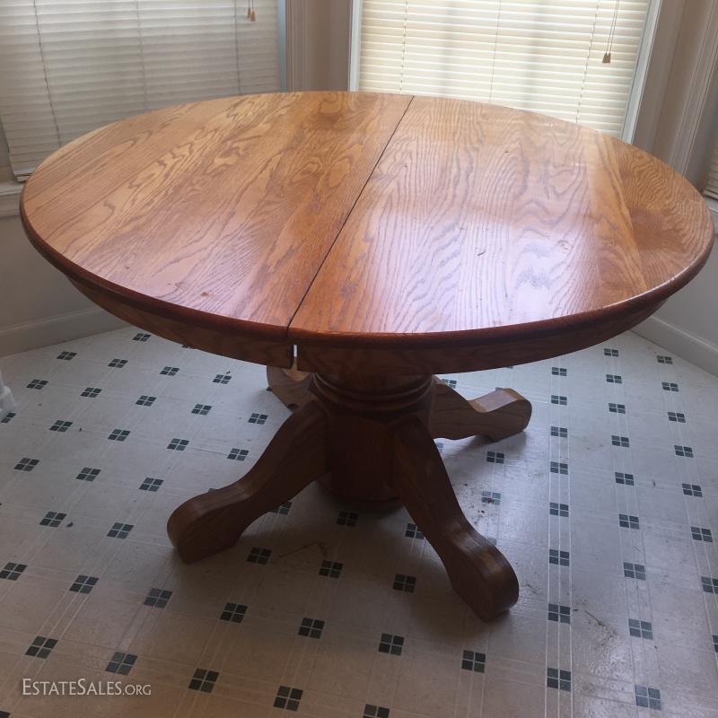 Solid oak pedestal table with 4 feet has two leaves and metal hardware slides for leaves. Very minimal ware to item. Table measures 48" diameter and 29.5" tall. With leaves in it is 72" x48". This lot is avaiable for local pick up in Mills River, NC only.