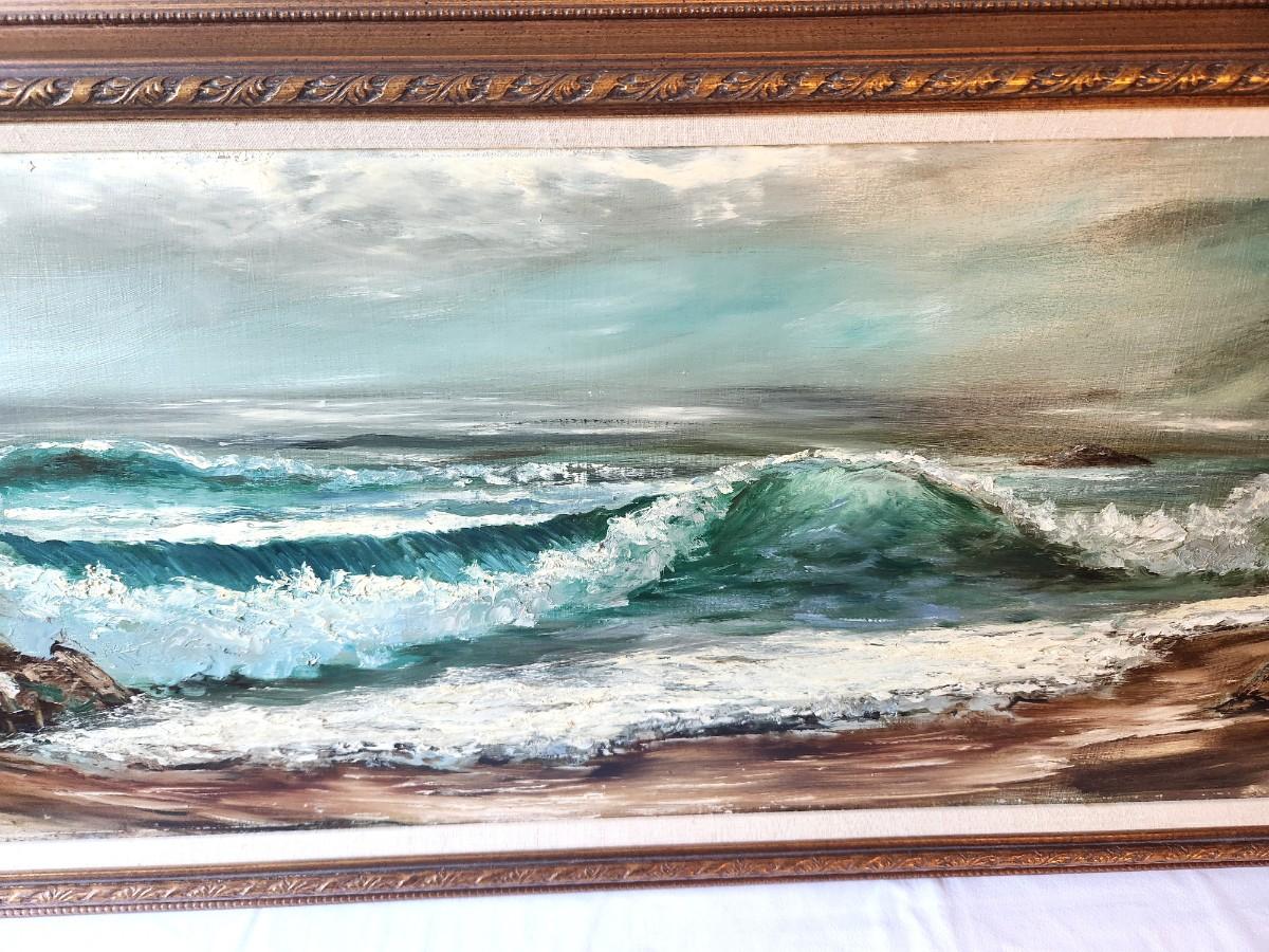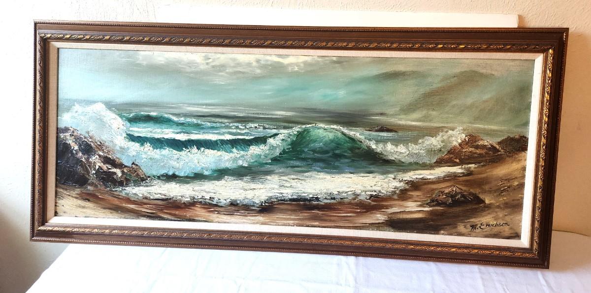 Original Seascape (large - 44.5" wide, 20" tall) - nicely framed - believed to be the work of Listed Artist M. Erickson. (Mary Erickson). She specializes in scenes from Long Island Sound and the coast of Maine - began painting professionally in 1993, mainly working oils. We believe this may be one of her earlier works. She maintains studios in North Carolina and Florida. Ms. Erickson is prolific and has a large body of work that is in collections and public spaces across the country. We have compared the signature against known signatures from her earlier works. While it is not an EXACT match, it is very, very close. Her style has changed a bit over the years, and again - we think this piece is from the 80's and one of her earlier works.
