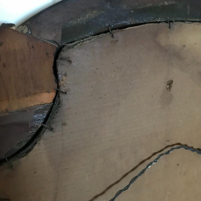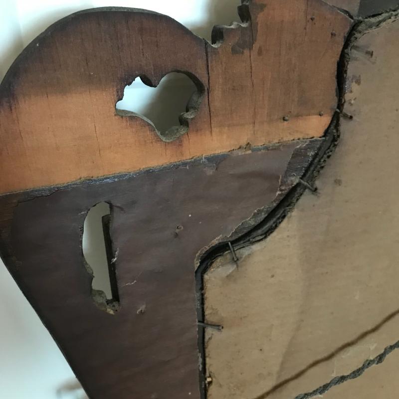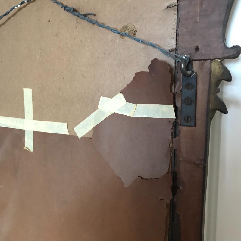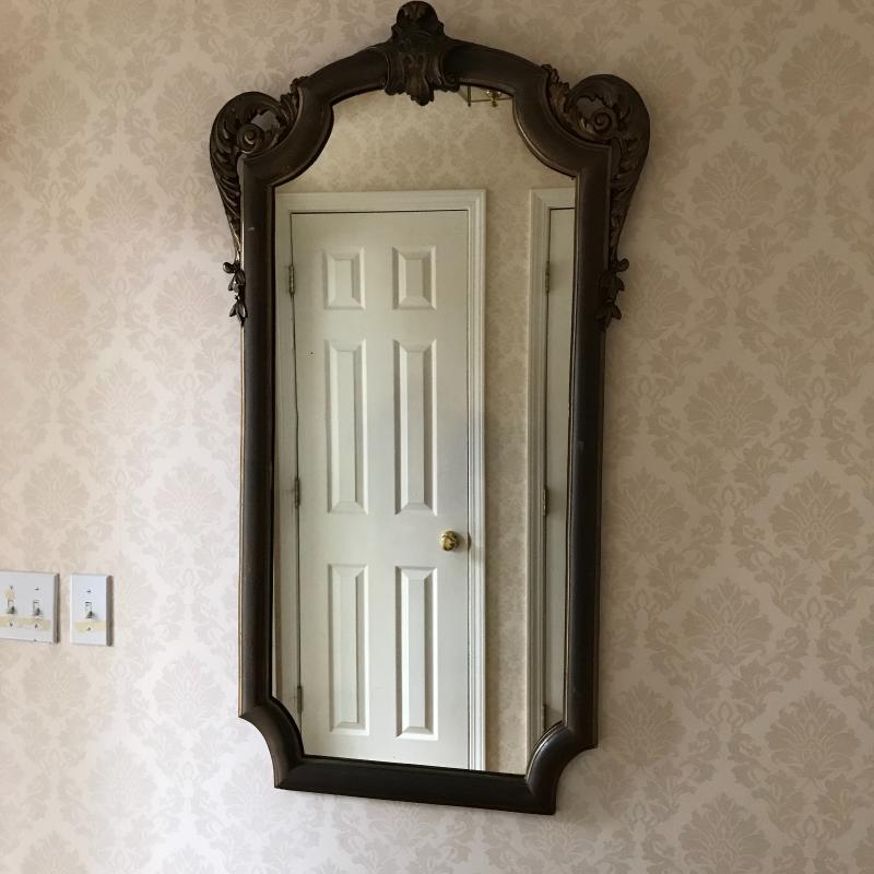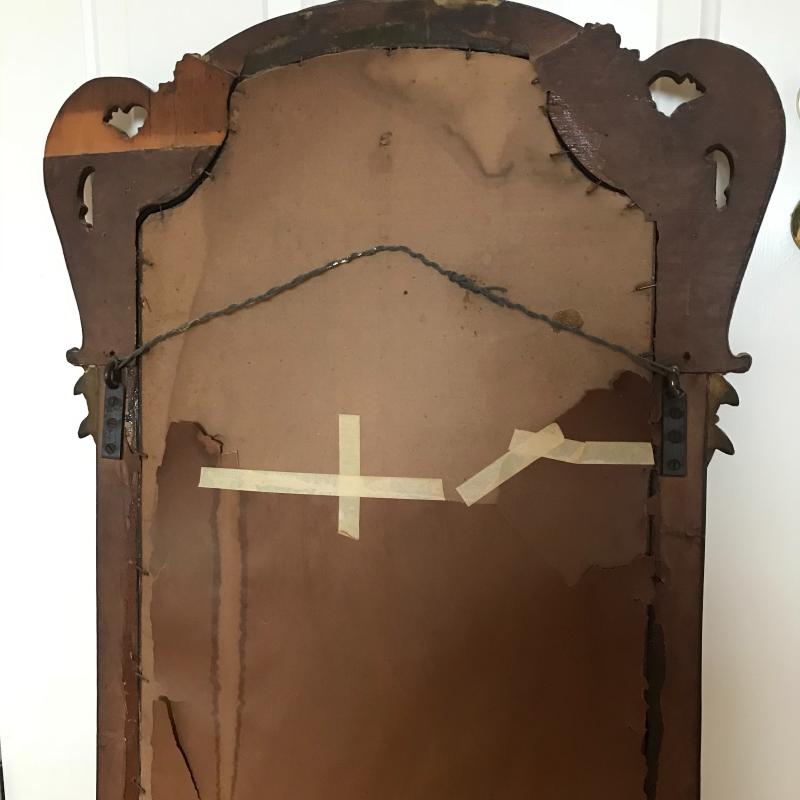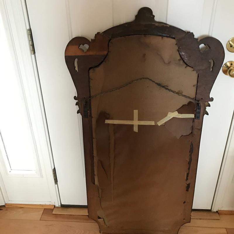 This beautiful antique mirror appears to be hand carved and is in good condition. Back paper has peeled off and been taped but the piece itself is structurally sound. 46” l x 26” w at widest and tallest points.