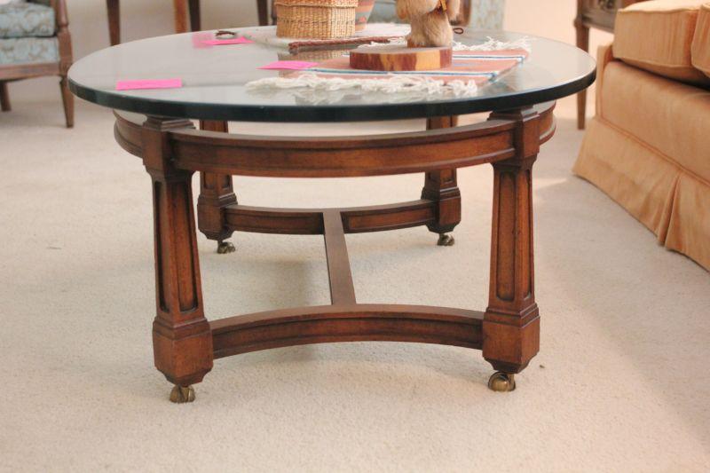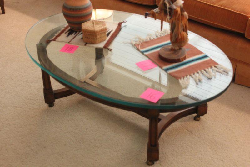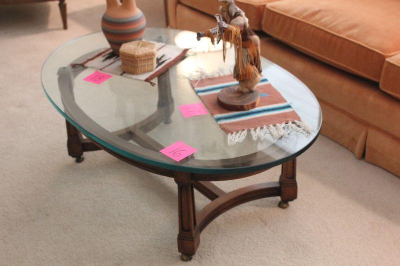 Lot 16 Oval Glass Top Vintage Wood Base Coffee Table