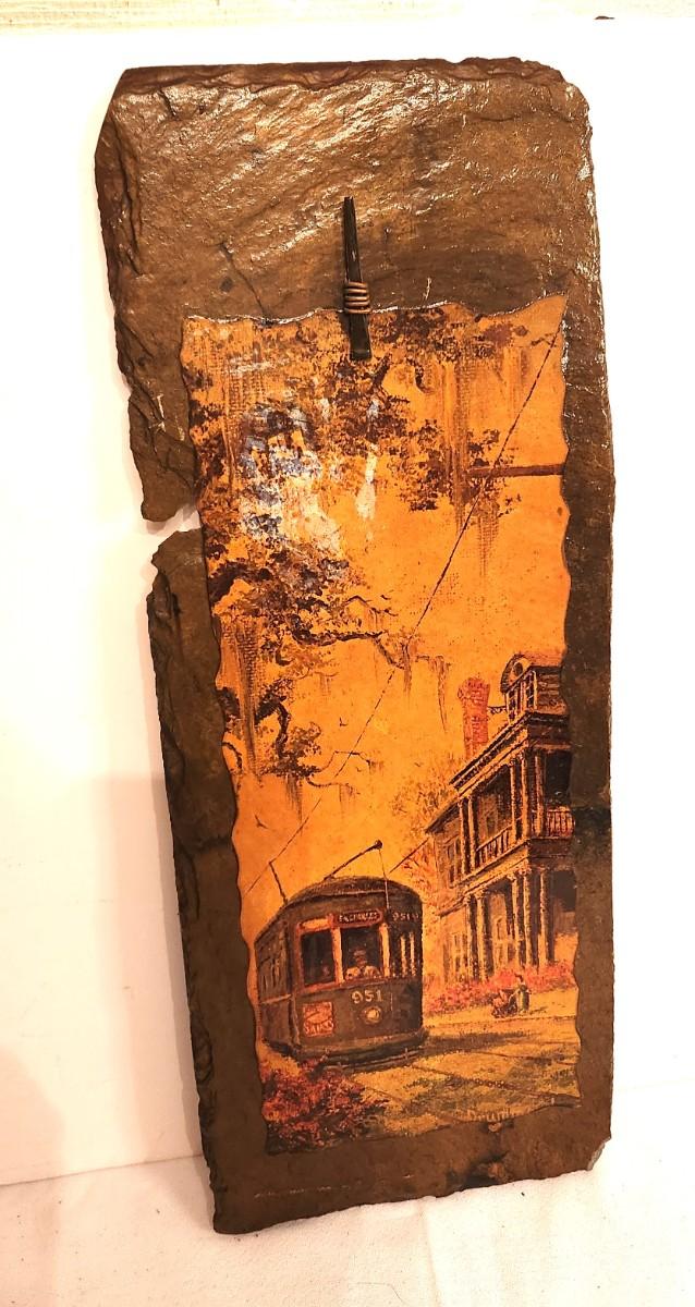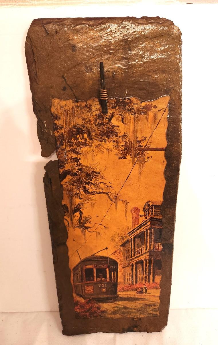 Lot #16 Painted New Orleans Streetcar Scene on Antique Roof Slate from St. Louis Cathedral - 1975