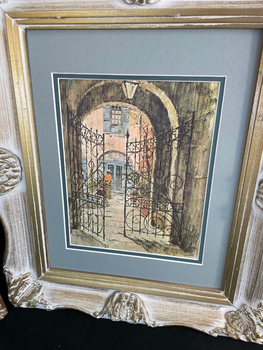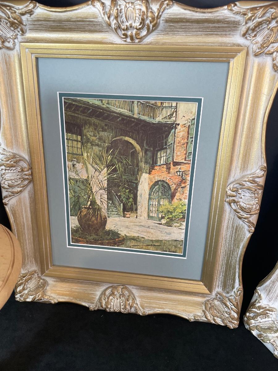 Pair of framed and matted prints in gold frames (16" x 19") and a small gold lamp
