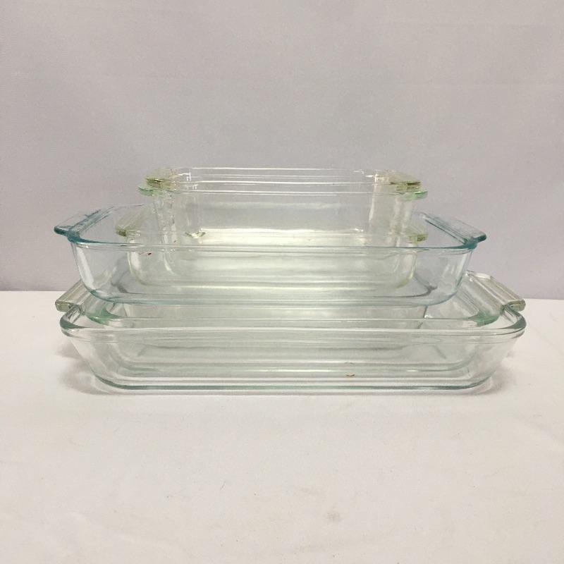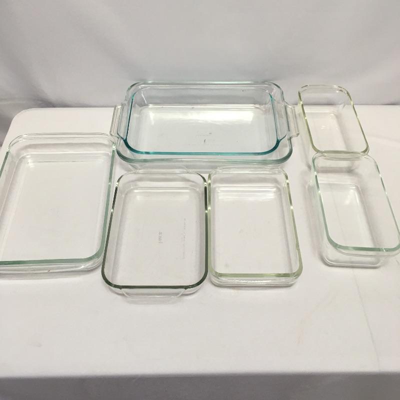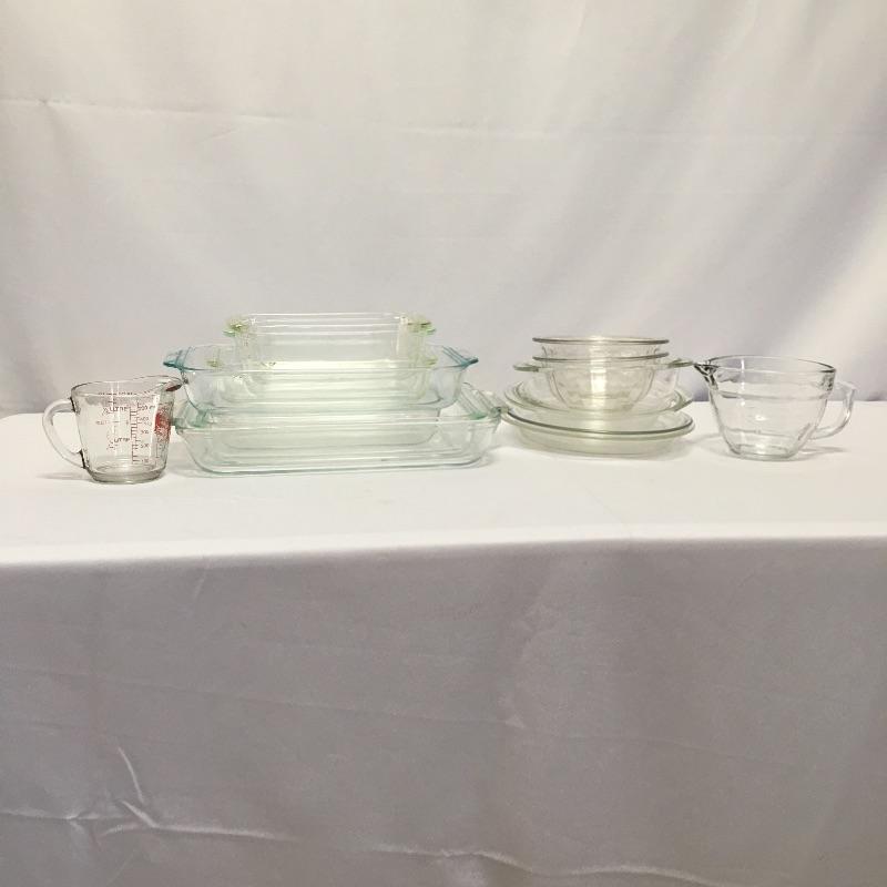 Pyrex and more includes Pyrex bowls, bread pans, pie plates, casserole dishes and two Anchor Hocking measuring cups. Be prepared for all your cooking and baking needs with these classic pieces. Largest dish measures 10.75” x 15” x 2.5”.