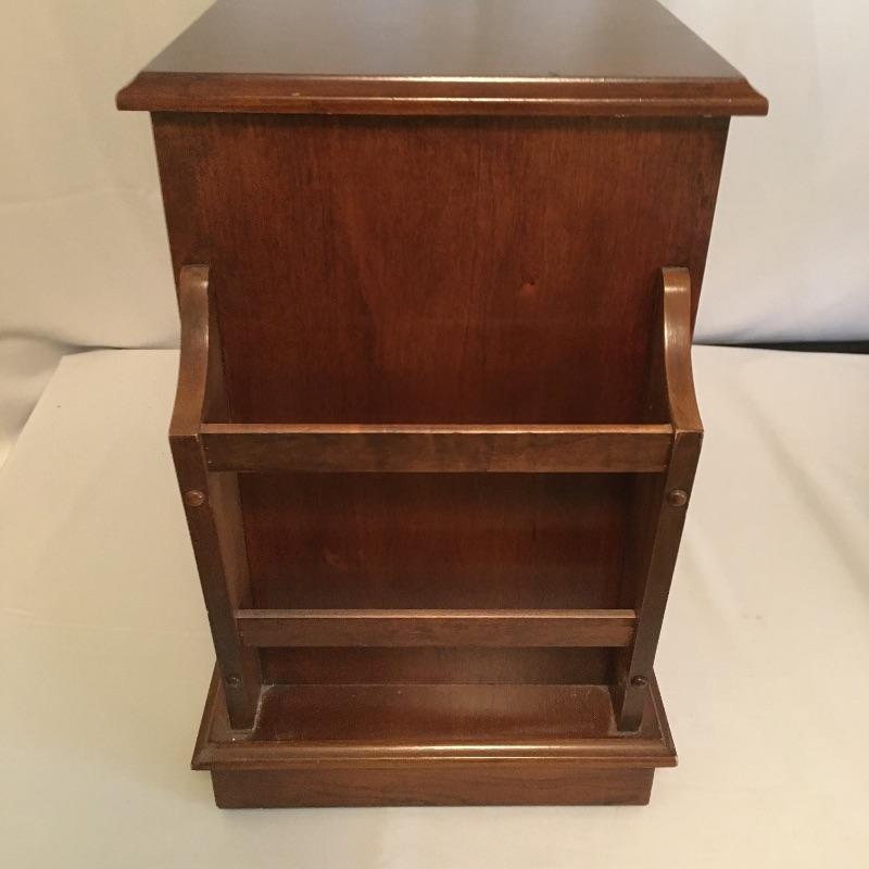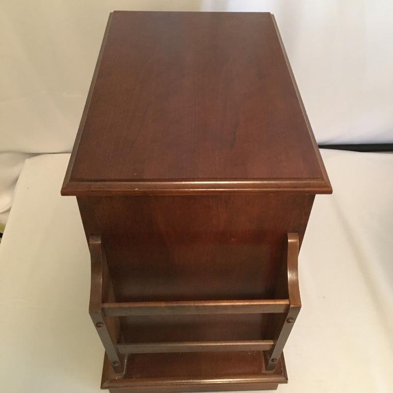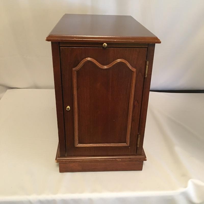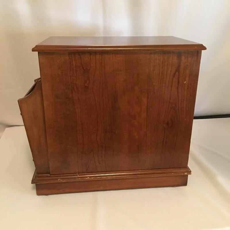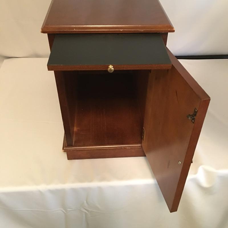 Super useful small side table with a cabinet and a pullout on its front and magazine holder on the back. In addition to this we have added a decorative metal lamp that gives the impression of aged oxidized metal that has three bulbs surrounding a middle bulb and an ivory lampshade.