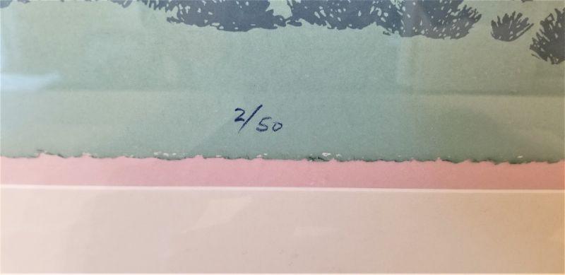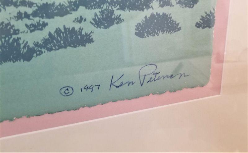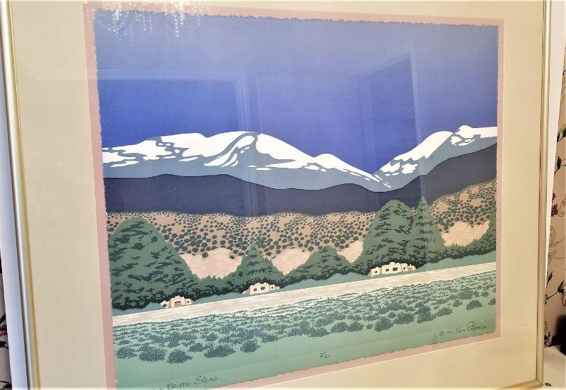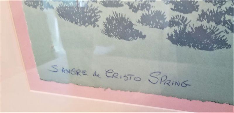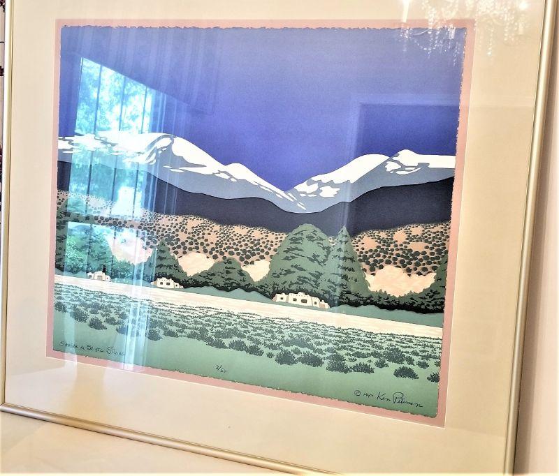 Nice large framed limited edition print, #2 of 50, done in 1997 by artist Ken Petermen. Entitled "Sangre de Christo Shrine" which means Shrine of the Stations of the Cross. Shrine is located in Costilla County, Colorado (built in 1990) and is a major tourist attraction there. Measures 32" x 36". Done in soft Southwest colors.