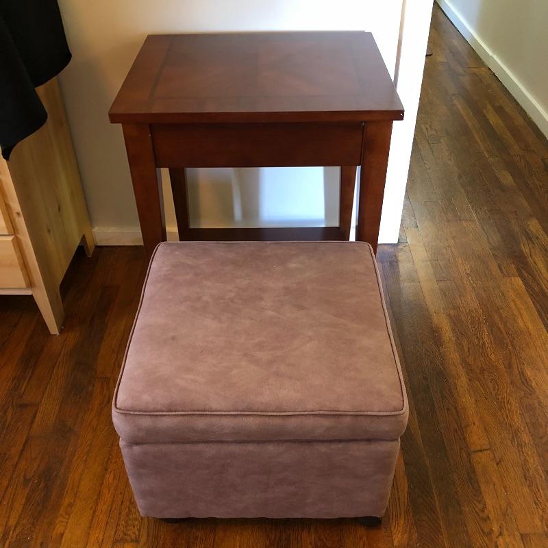 This lot comes with a beautiful wooden table (26” x 22” x 31”) and a grey storage cube (22” x 22” x 17”) made out of microfiber. Both of these are in great condition and are like new. They go very nicely together and would make a great addition to many rooms in your home! Local pickup only.