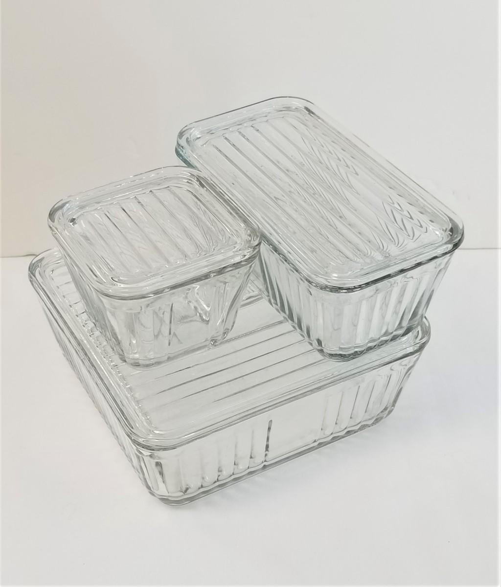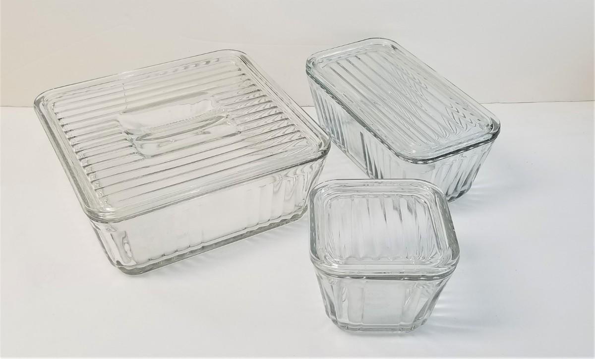Set of three Anchor Hocking Refrigerator set - reproduction - dishwasher and microwave safe. Good condition. Largest is 9" x 9", 3.25" tall, medium is 8.5" x 4.5", and small is 4.5" x 4.5".