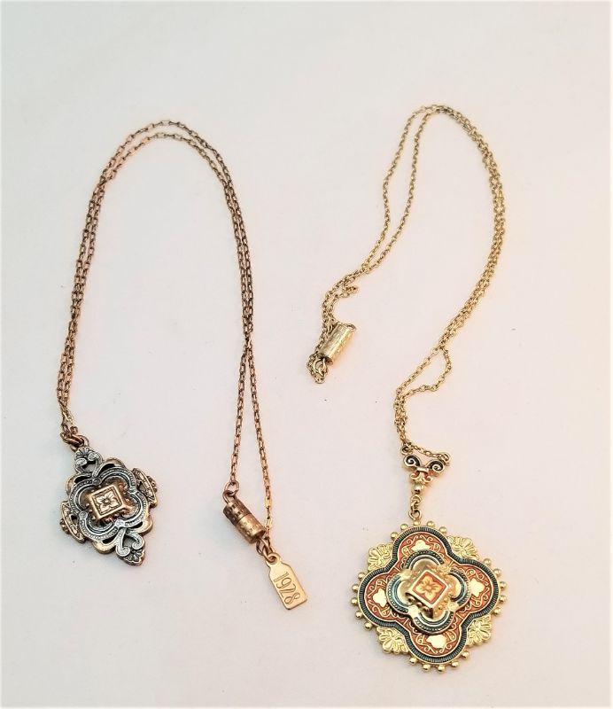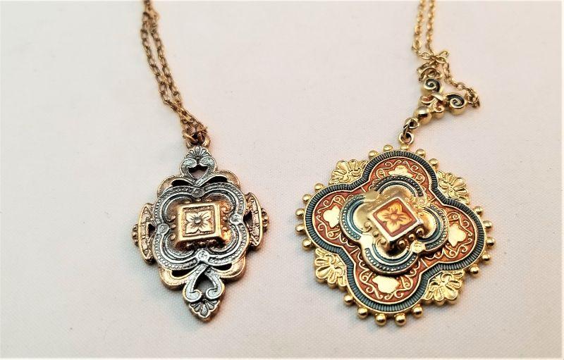 Two necklaces from the 1928 Jewelry Company - both have a Moorish, 1920's designs. Largest has a 17" chain, the more dainty necklace has a 16" chain. Excellent condition - very pretty.