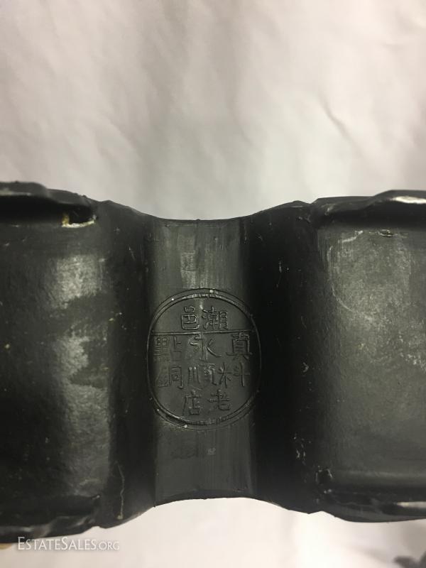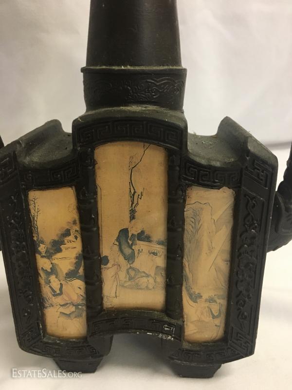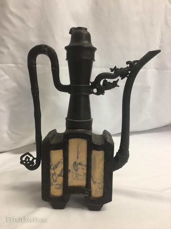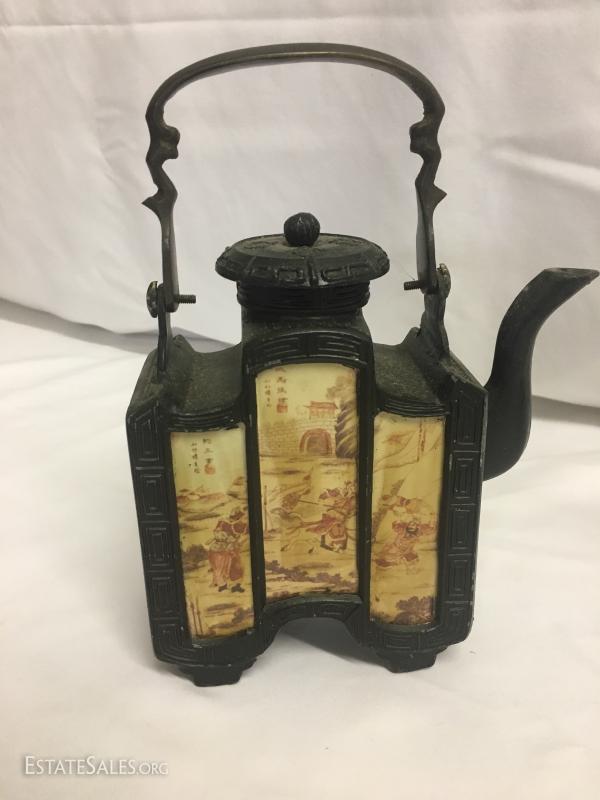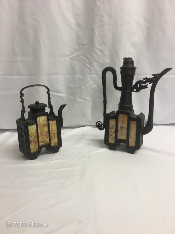 Two tea pots are for decorative use only. Tall one has a broken lid handle. Both have oriental details. Tall one stands 11" tall. This lot is available for shipping or local pick up in Waynesville, NC.
