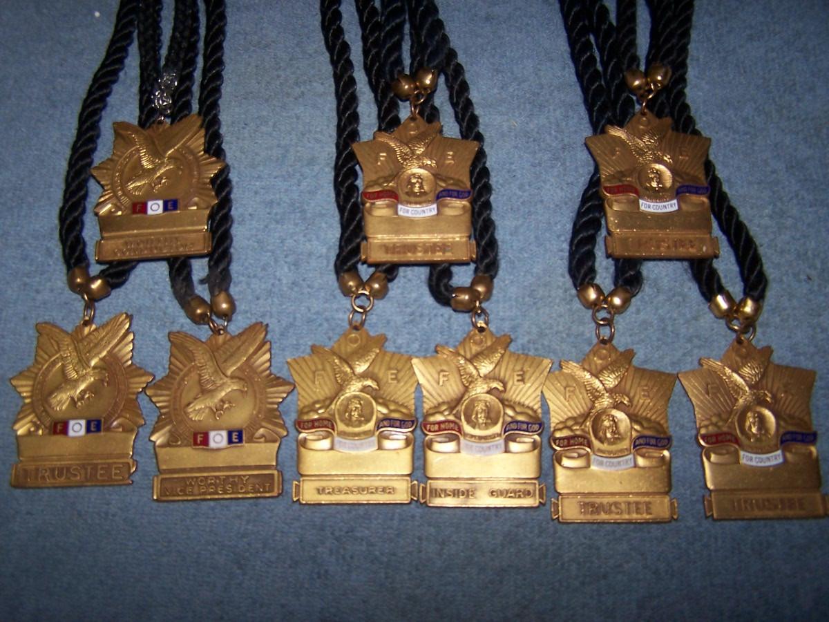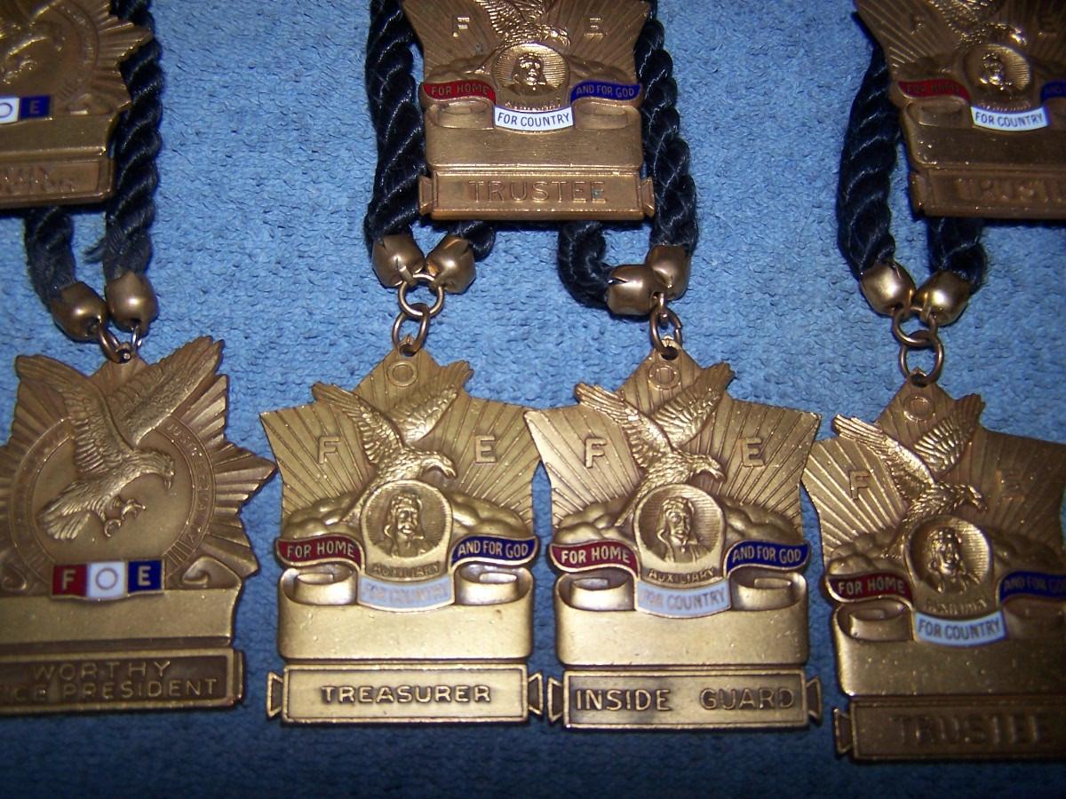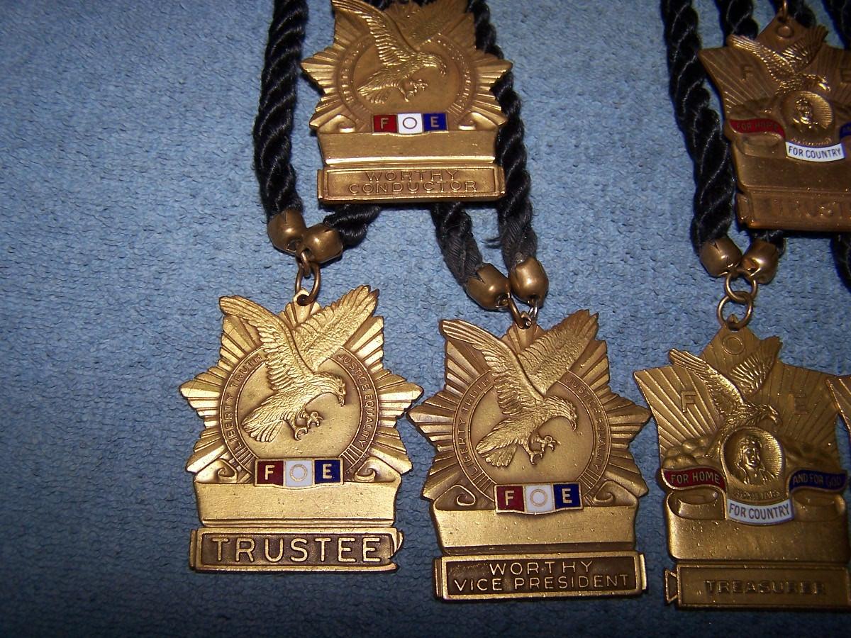GREAT VINTAGE 9 PCS OF FOE FRATERNAL ORDER OF EAGLE NECKLACE/BADGES... SEVERAL DUPLICATES...
