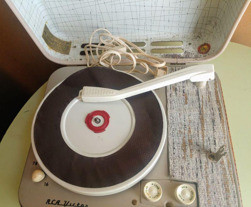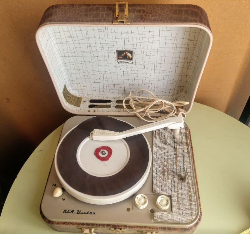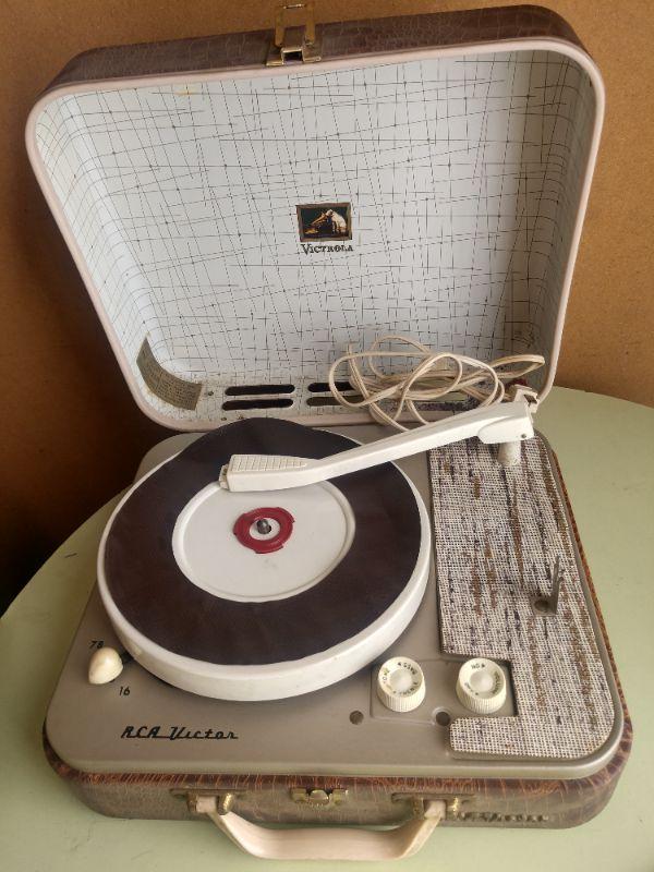 Vintage RCA Victor Victrola Suitcase Record Player model 1-EMP-2kk. This is in great visual condition.. it even has the original cord.... the motor kicks on when it is turned on. It appears to need something to make the record player round spin.