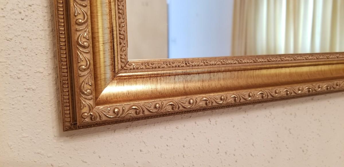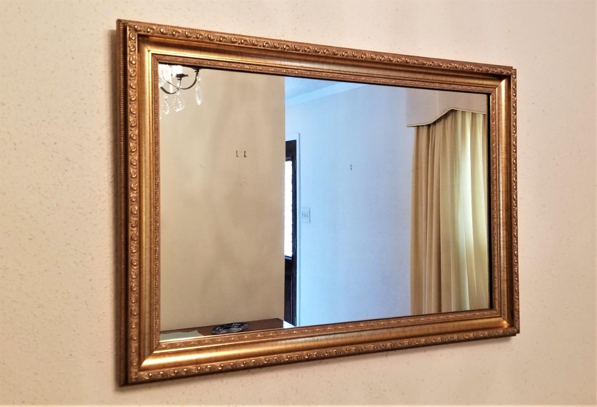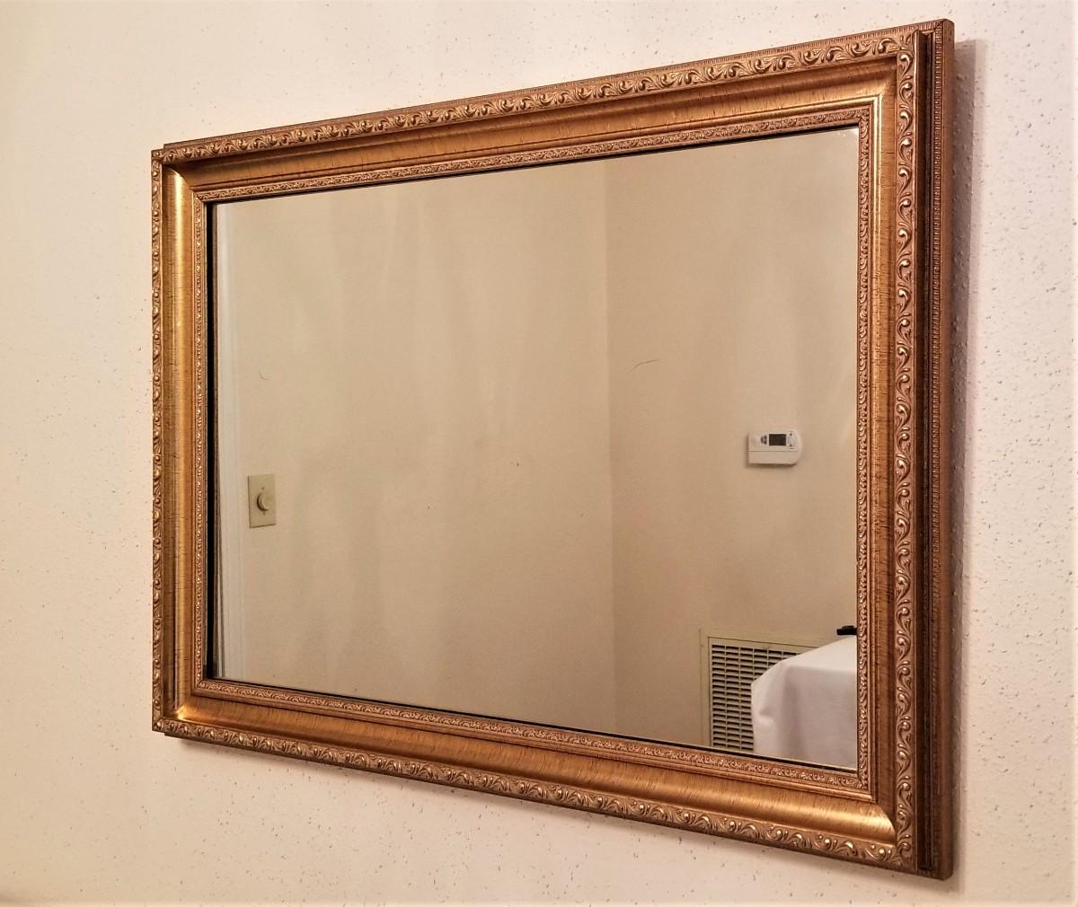 Nice vintage wall mirror (heavy) with gold gilded frame. Very pretty. Measures 26" wide and 19" tall.