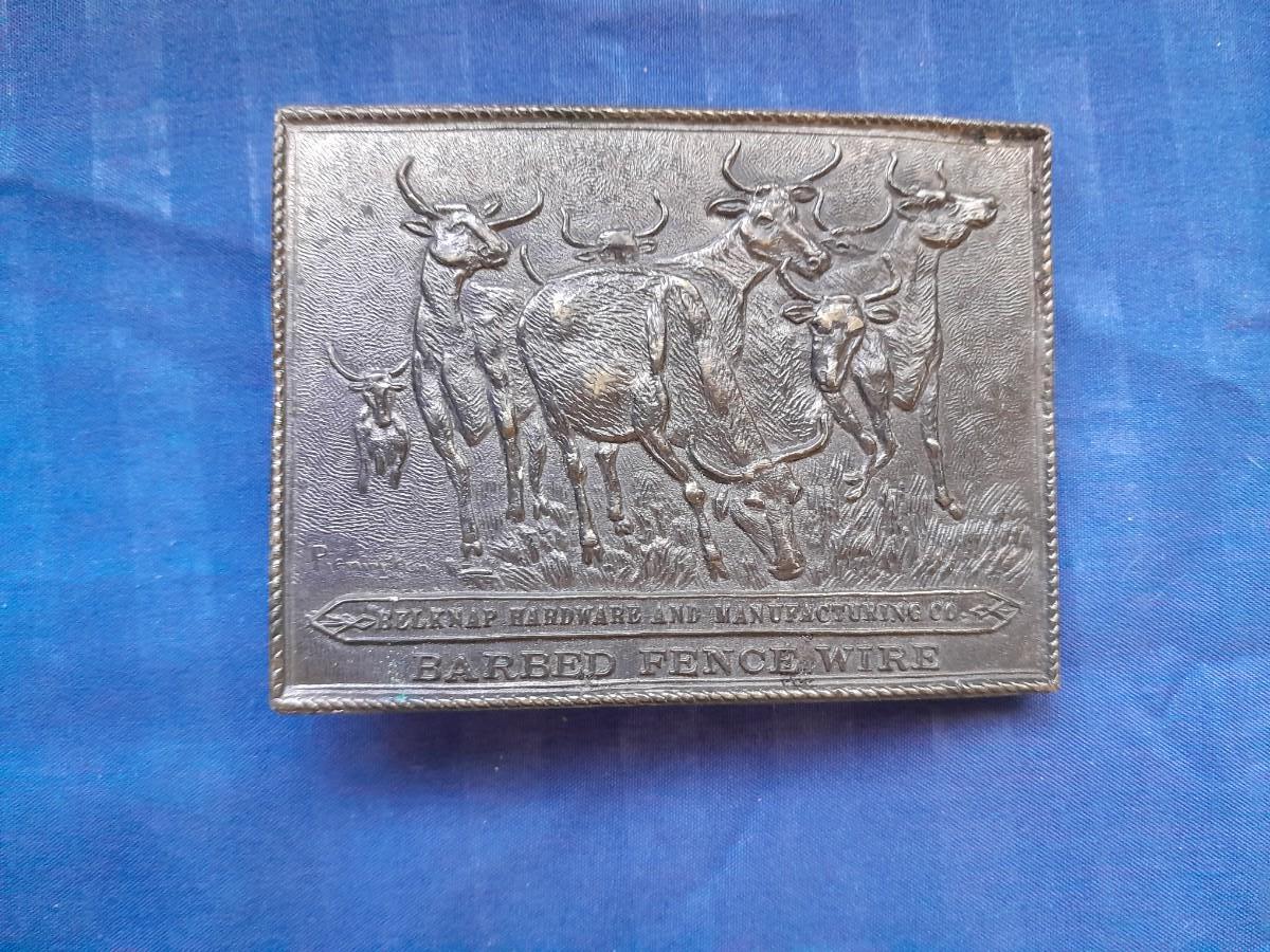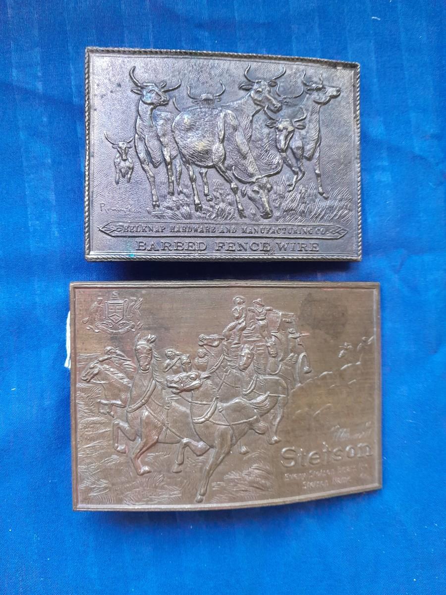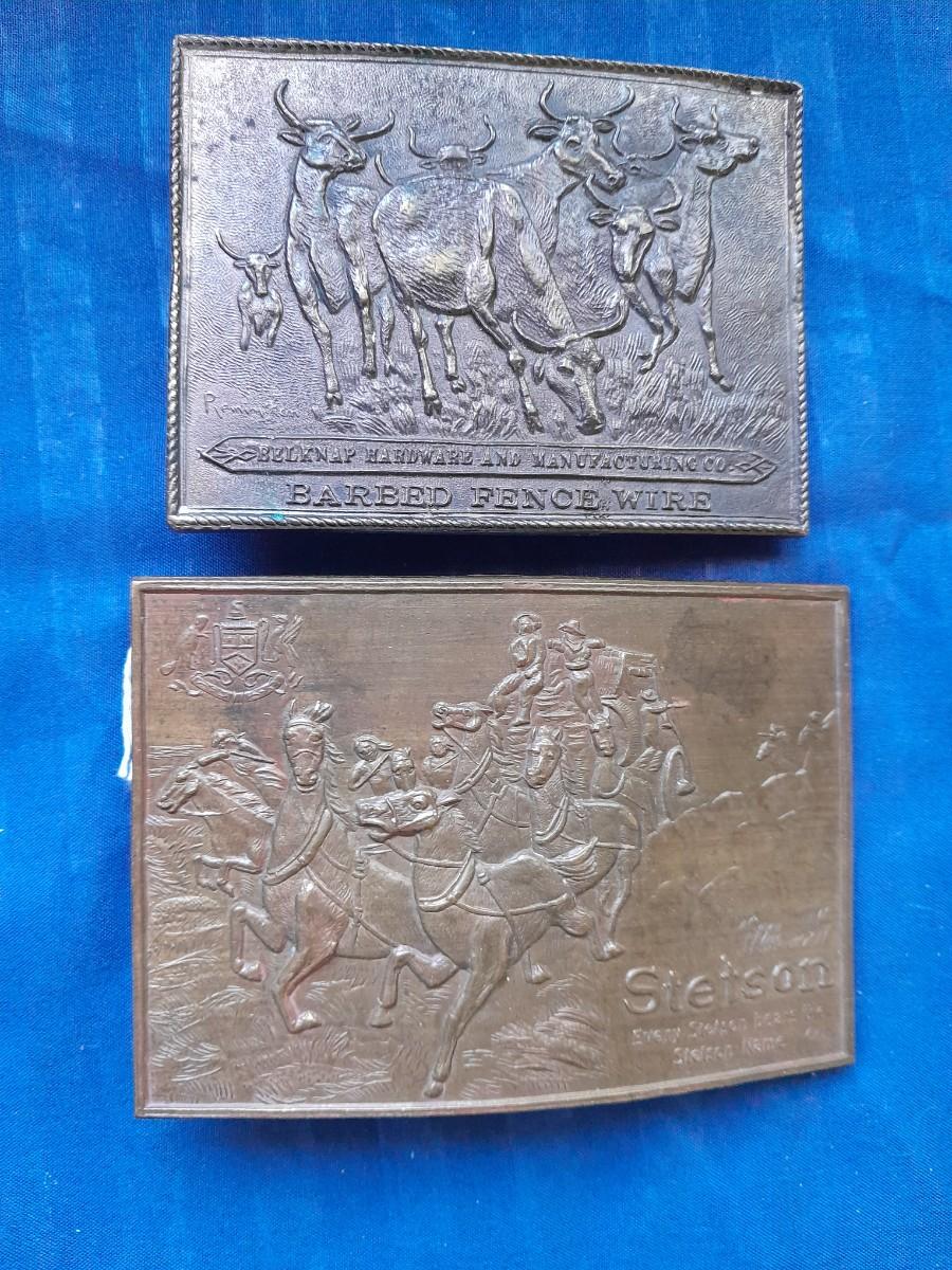 WESTERN COWBOY BELT BUCKLES BRASS STETSON & BARRED FENCE WIRE