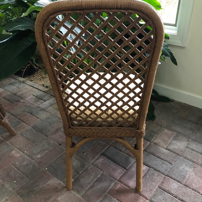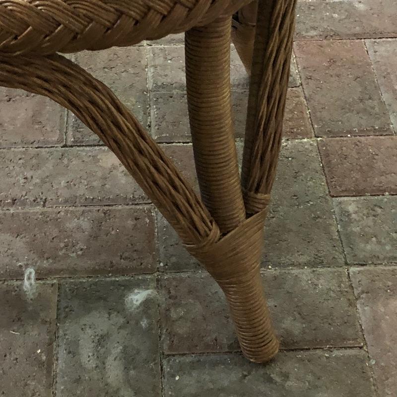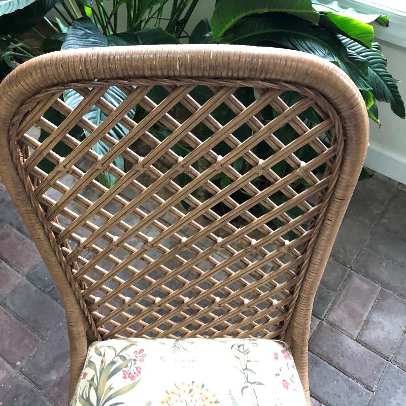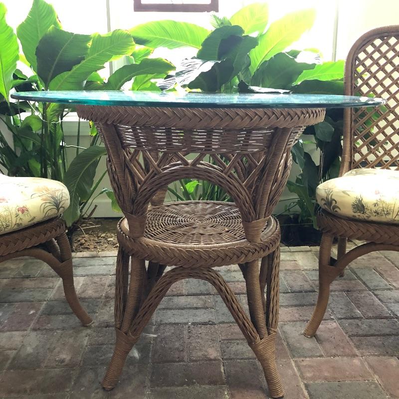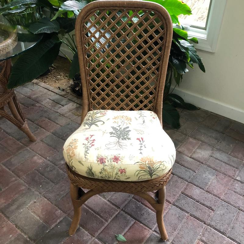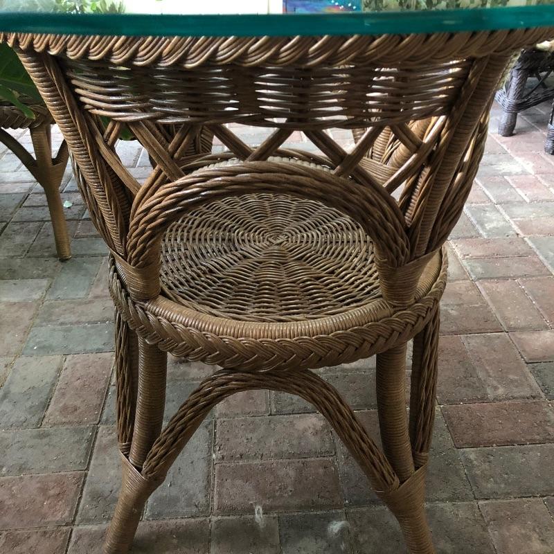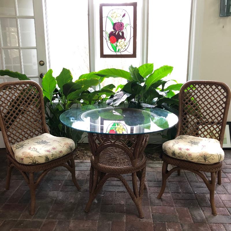 Lovely wicker set includes round table with glass top and two matching chairs with seat cushions. The wicker is the same style as lots 5 and 12 and all the cushions compliment the separate patterns. Both chairs have a couple of blemishes see photos.