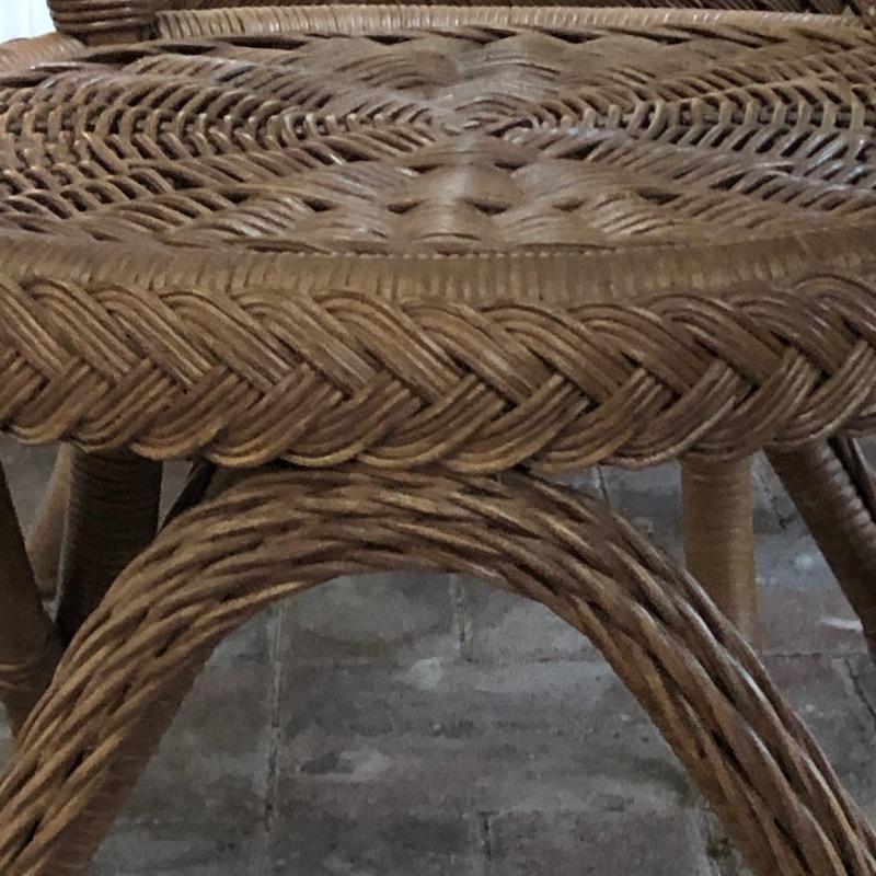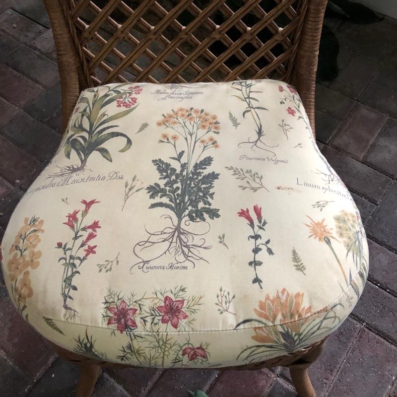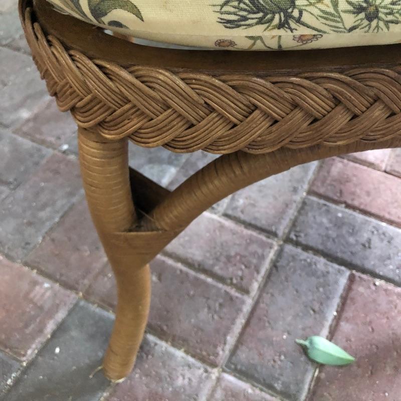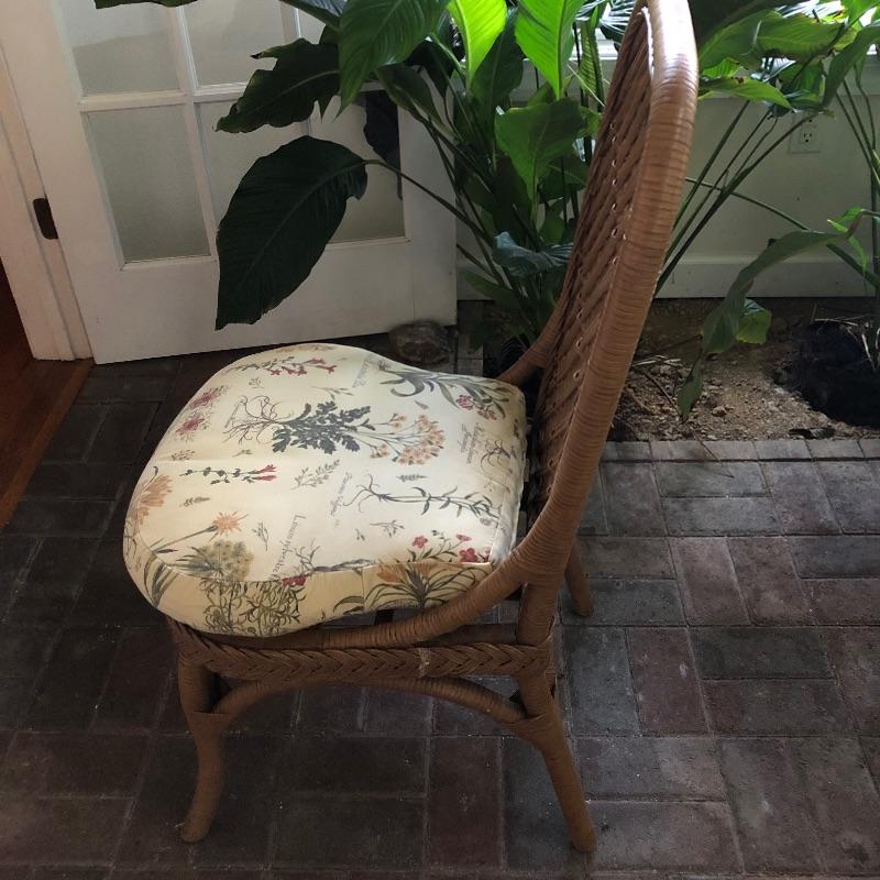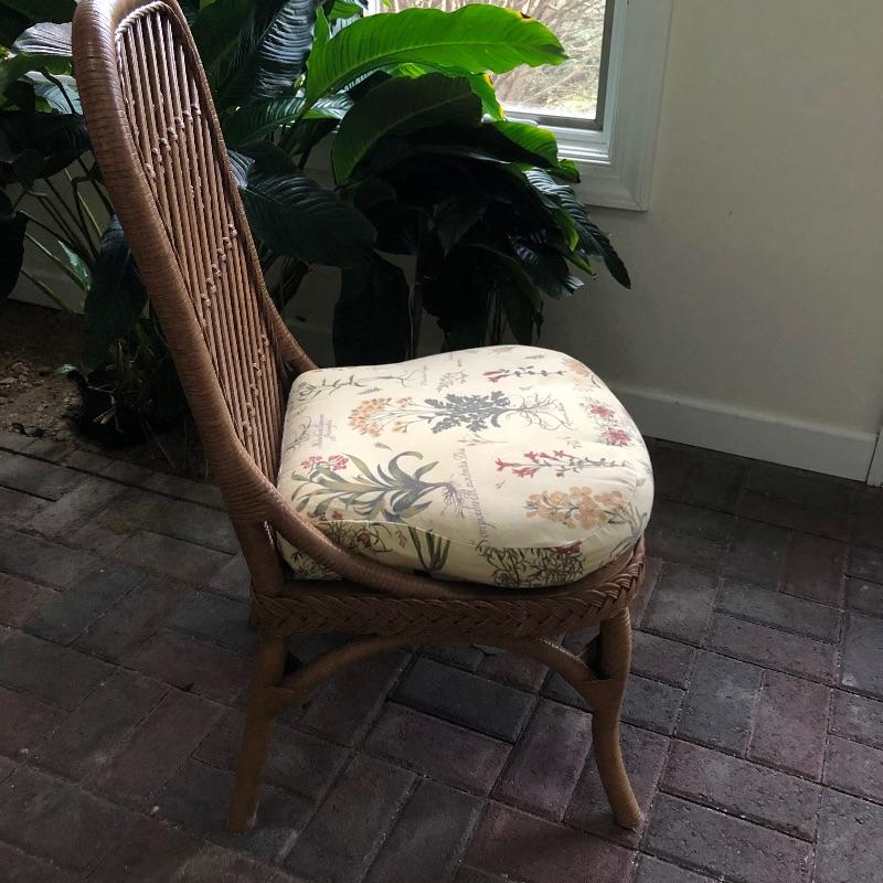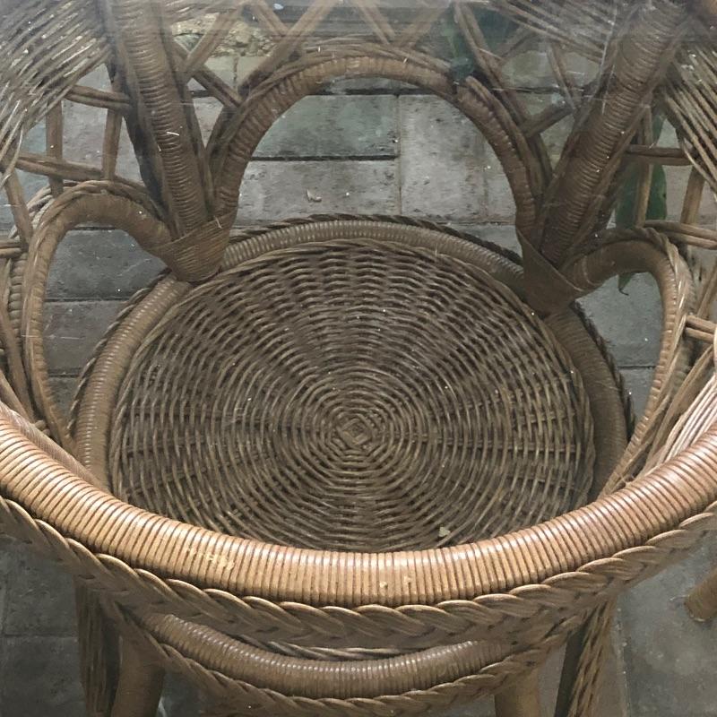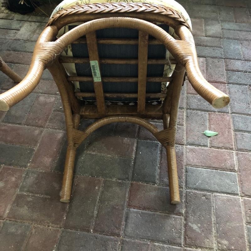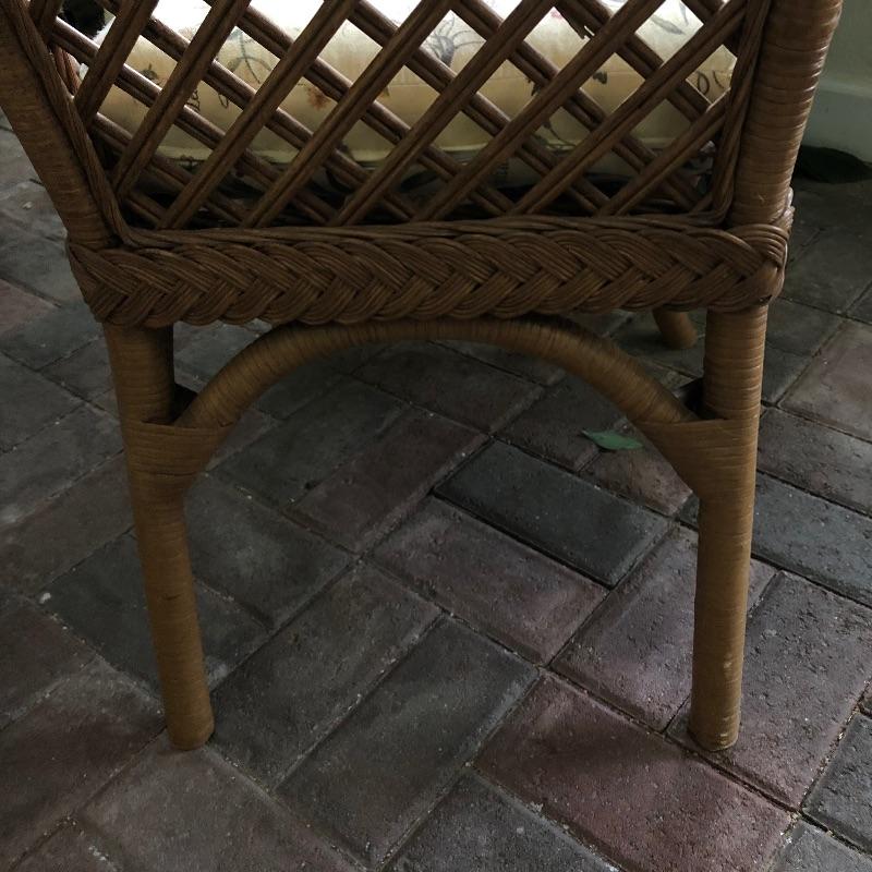 Lovely wicker set includes round table with glass top and two matching chairs with seat cushions. The wicker is the same style as lots 5 and 12 and all the cushions compliment the separate patterns. Both chairs have a couple of blemishes see photos.