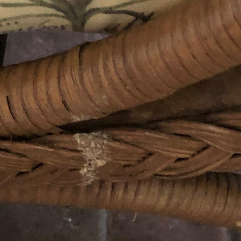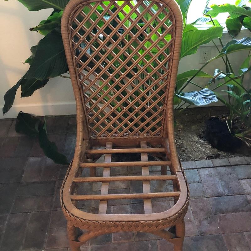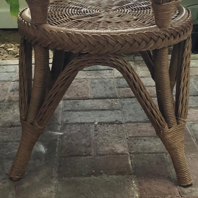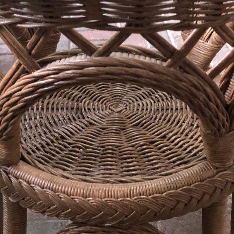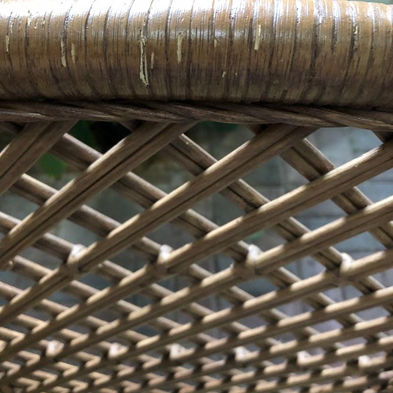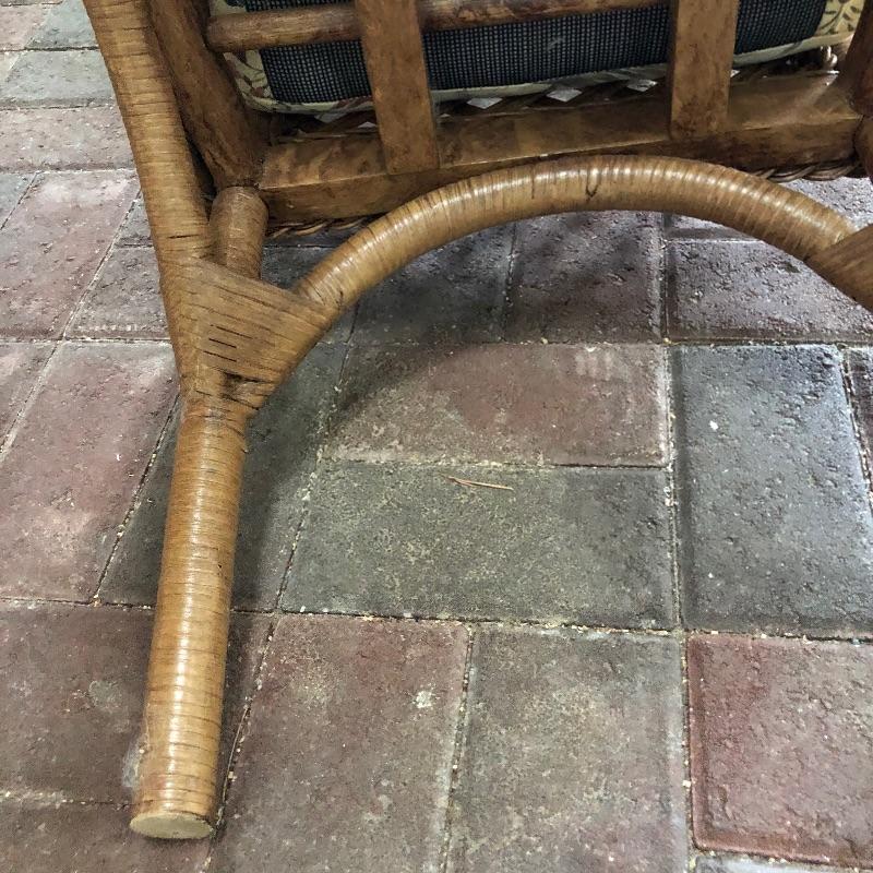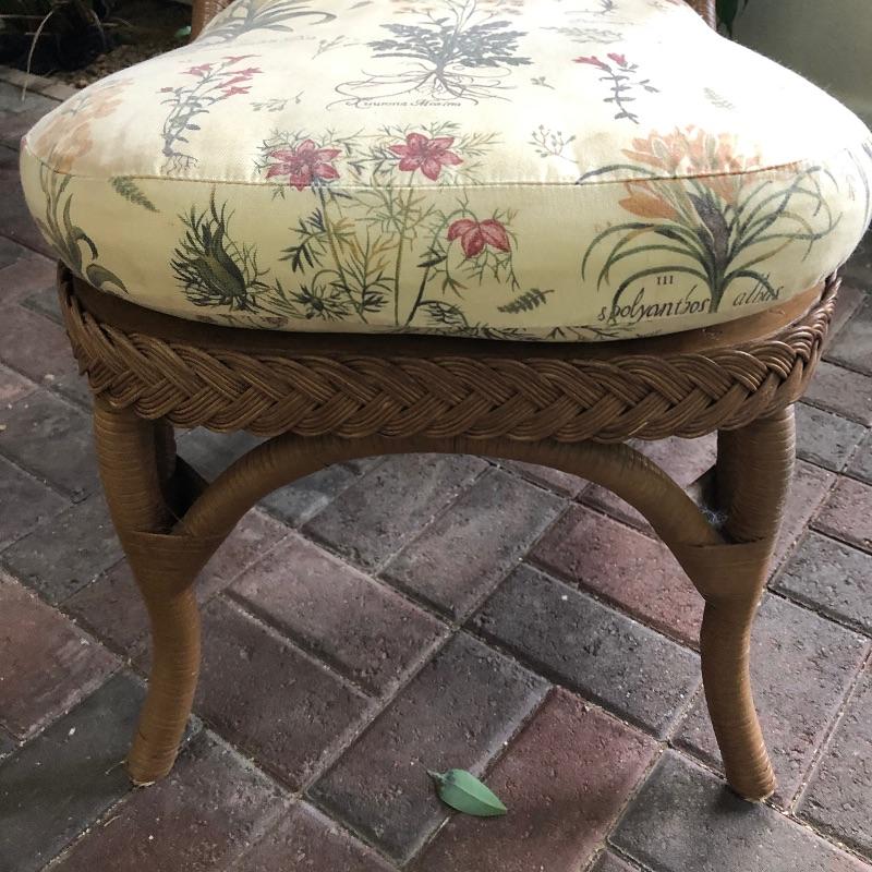Lovely wicker set includes round table with glass top and two matching chairs with seat cushions. The wicker is the same style as lots 5 and 12 and all the cushions compliment the separate patterns. Both chairs have a couple of blemishes see photos.