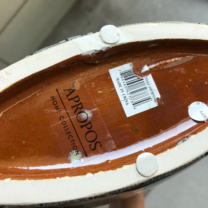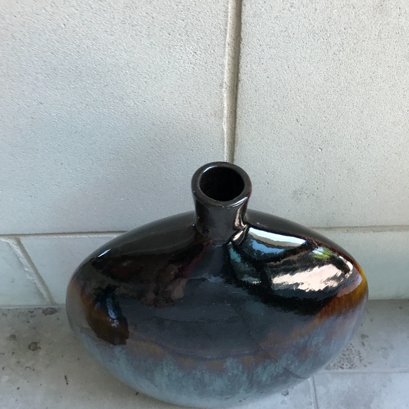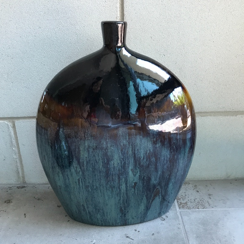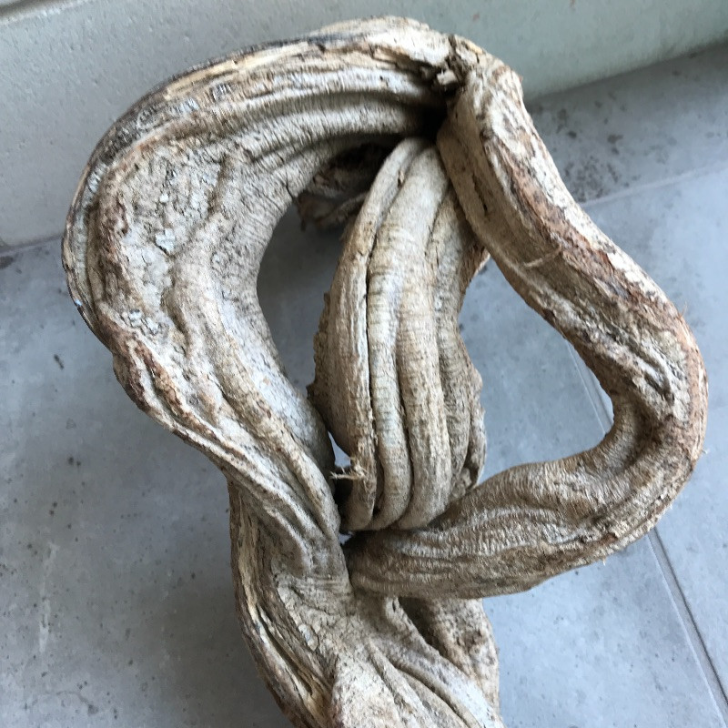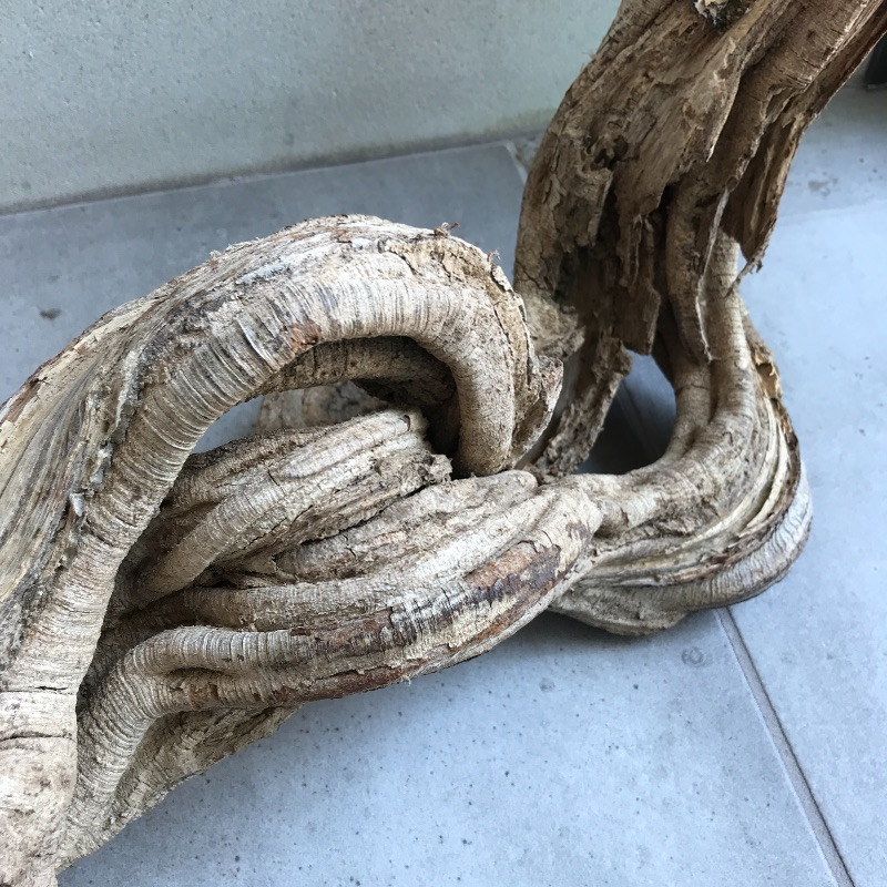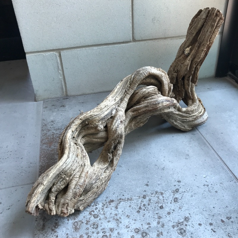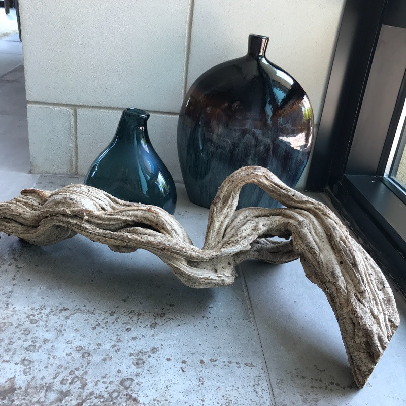 The drift-wood could be a root or vine that was dried out and now makes a stunning accent piece. This home decor collection also includes two thin necked vases, one is glass, the other is ceramic. The larger vase measures 23” long x 11” (tallest height when on its side). The blown glass vase is a nice shade of blue and Ceramic vase measures 14” tall.