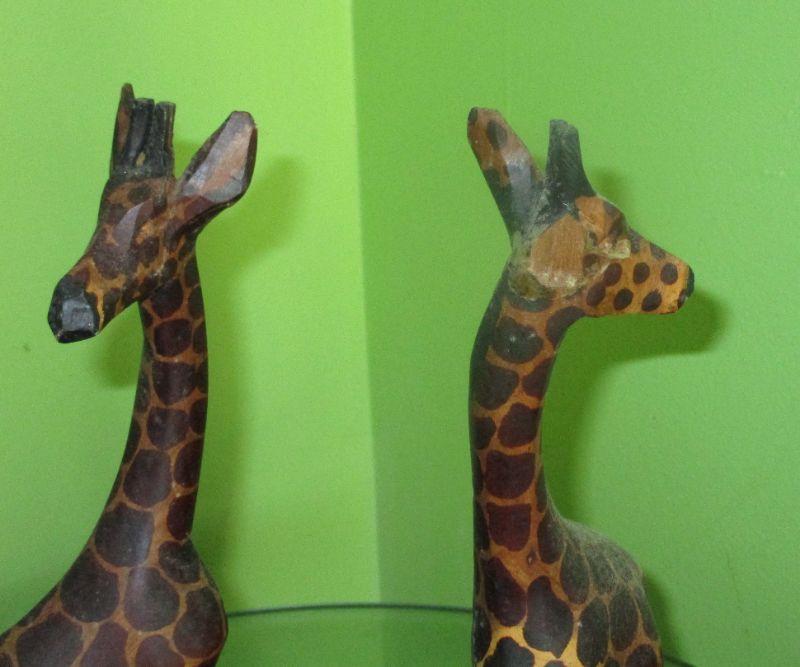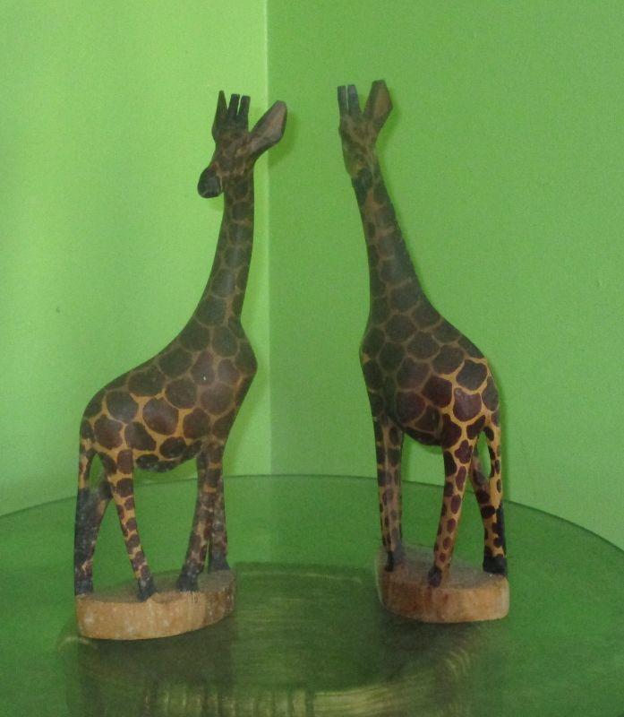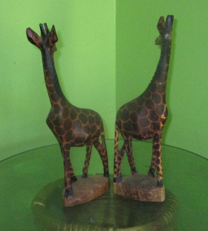 One giraffe has an ear missing, but if you set them in your display just right, you'll never notice. Think of it as his battle scar from fending off predators in the wild before you rescued him. They are about 12.5" tall each.