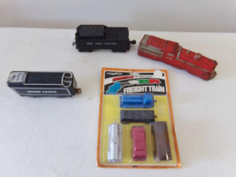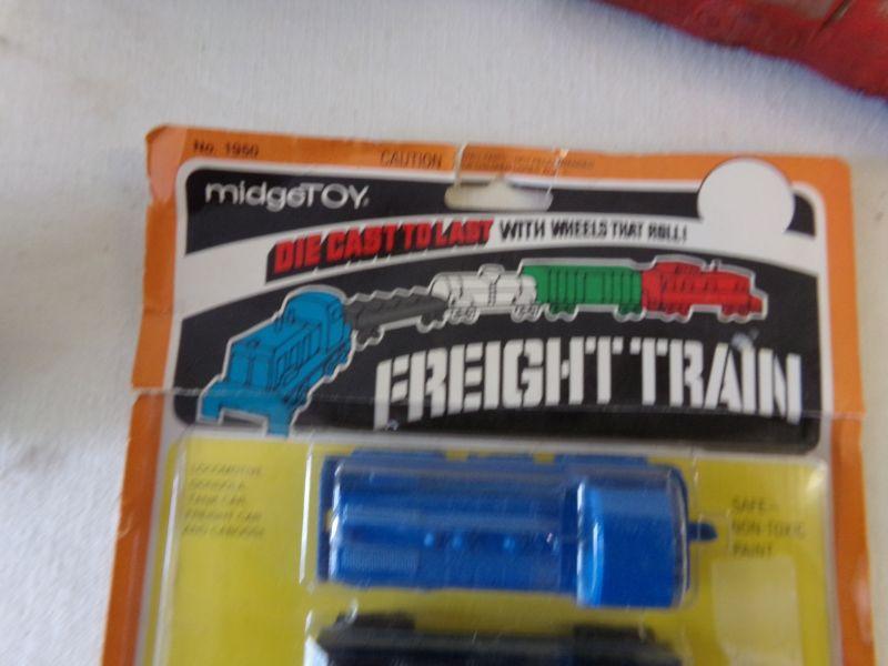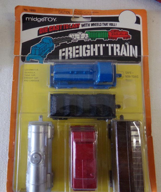 PIC 4 - MIDGE TOY FREIGHT TRAIN IN ORIGINAL PACKAGE WHICH SHOWS SOME WEAR WITH FOLD AND FEW TEARS. DIE-CAST WITH WHEELS THAT ROLL. LOCOMOTIVE, GONDOLA, TANK & FREIGHT CARS AND CABOOSE
