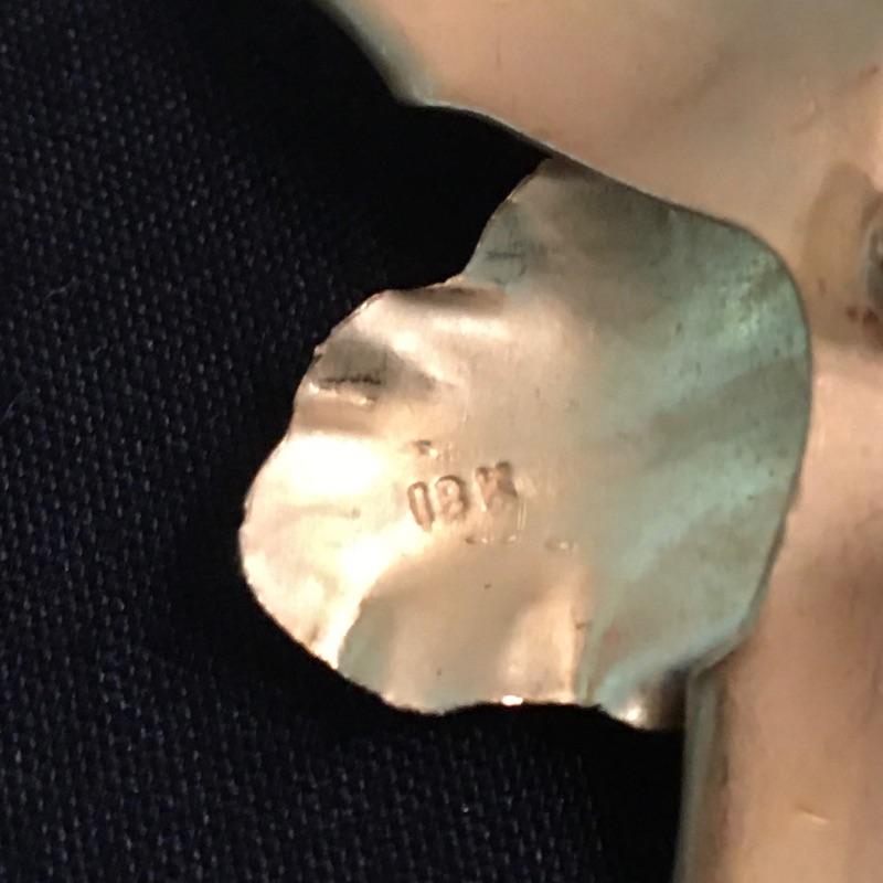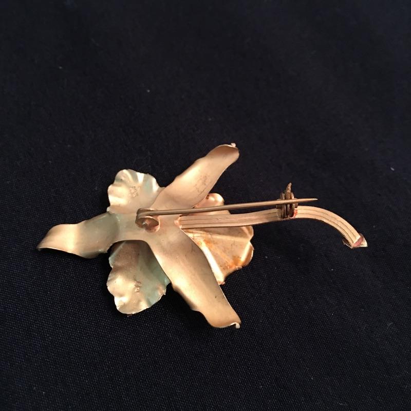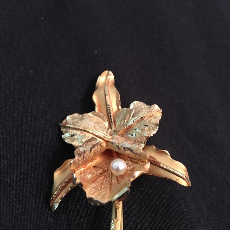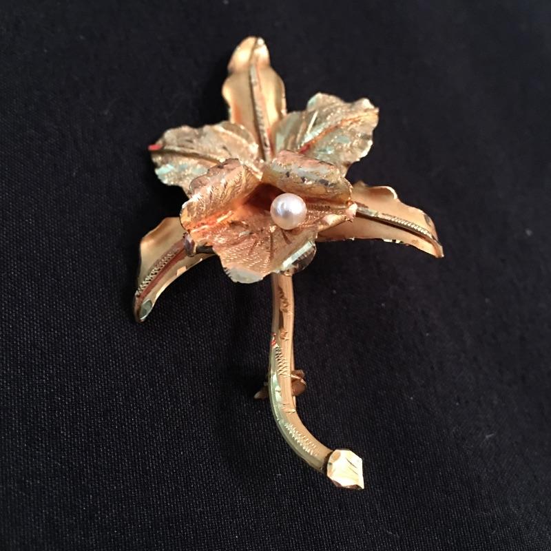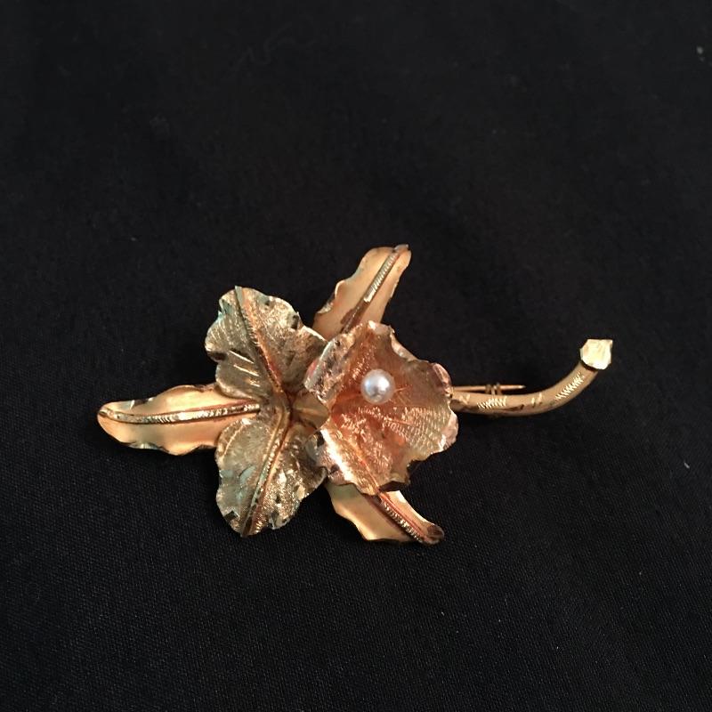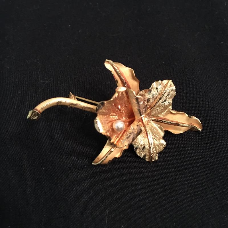 This 18K broach is in a floral design with what appears to be a pearl in the center of the flower. Be ready for a night on the town with this beautiful piece of jewelry.