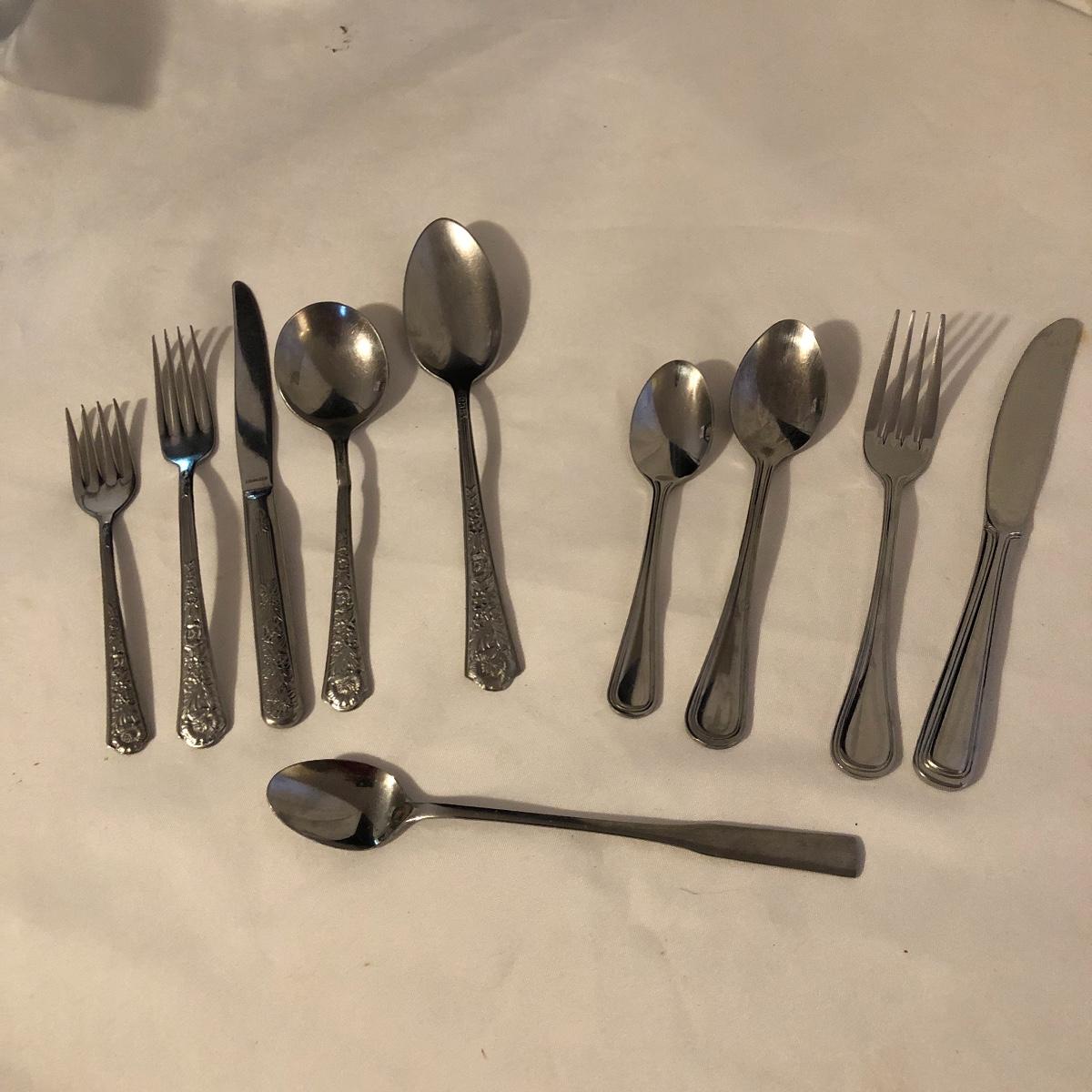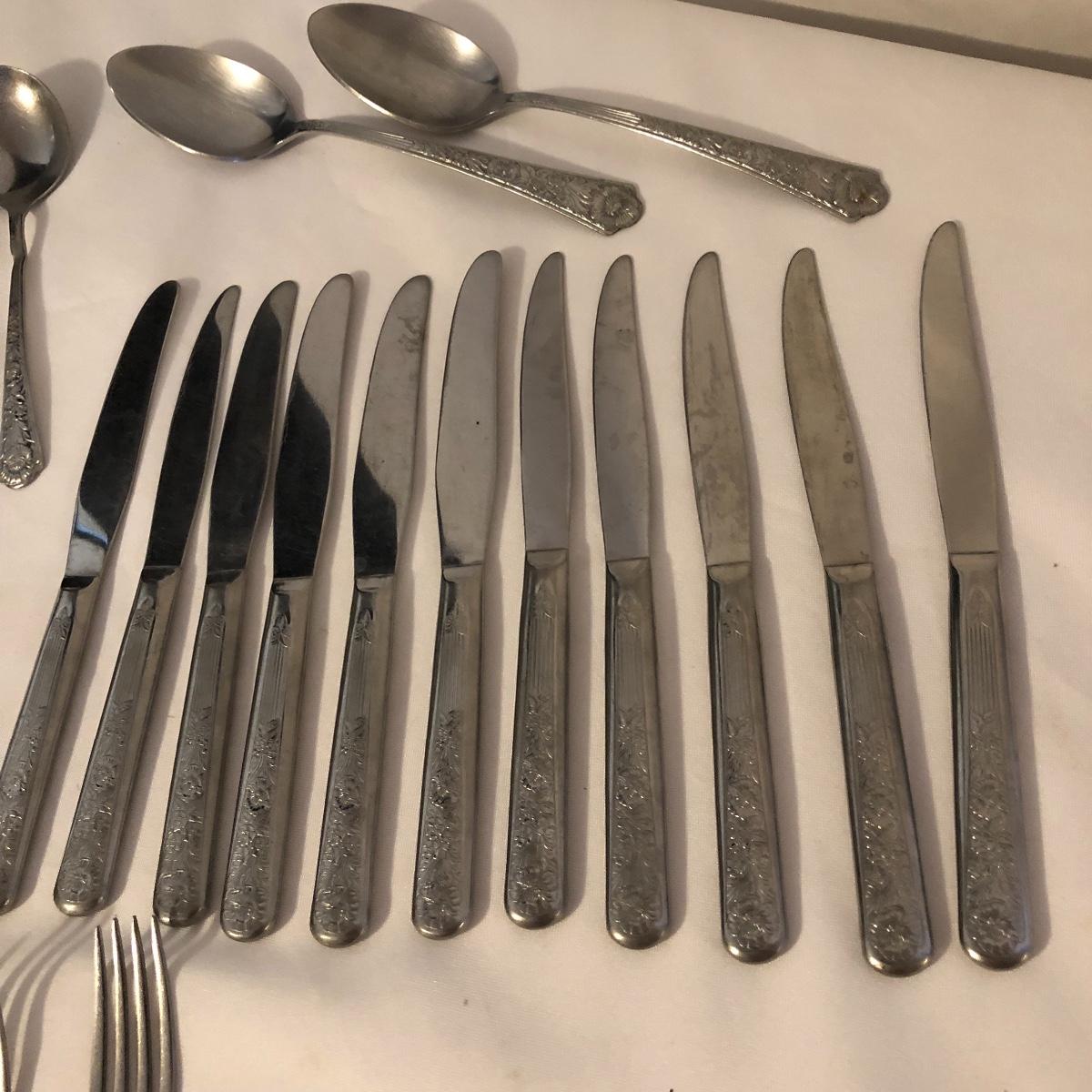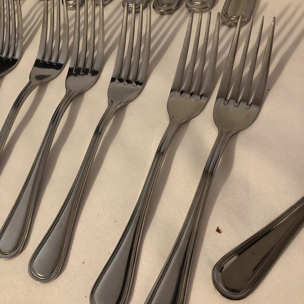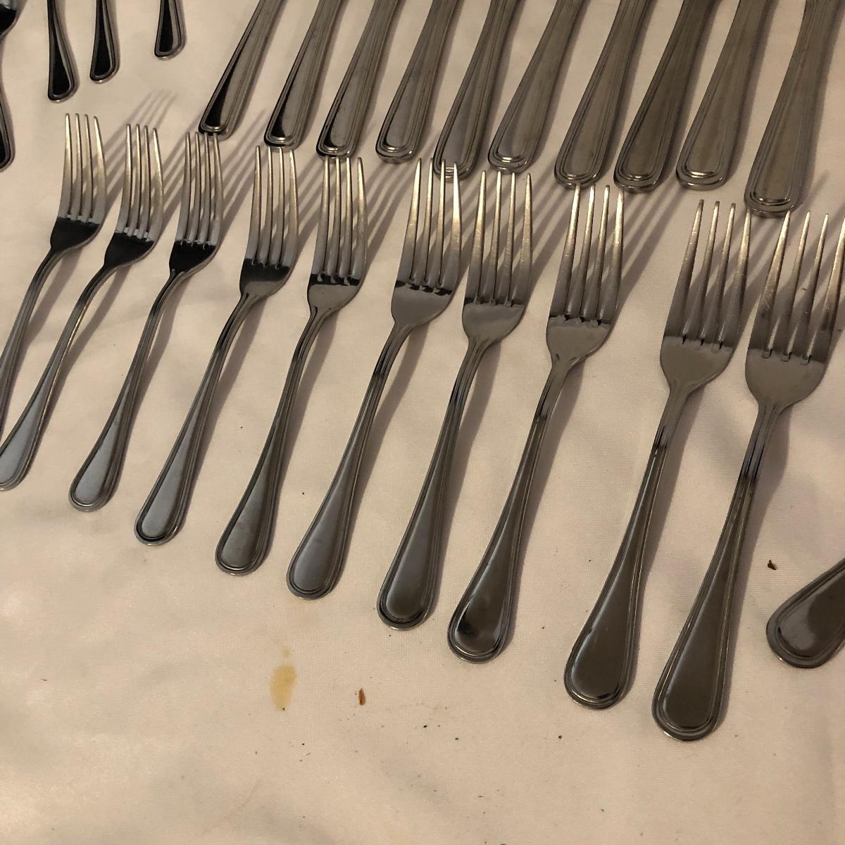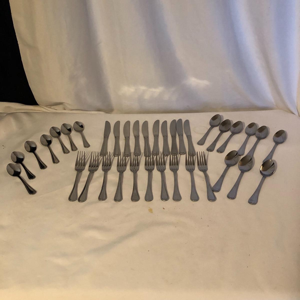 This lot includes two sets of flatware: Debut Stainless and Update Stainless Flatware. The Debut flatware includes eleven knives, six dinner and salad forks, five soup spoons and two serving spoons. The Update Stainless Flatware includes (and is pictured last except the first picture shows two place settings together) : ten dinner forks, ten knives, nine soup spoons and seven spoons. Additionally, there are eleven tea spoons. S