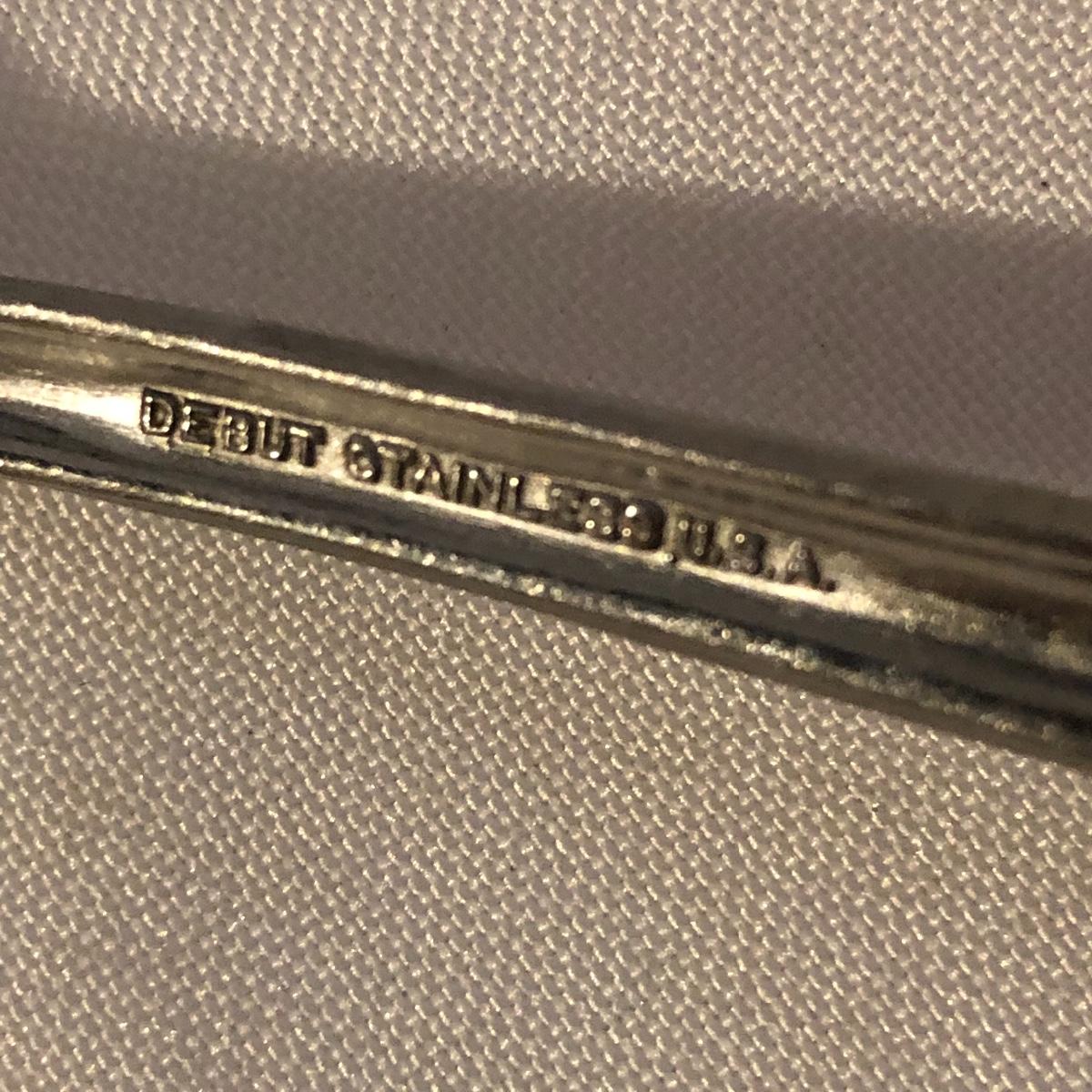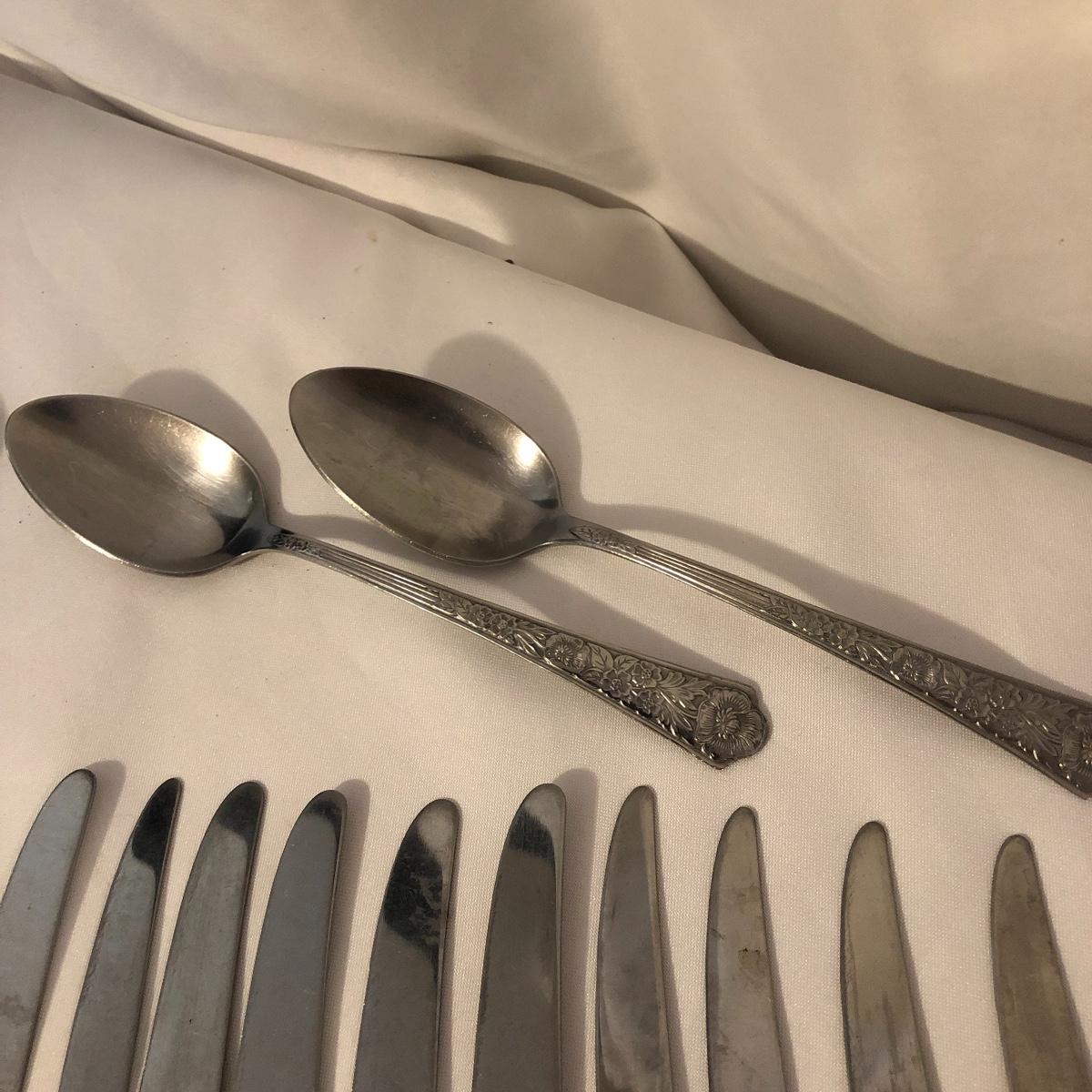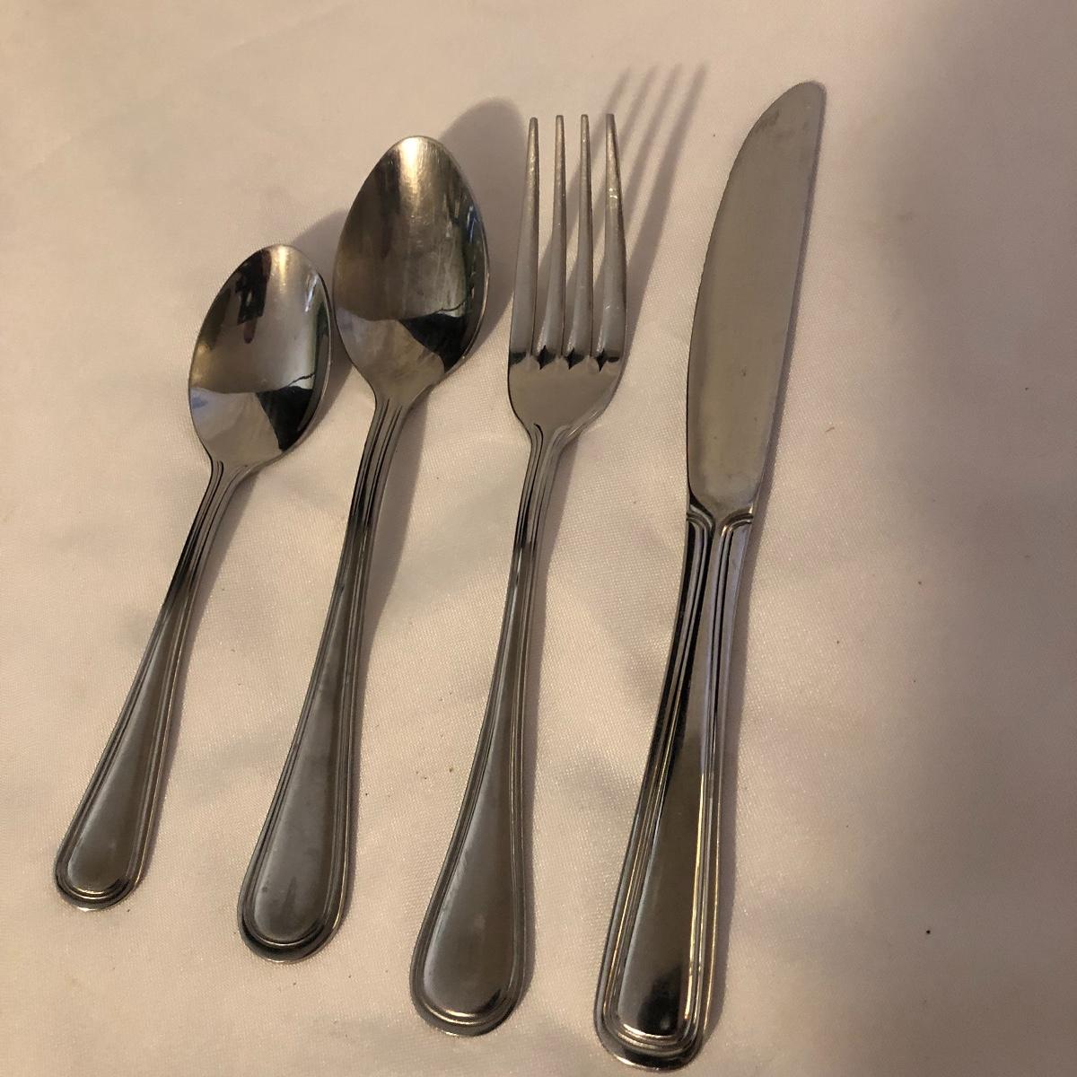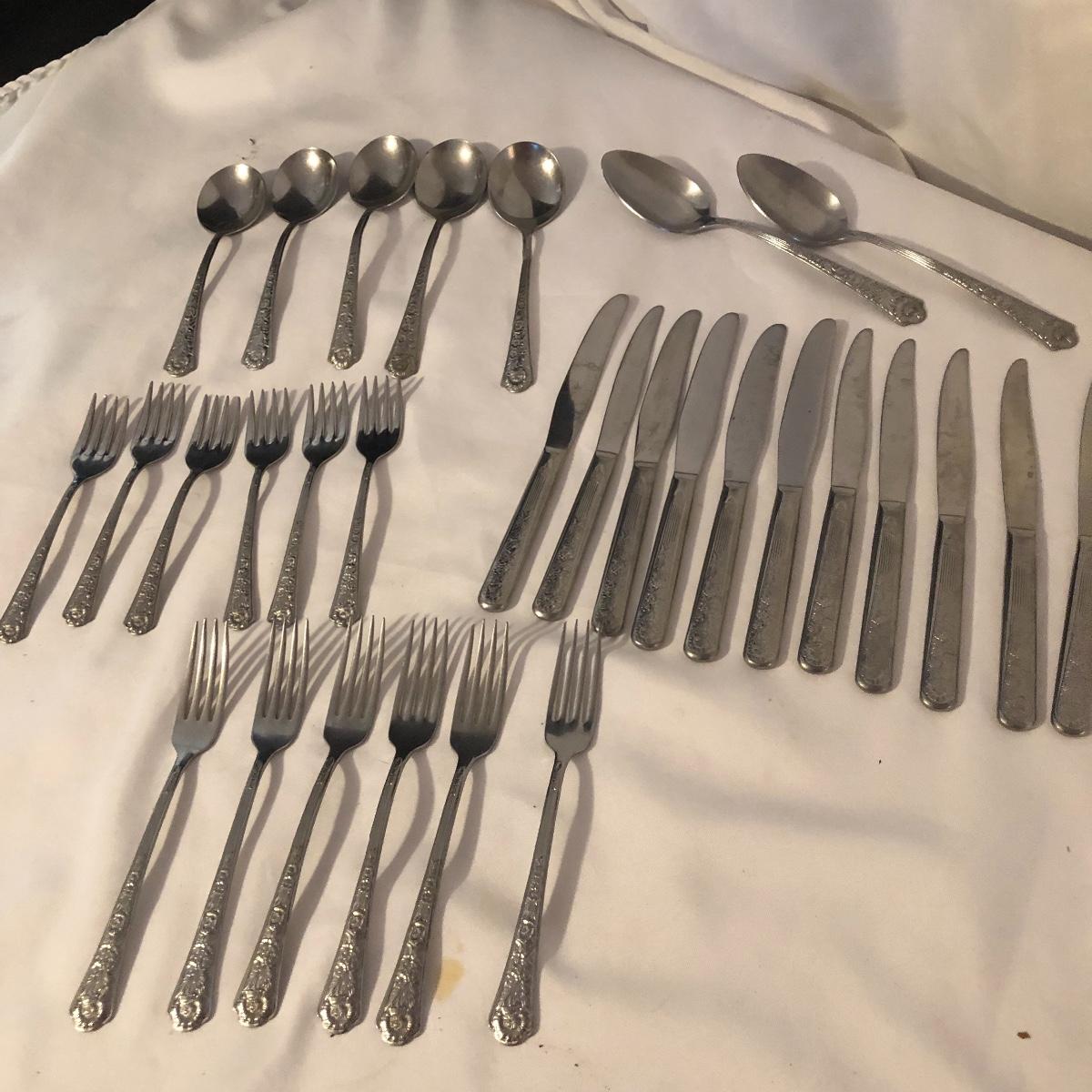 This lot includes two sets of flatware: Debut Stainless and Update Stainless Flatware. The Debut flatware includes eleven knives, six dinner and salad forks, five soup spoons and two serving spoons. The Update Stainless Flatware includes (and is pictured last except the first picture shows two place settings together) : ten dinner forks, ten knives, nine soup spoons and seven spoons. Additionally, there are eleven tea spoons. S