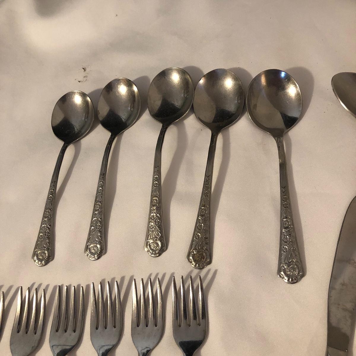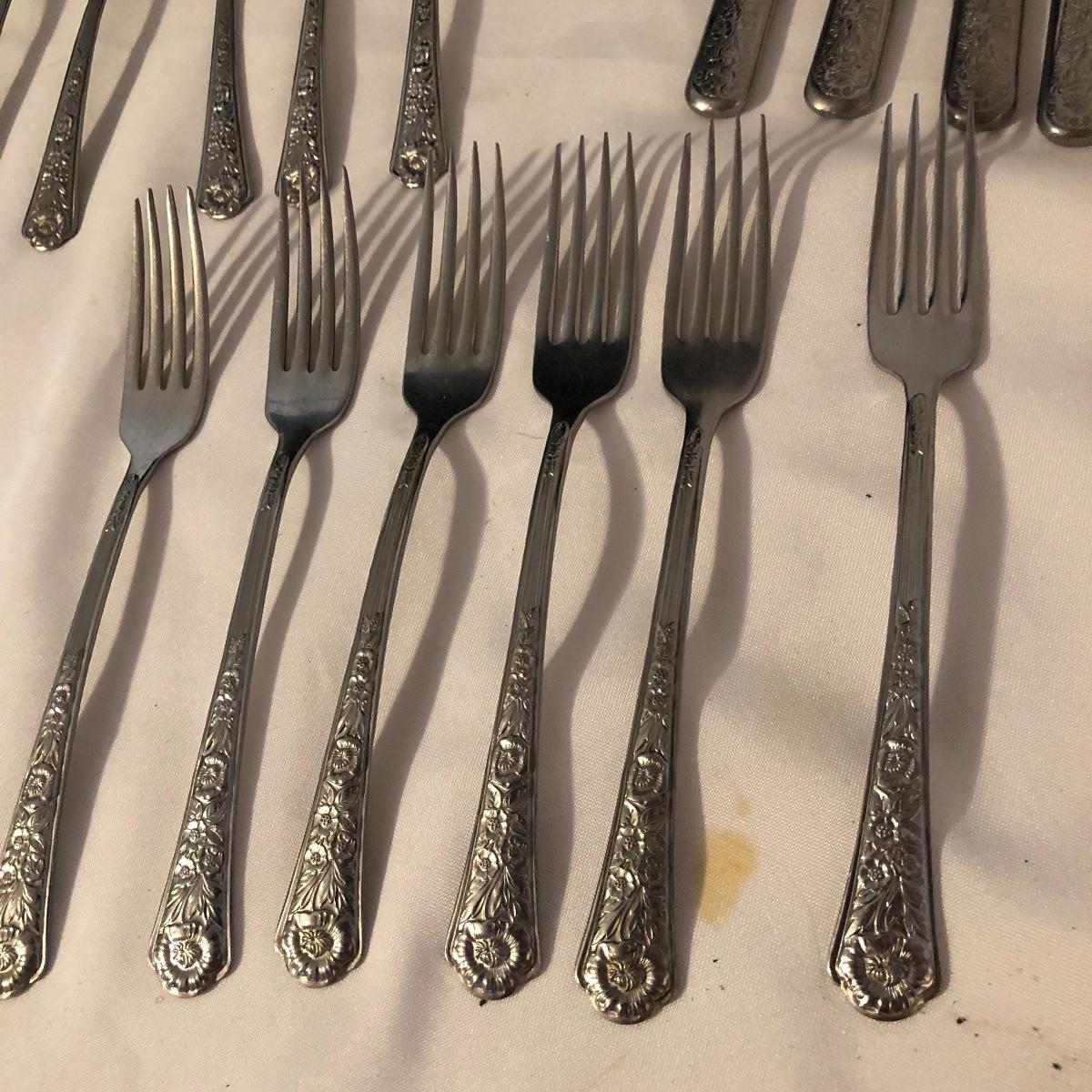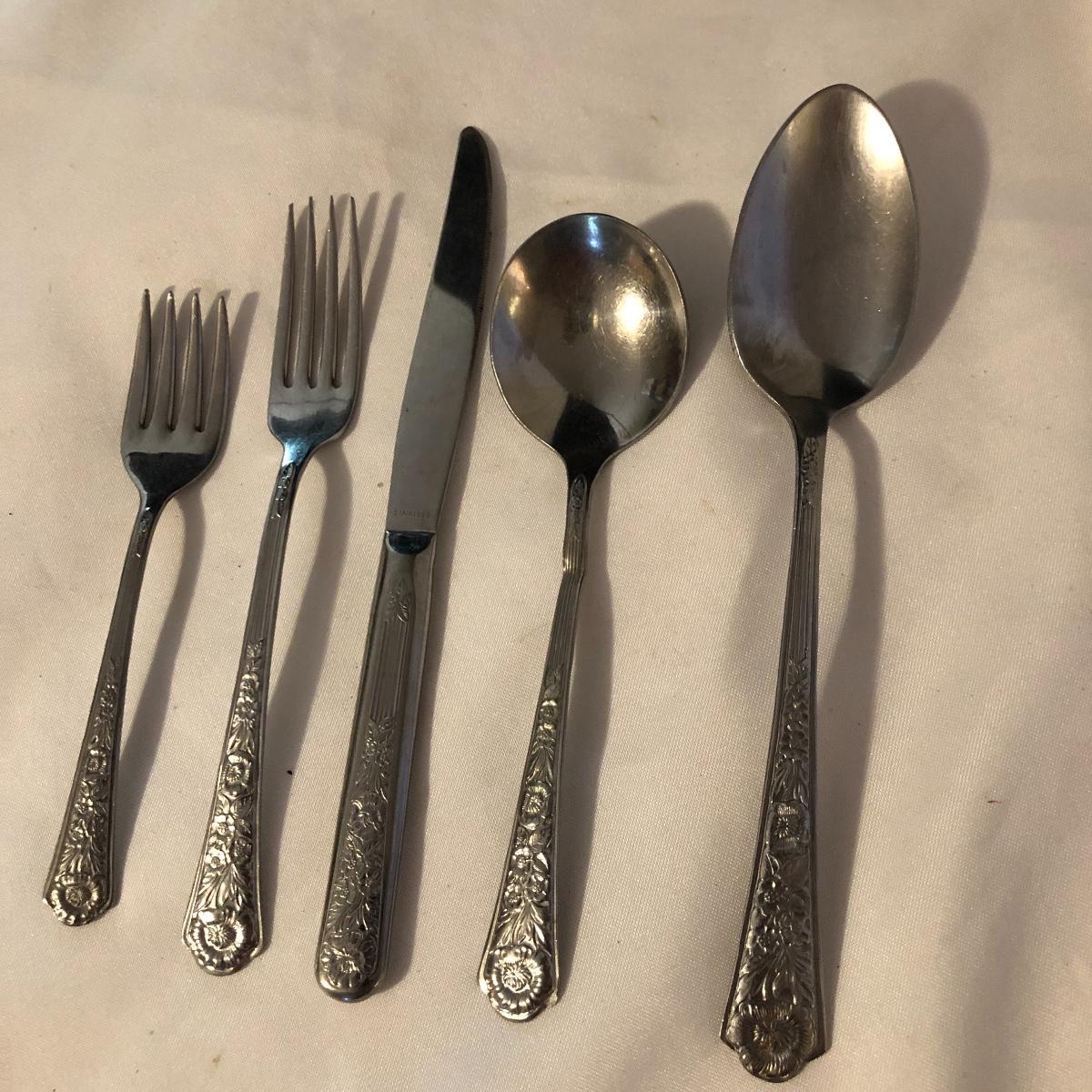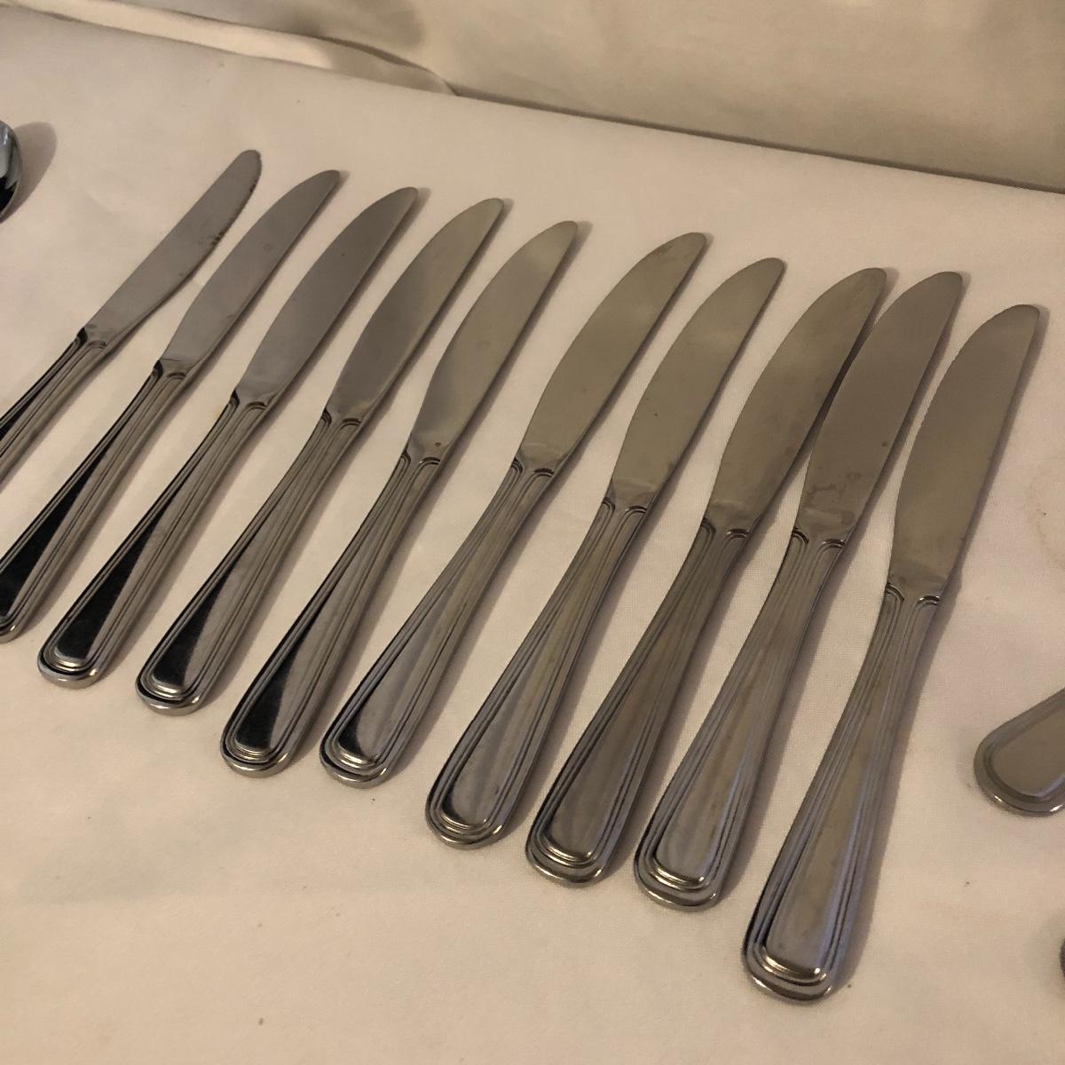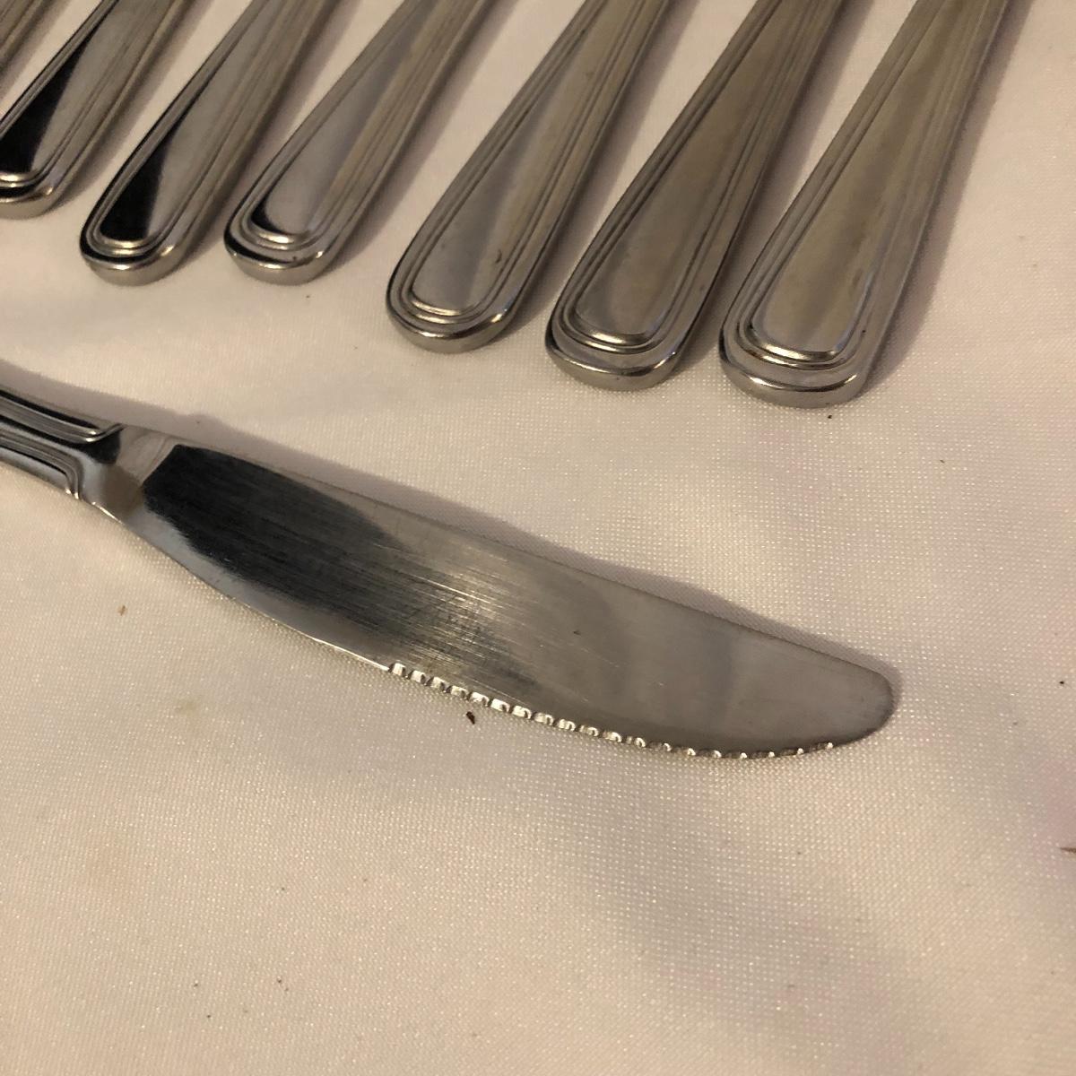 This lot includes two sets of flatware: Debut Stainless and Update Stainless Flatware. The Debut flatware includes eleven knives, six dinner and salad forks, five soup spoons and two serving spoons. The Update Stainless Flatware includes (and is pictured last except the first picture shows two place settings together) : ten dinner forks, ten knives, nine soup spoons and seven spoons. Additionally, there are eleven tea spoons. S