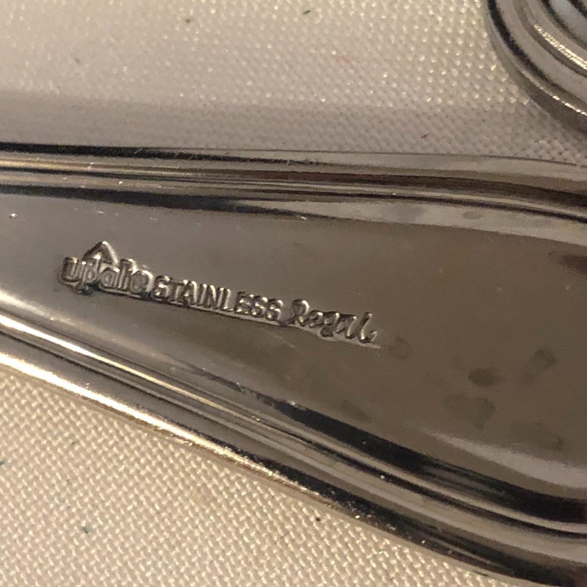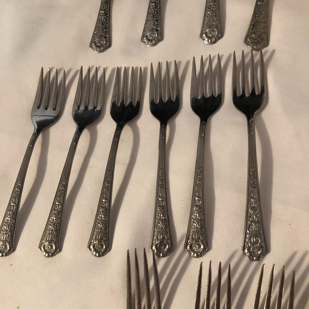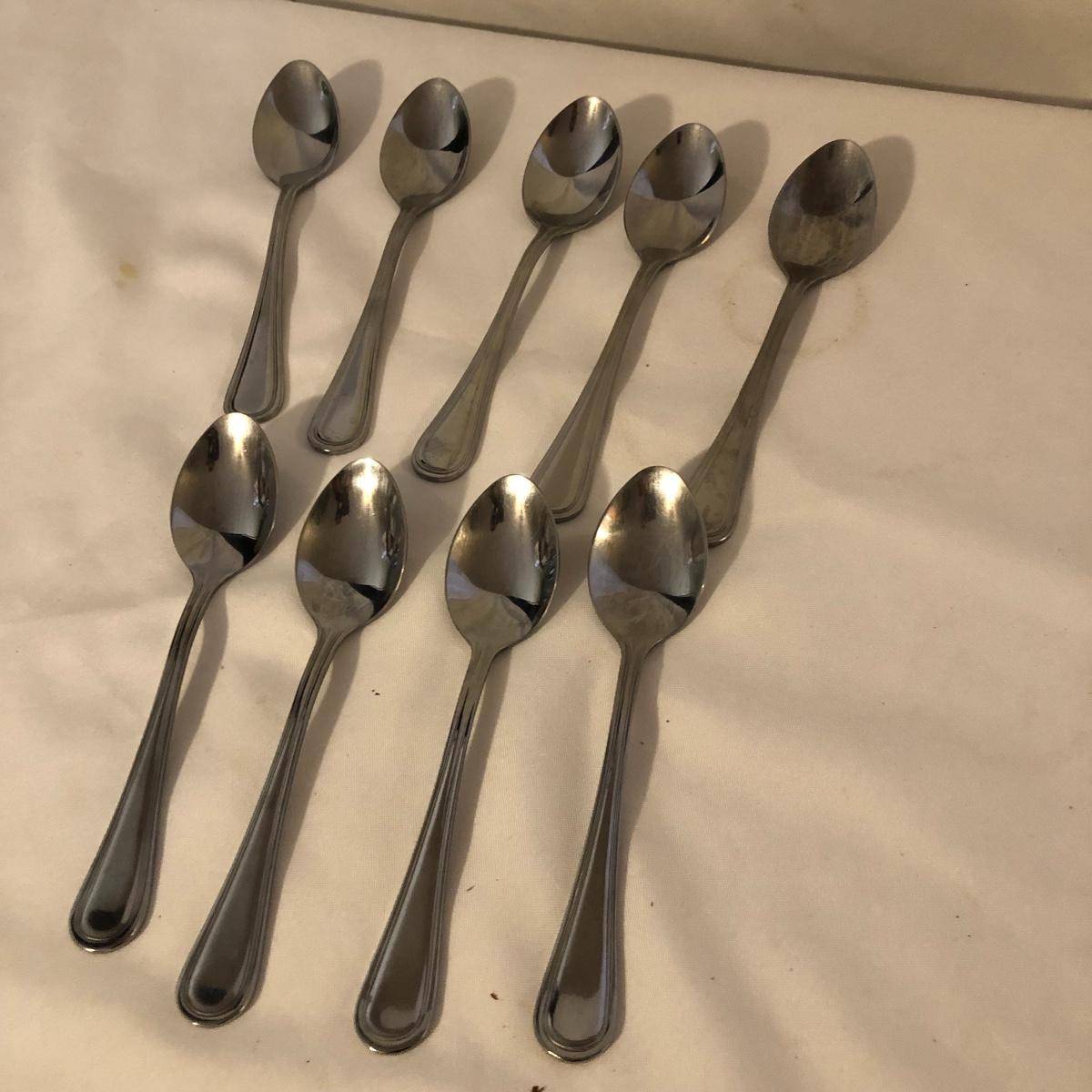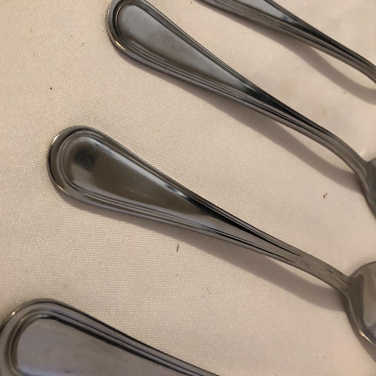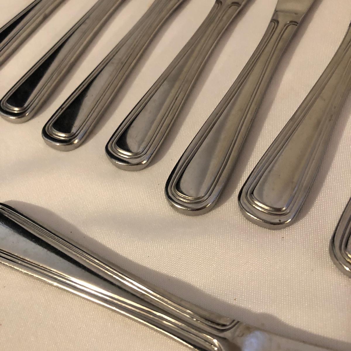 This lot includes two sets of flatware: Debut Stainless and Update Stainless Flatware. The Debut flatware includes eleven knives, six dinner and salad forks, five soup spoons and two serving spoons. The Update Stainless Flatware includes (and is pictured last except the first picture shows two place settings together) : ten dinner forks, ten knives, nine soup spoons and seven spoons. Additionally, there are eleven tea spoons. S