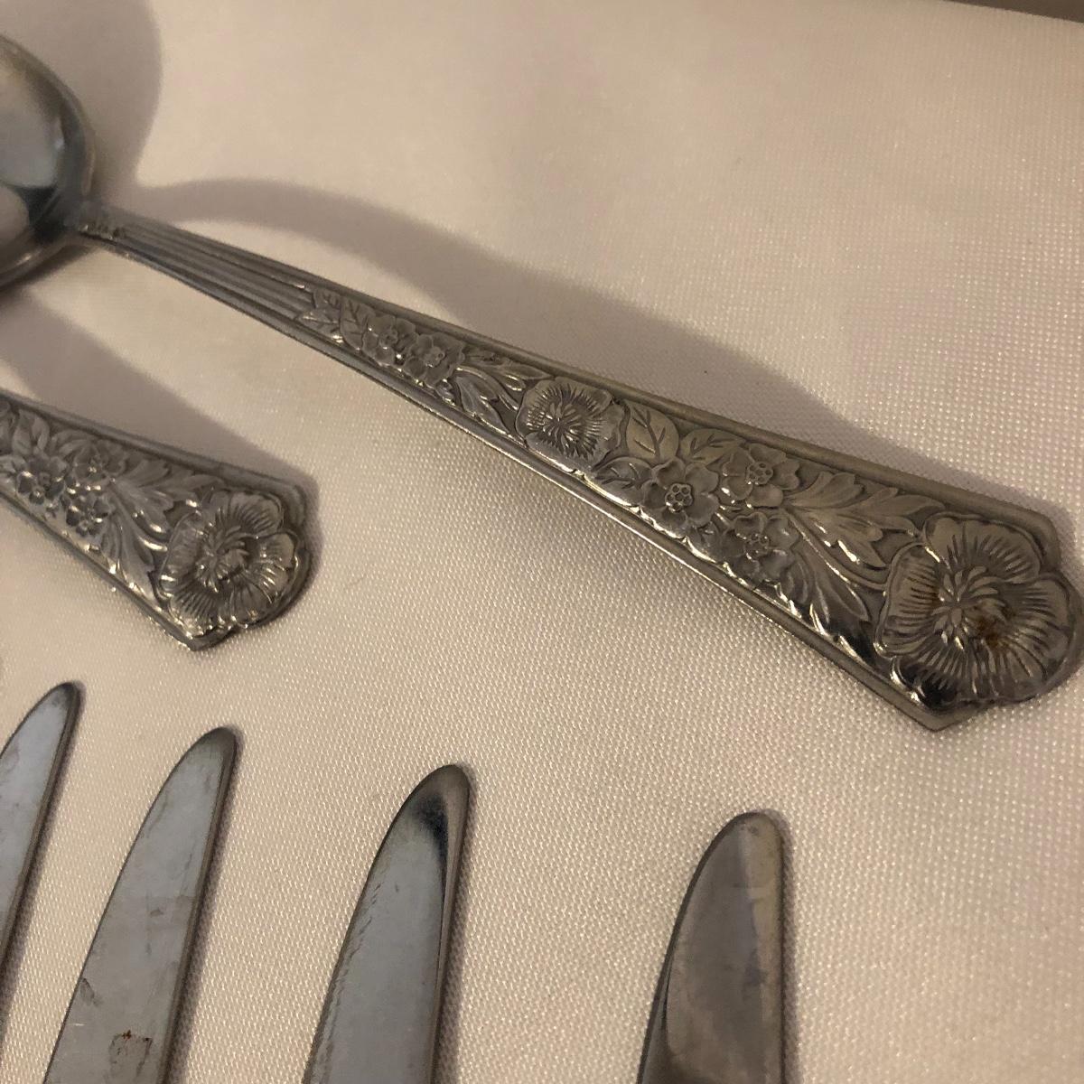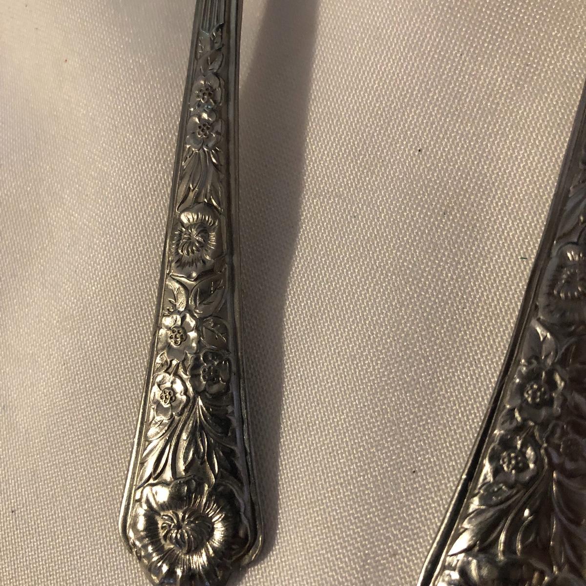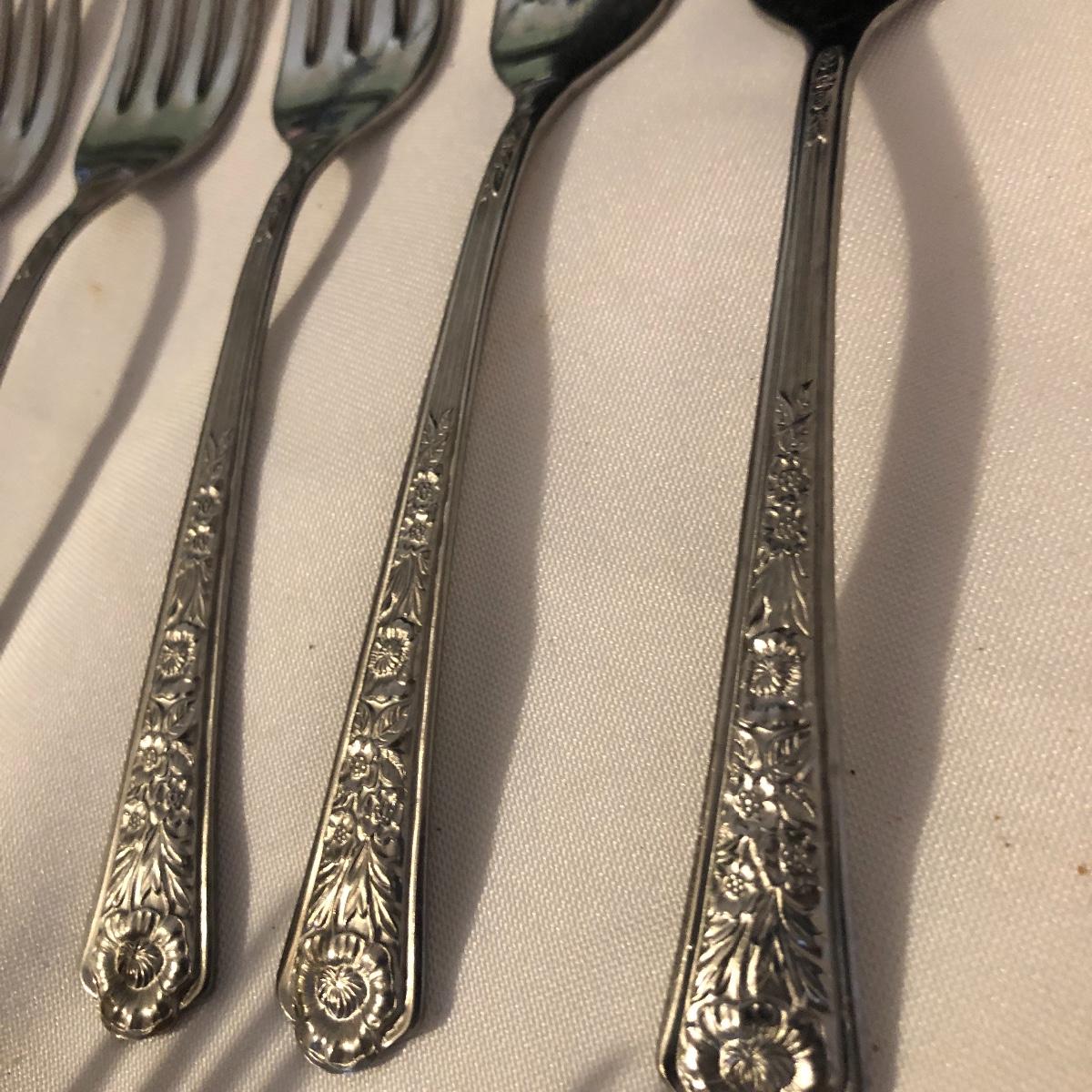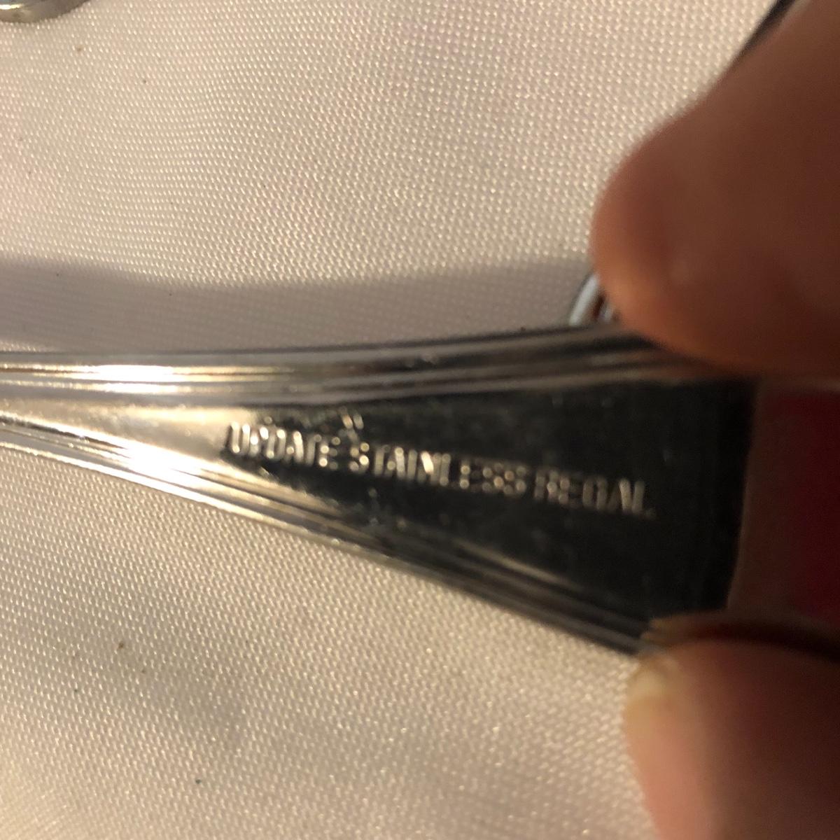 This lot includes two sets of flatware: Debut Stainless and Update Stainless Flatware. The Debut flatware includes eleven knives, six dinner and salad forks, five soup spoons and two serving spoons. The Update Stainless Flatware includes (and is pictured last except the first picture shows two place settings together) : ten dinner forks, ten knives, nine soup spoons and seven spoons. Additionally, there are eleven tea spoons. S