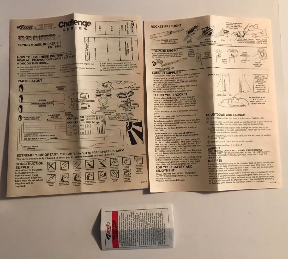 Vintage Model Rocket Version of the SR-71 Blackbird from the Estes Challenge Series. Outer box has been opened-internal parts bags are sealed with some loose contents and instructions. The pictures show condition, measurements if taken, and what is included in the lot. Due to the large amount that we photograph and the time frame, we are not always able to take measurements. All items unless noted, are pre-owned and have been used. If you purchased furniture, you must bring help. We do not allow one person to carry large furniture out on their own. Bring help, tools and a truck for the safety of our client’s homes, and your personal safety. Company policy. Thank you.