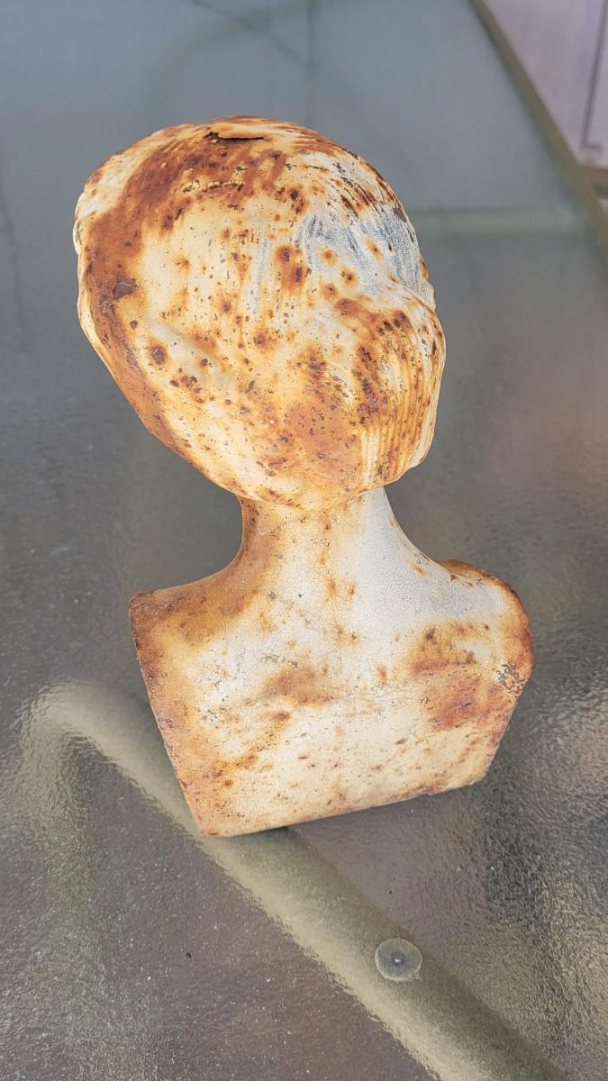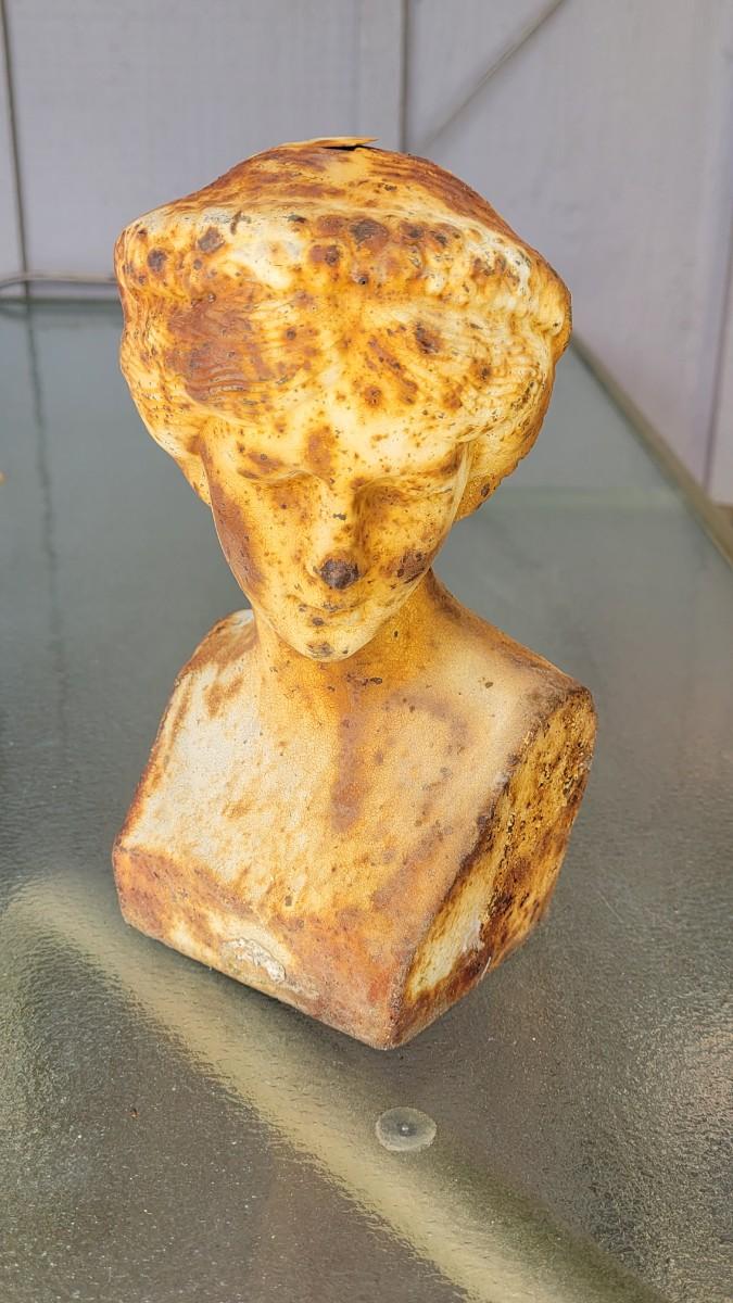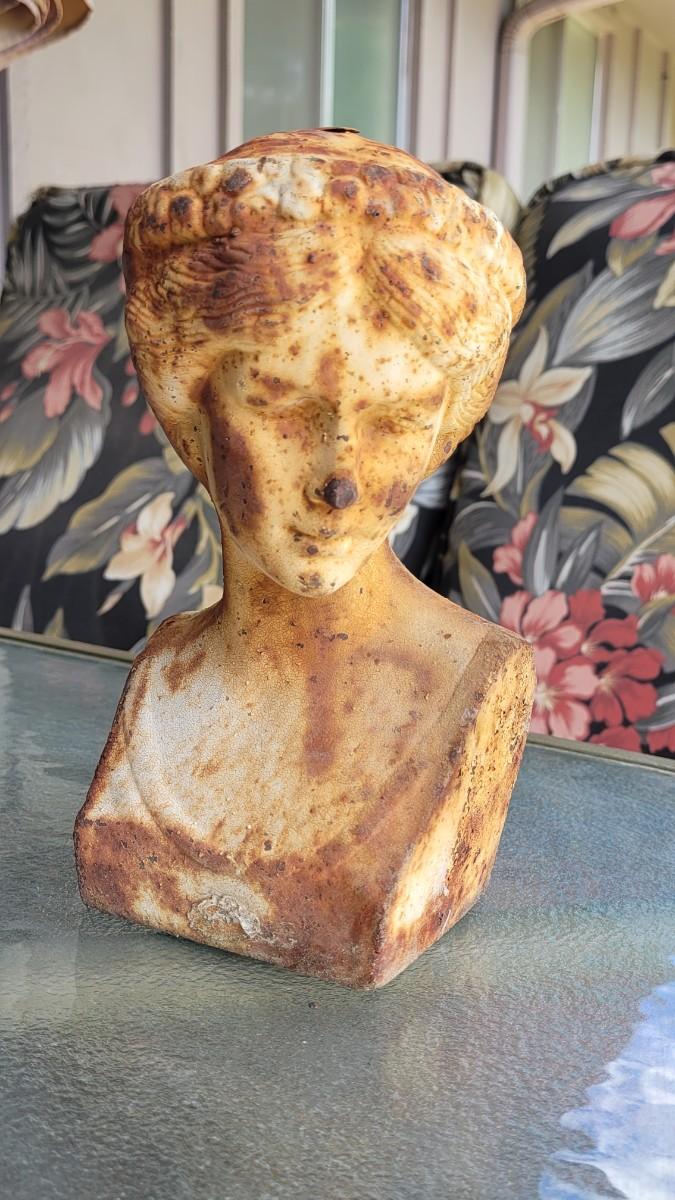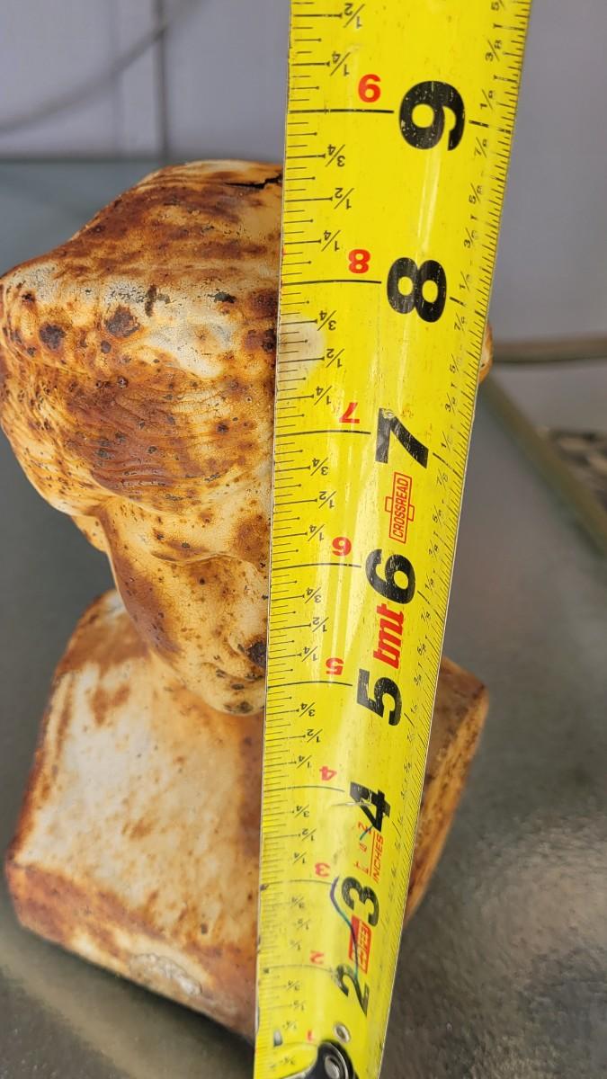Has been displayed outdoors on a porch. Hollow on the inside, it is a heavier piece