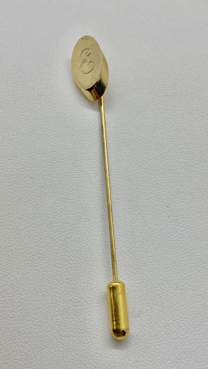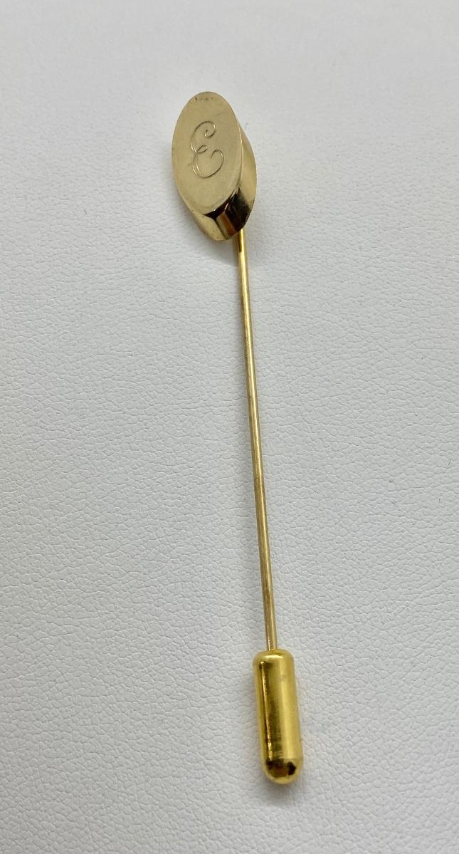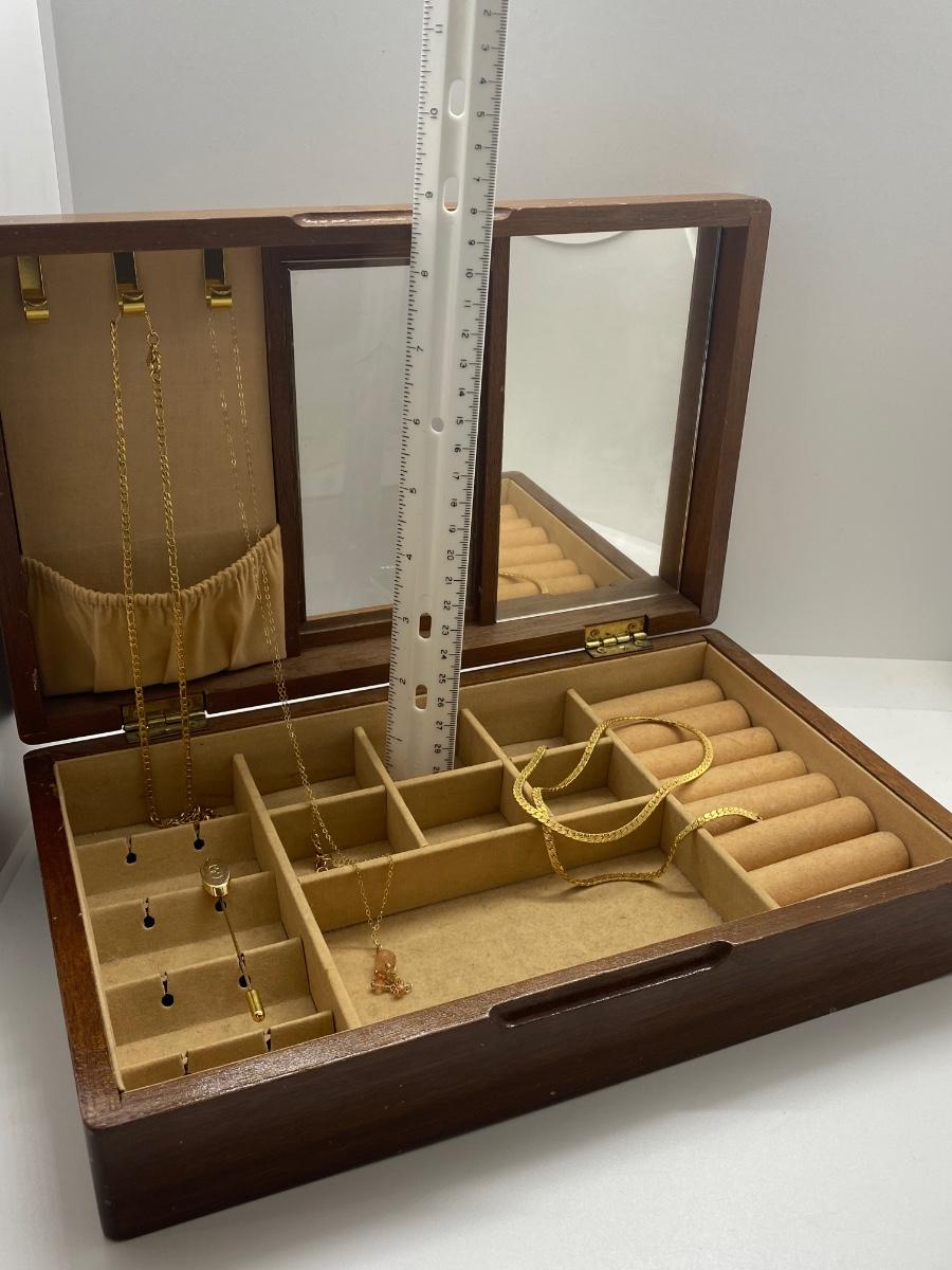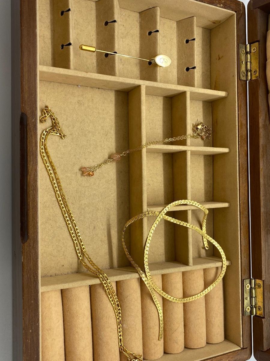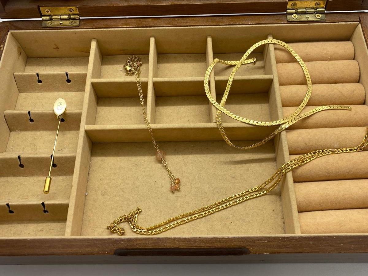 Wood jewelry box with two necklaces in a gold tone, stick pin and thick gold tone necklace with broken clasp.