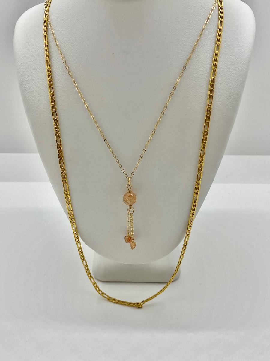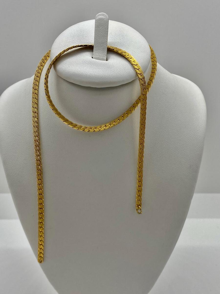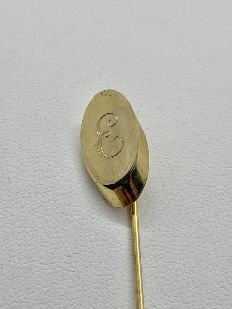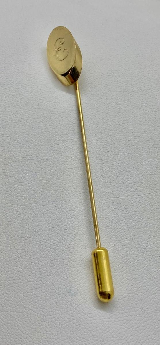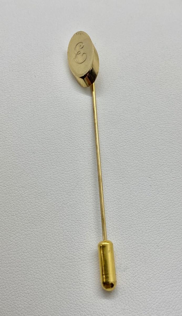 Wood jewelry box with two necklaces in a gold tone, stick pin and thick gold tone necklace with broken clasp.