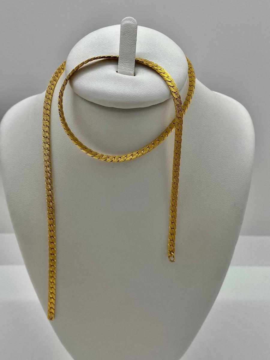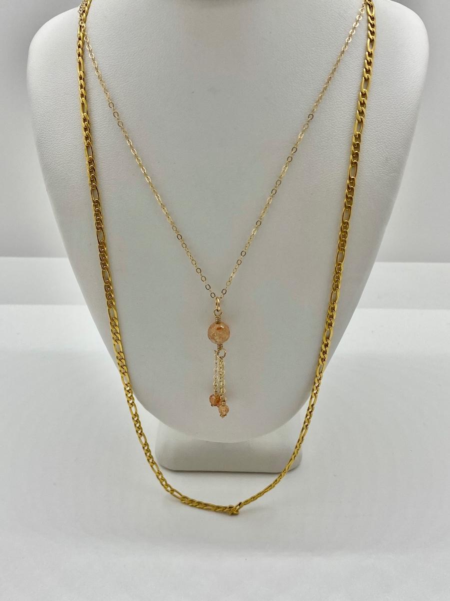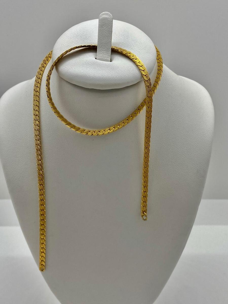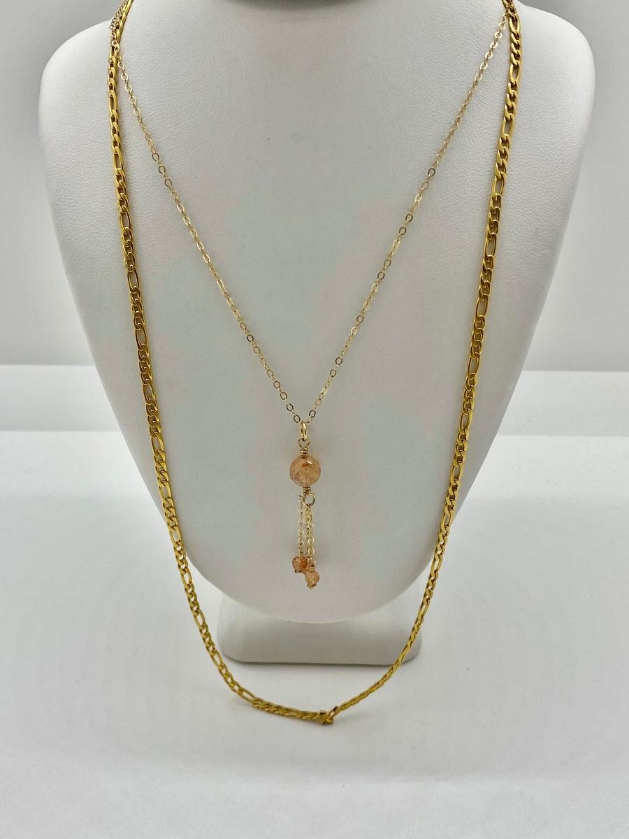 Wood jewelry box with two necklaces in a gold tone, stick pin and thick gold tone necklace with broken clasp.