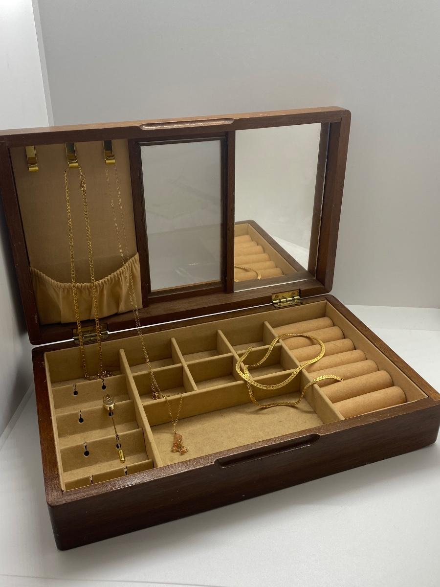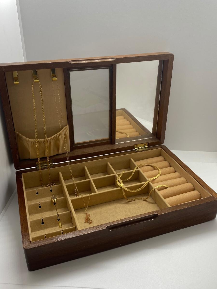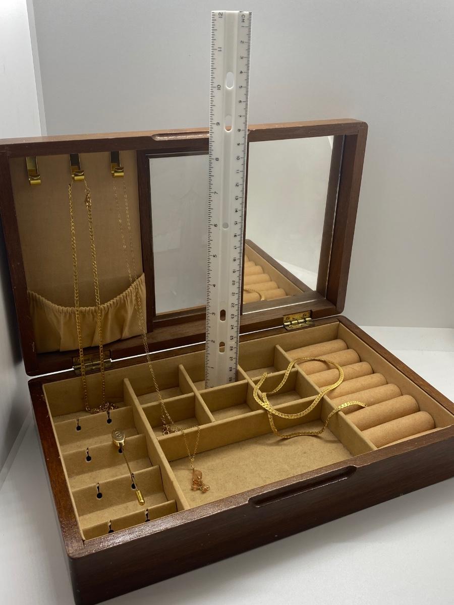 Lot 160: Wood Jewelry Box With Gold Tone Jewelry