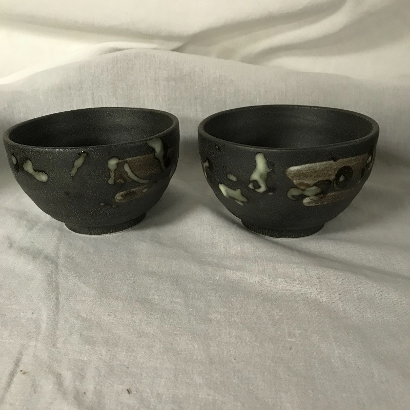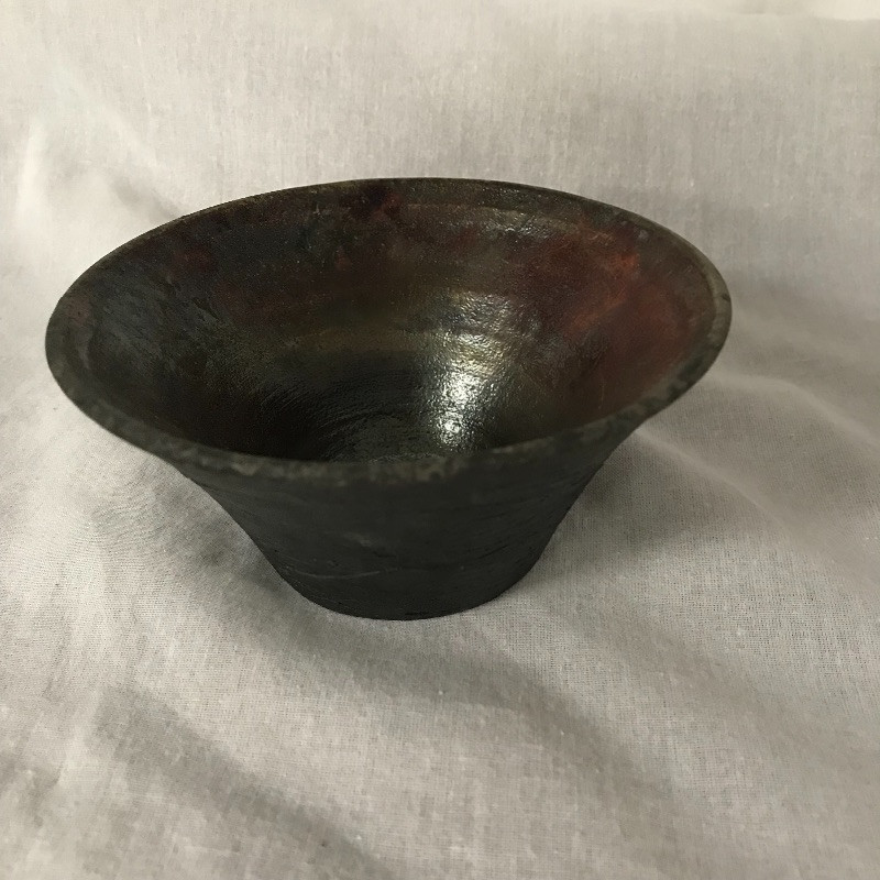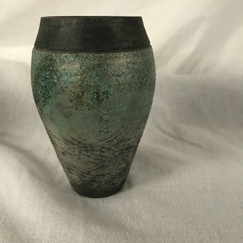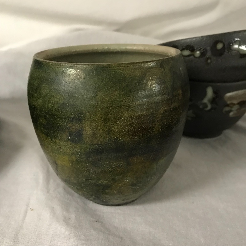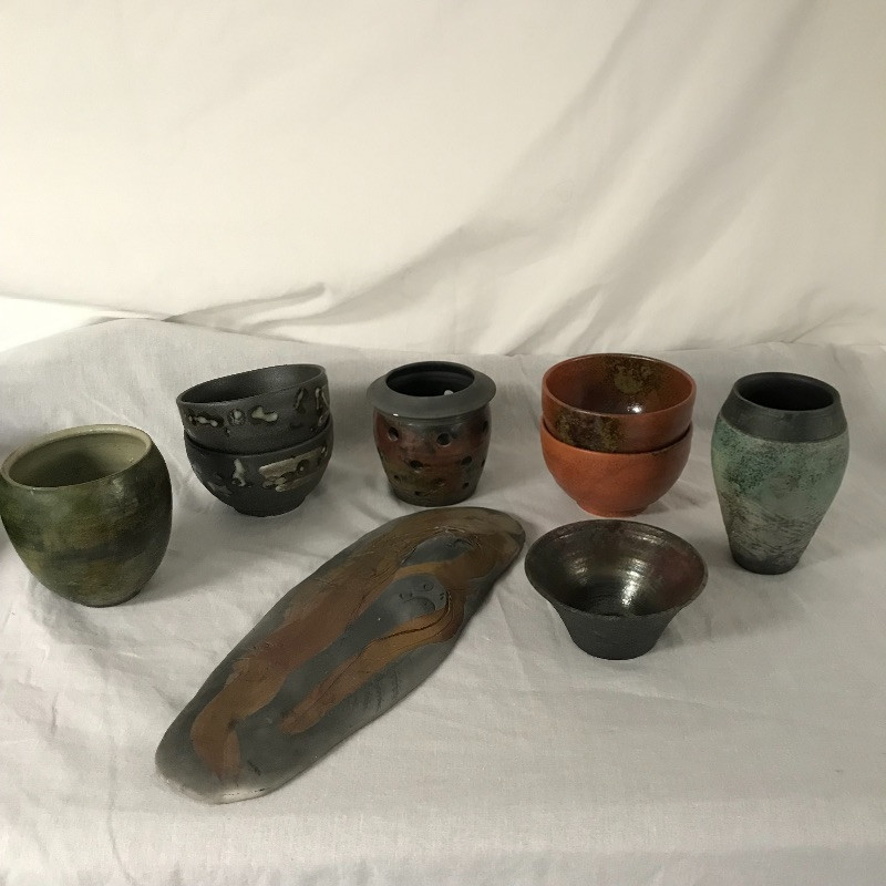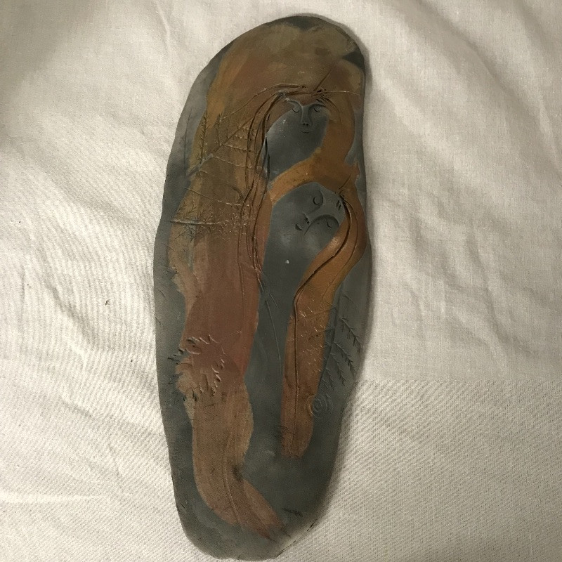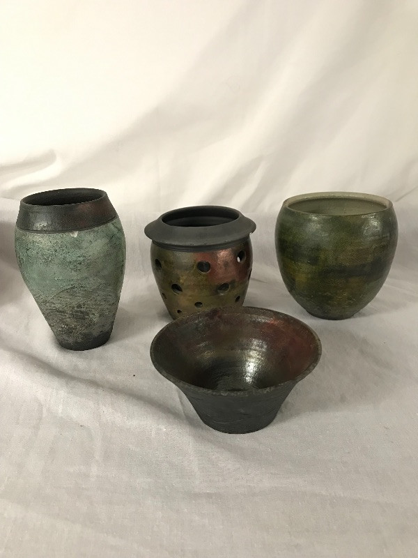 This black and iridescent themed lot has five pieces that are signed and numbered. The others just fit with the lot and have no markings. The wall plaque of two women measures 14” x6”. One small chip as seen in photos on the teal colored vase that is also the tallest pieces at 6” tall. Shipping available.