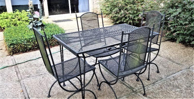 Very nice patio/outdoor dining set - cast iron with four chairs. Note: one chair is missing one of the brass finials. Otherwise, good used condition. Set is HEAVY. Chairs are 38" tall. Table is 4 feet long, 30" across, and 29.5" tall.