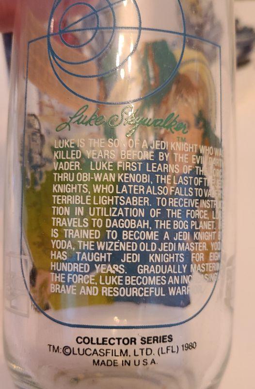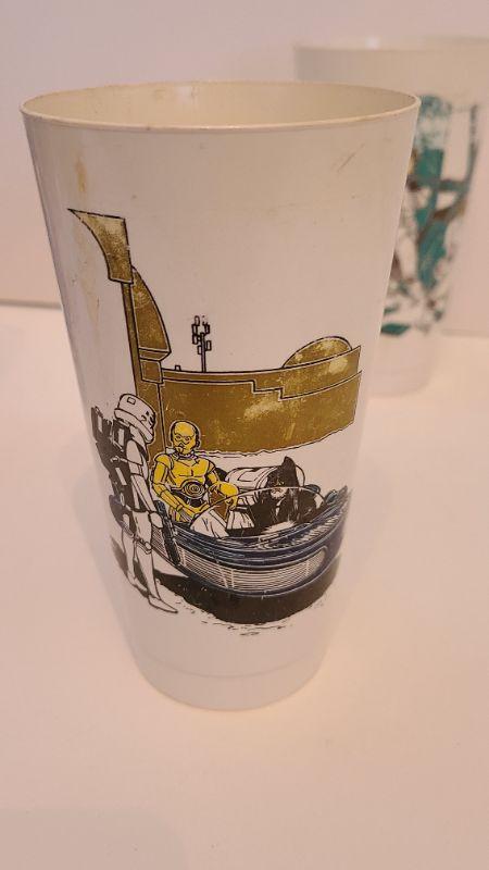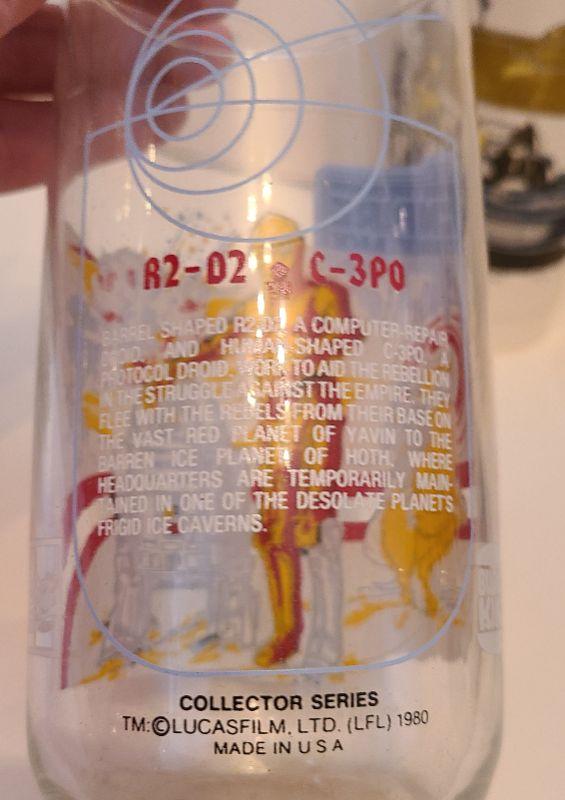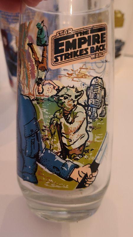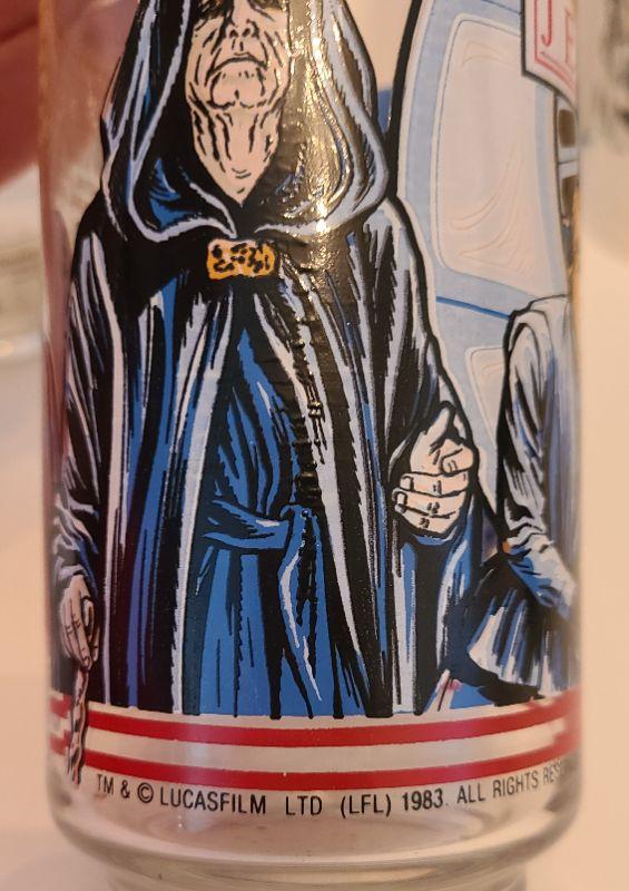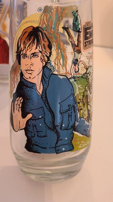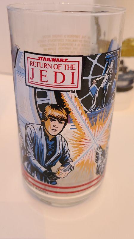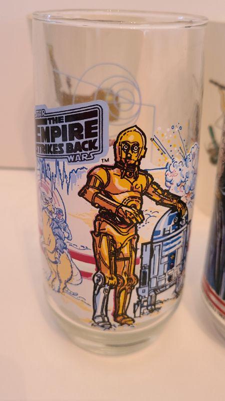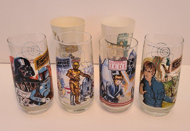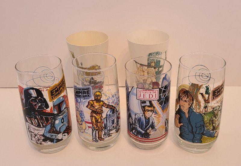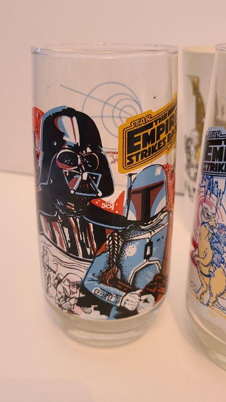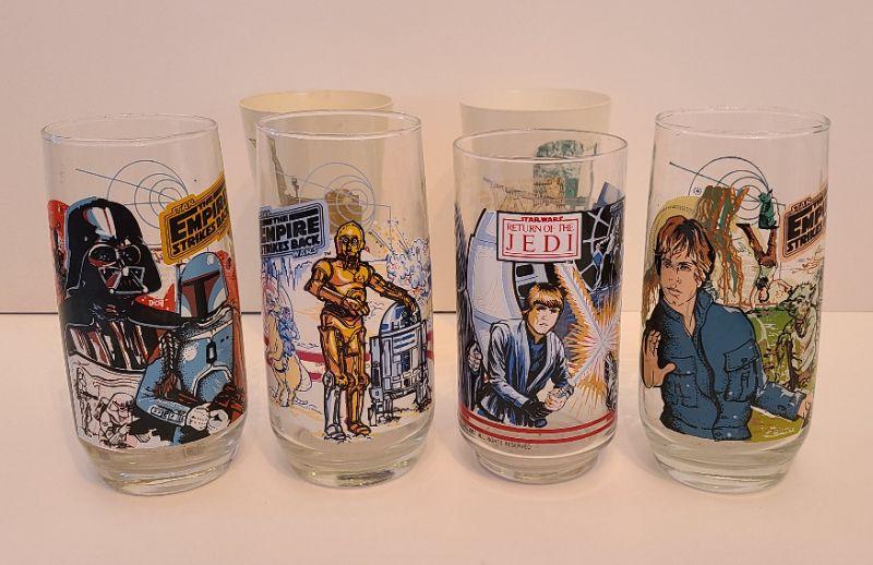 Vintage lot of Star Wars glasses from Return of the Jedi and Empire Strikes Back. All collectibles have been photographed from every angle as they are the best representation of the item. While items may be listed as new, they are vintage or new old stock, and have been stored for some time. Please check all pictures for the edges of the packaging, as these are vintage the glue from the seal may have come loose, and if so, a picture will show. Please see pictures for exactly what you are getting and the condition. Anything extra about the condition will be noted at the beginning of the description. Thank you for looking and have fun bidding.