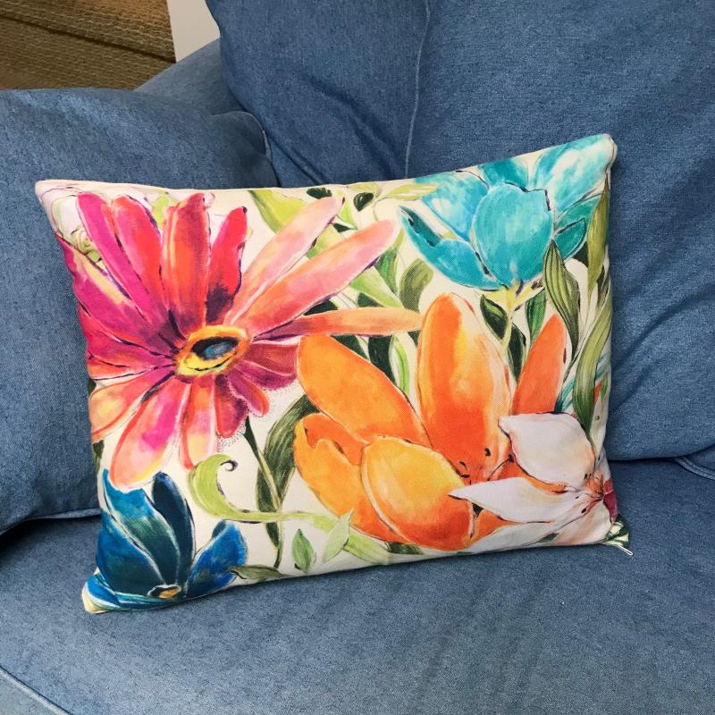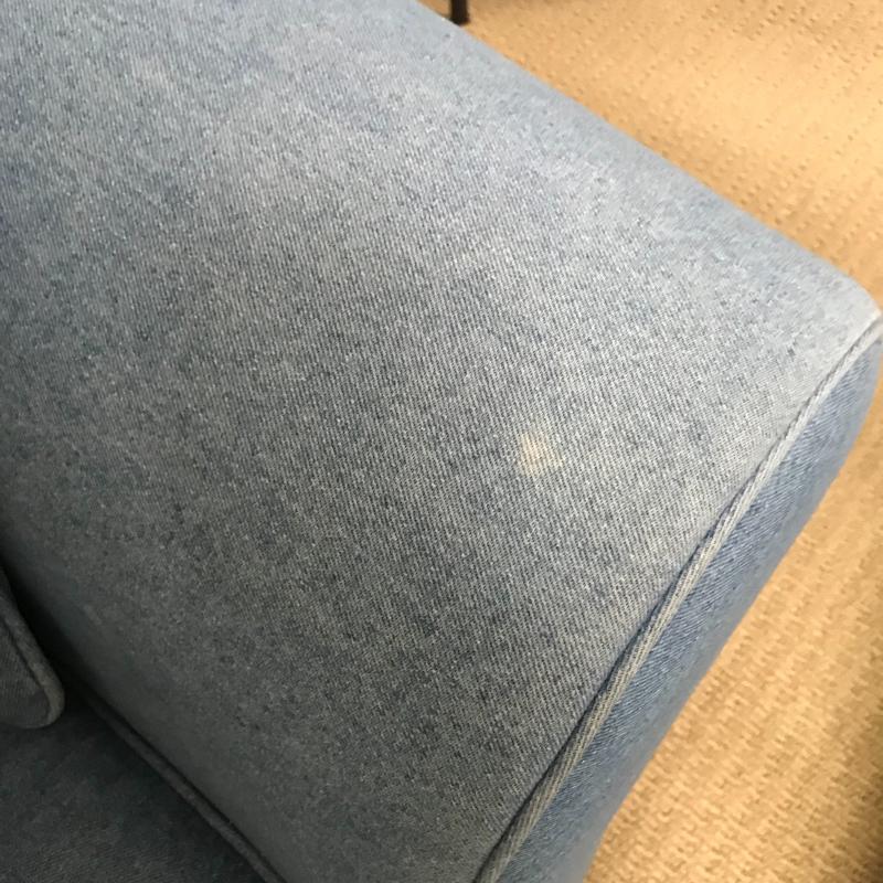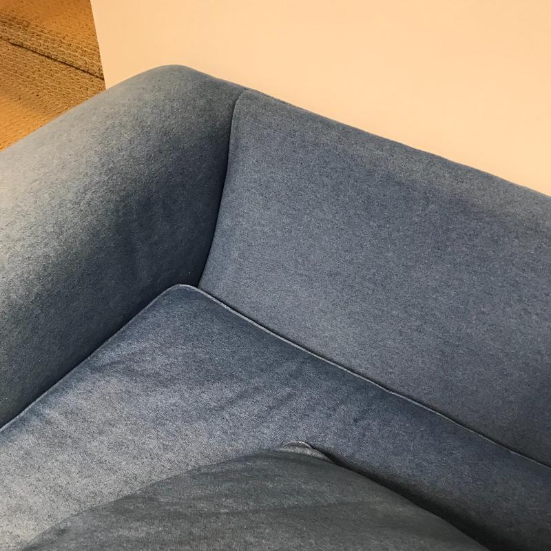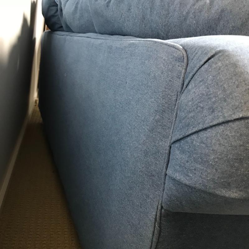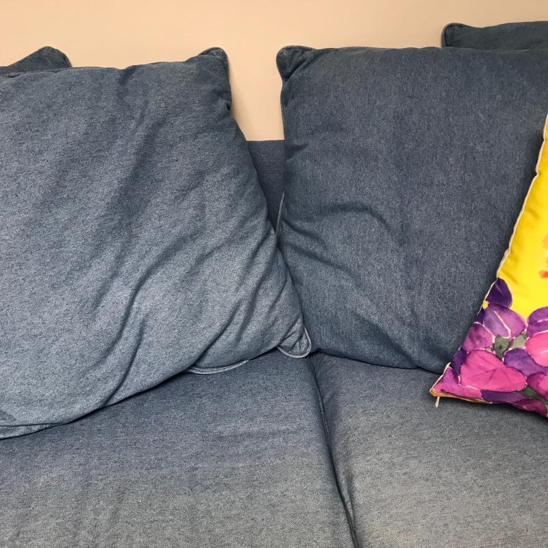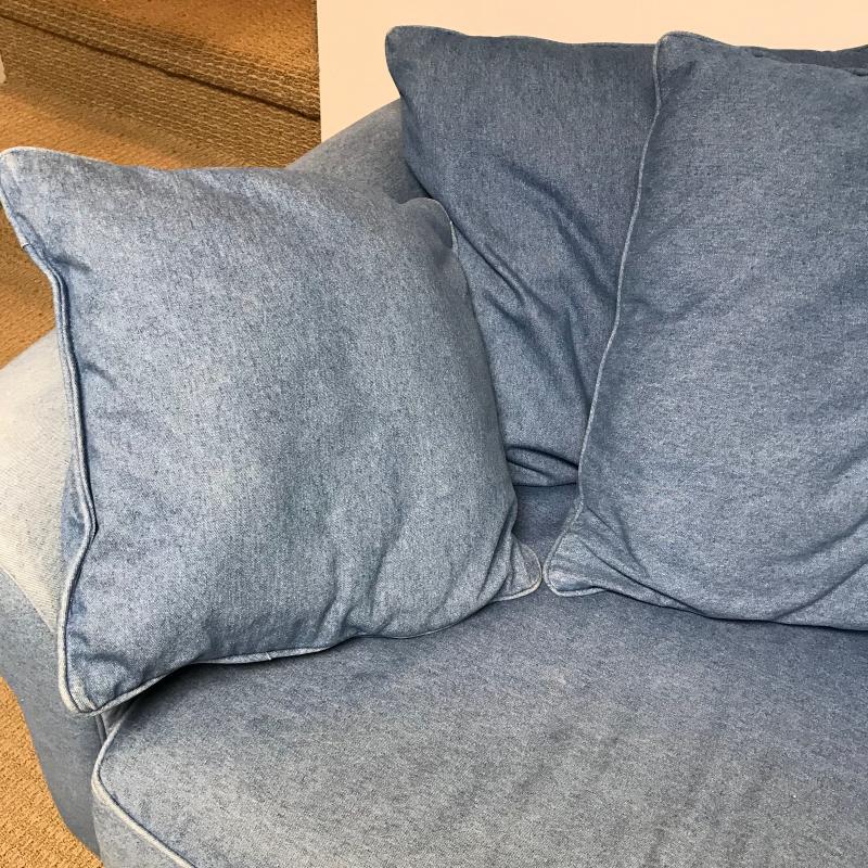 Lot includes super comfy denim couch with two decorative floral throw pillows. Some wear on couch, but in good condition. Use as is or throw a slipcover on it. Couch is approx. 88” x 27” x 36”. Pillows are each approx. 21” x 17”. No shipping available. Local pickup only in Arden, NC.
