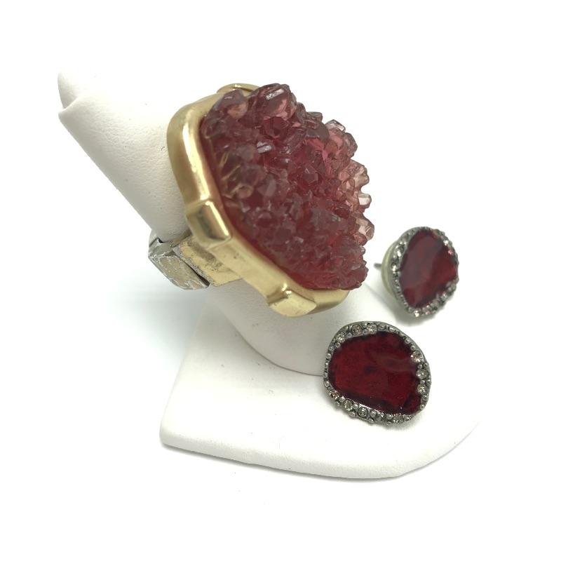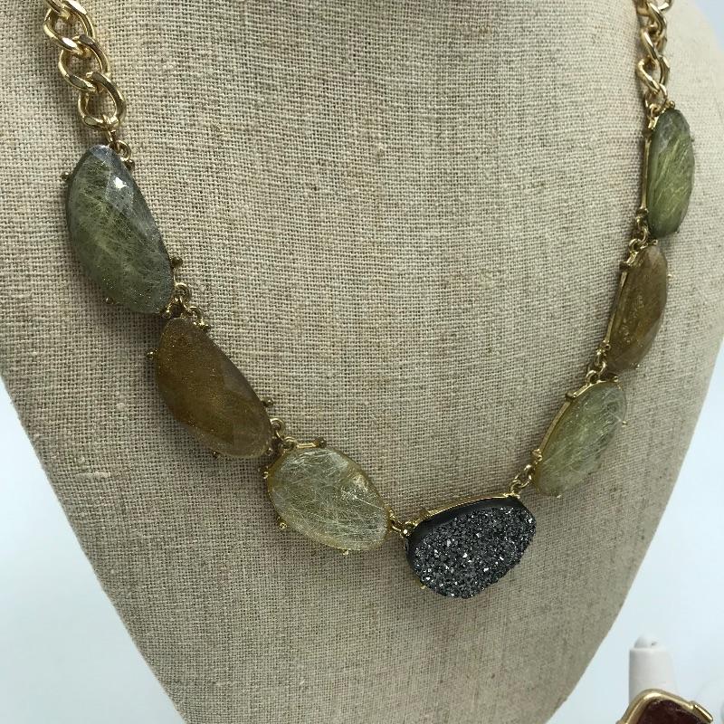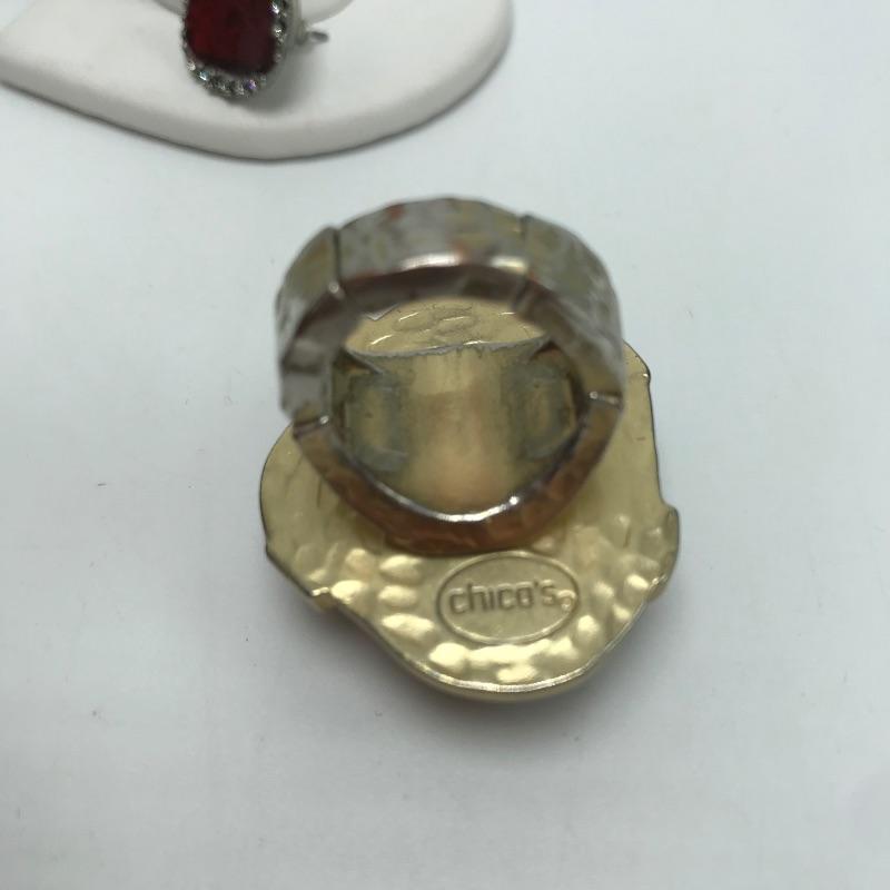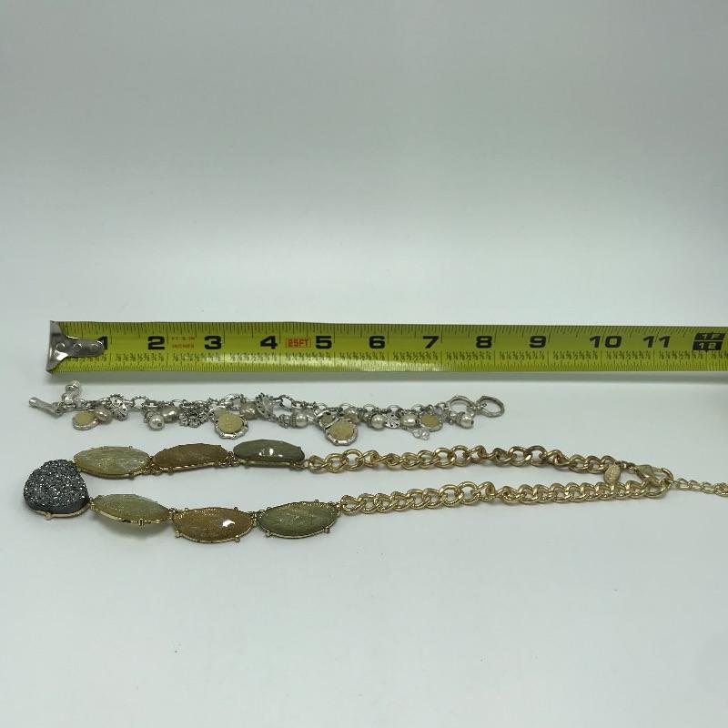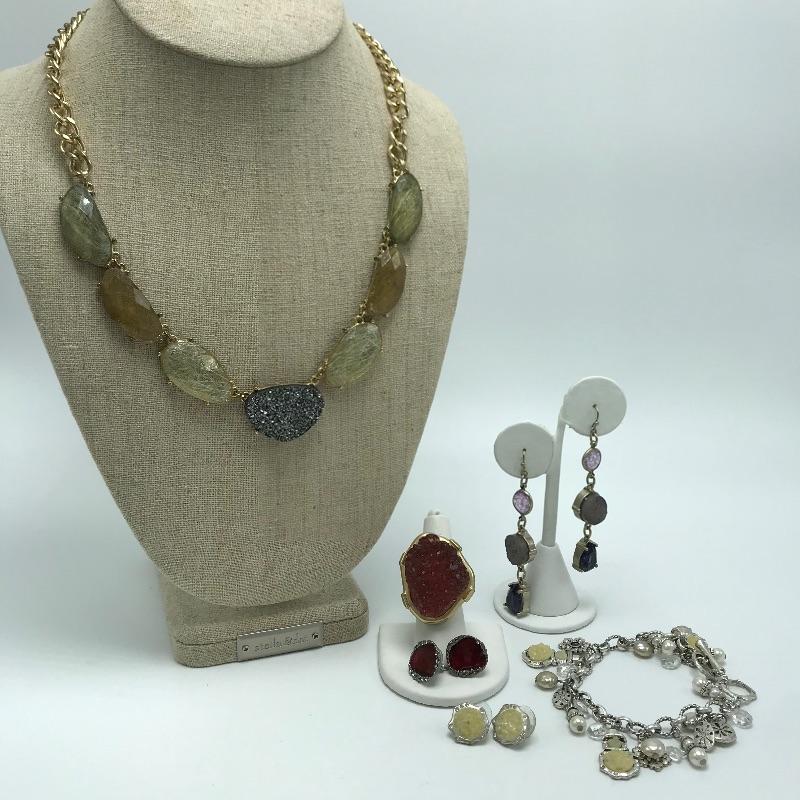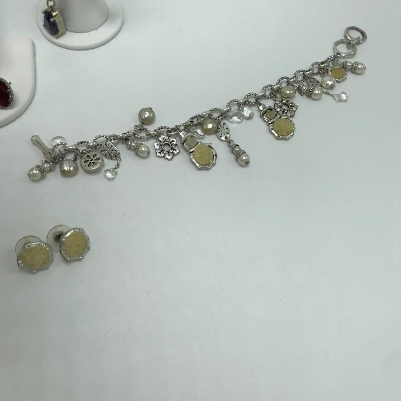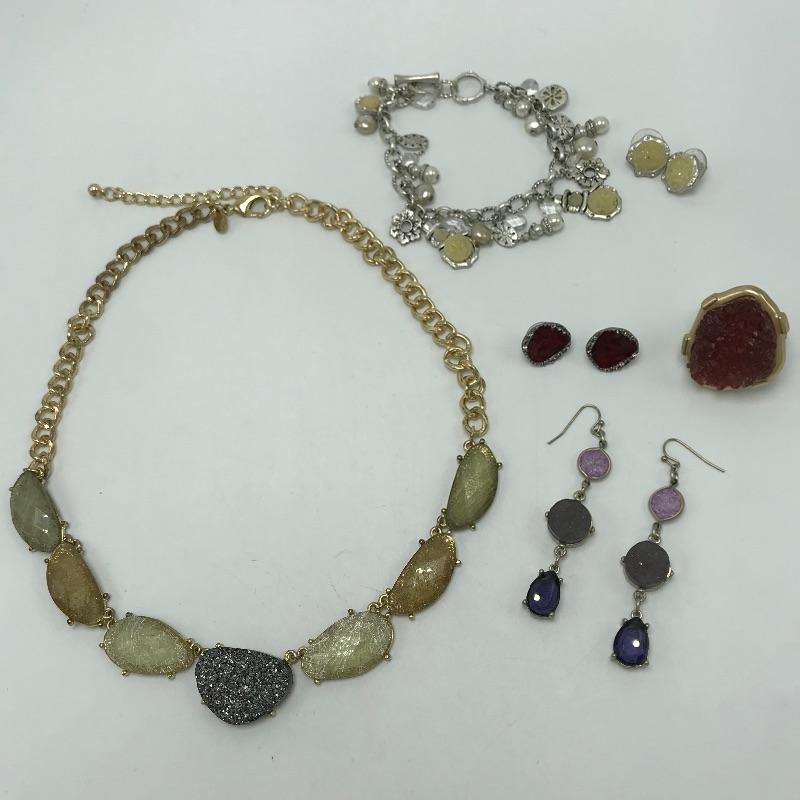 Lovely crystal style jewelry including a snowman charm bracelet with matching yellow and silver colored earrings. The ring and necklace are both marked Chico’s, no other markings were found on the jewelry. The ring size is shown in photos. Although the ring is a stretch ring, it seems slightly fragile and probably a good idea to not stretch it too much.