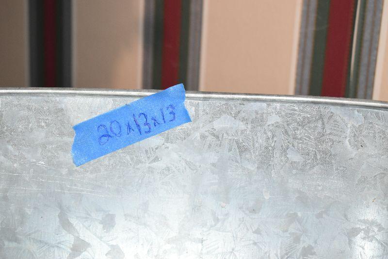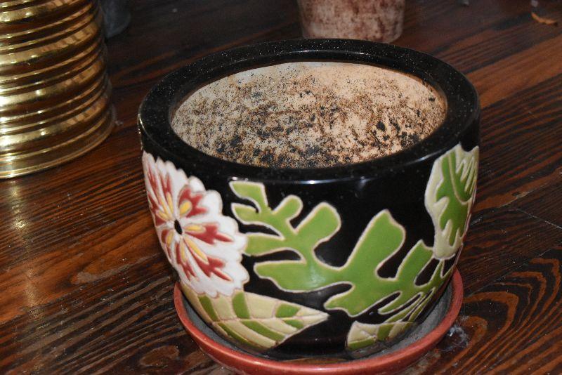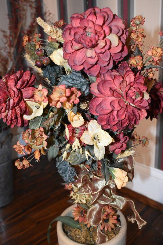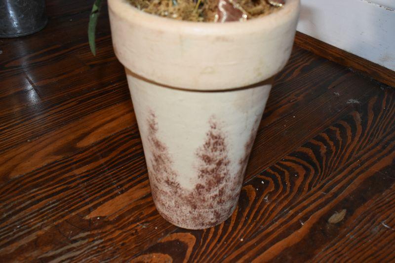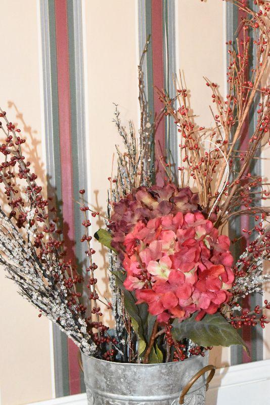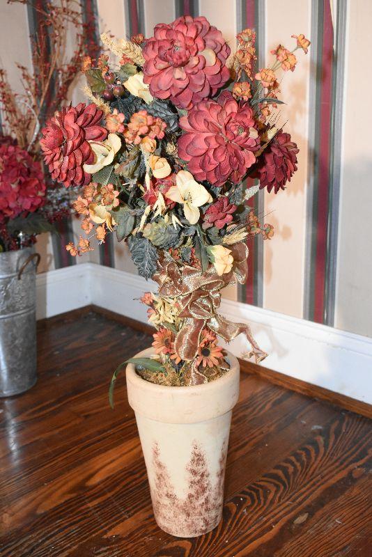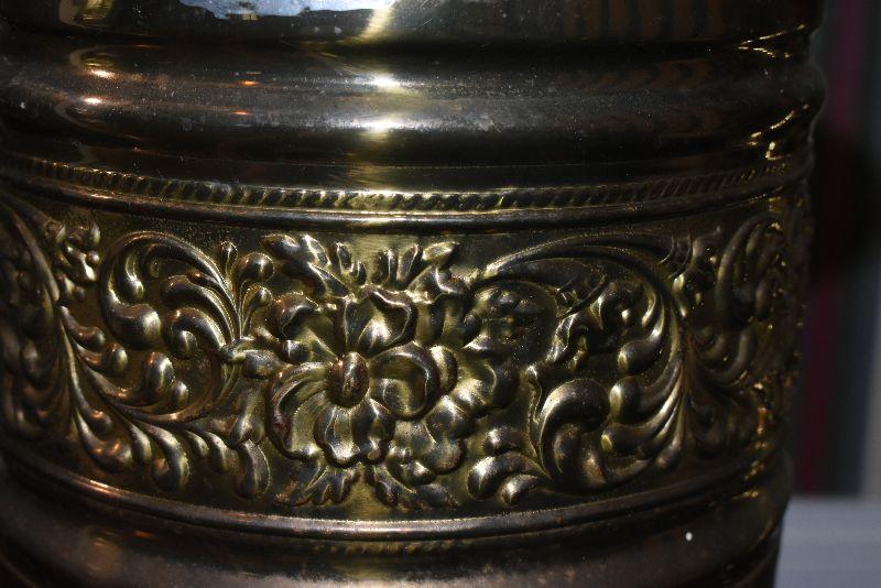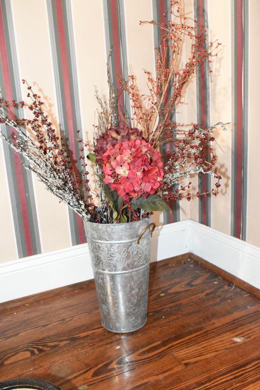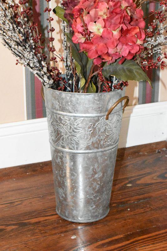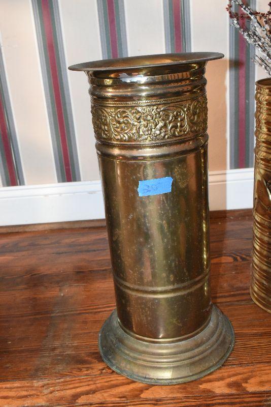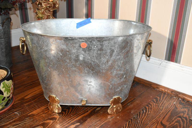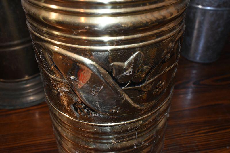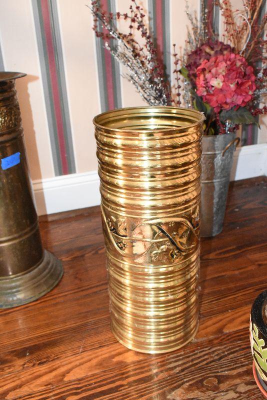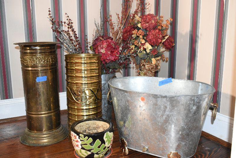 Metal tub with gold feet and handles, copper umbrella stand and a gold painted, metal umbrella stand, pottery flower pot, faux flowers in containers.