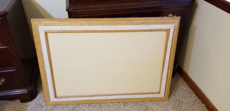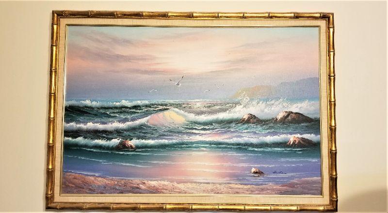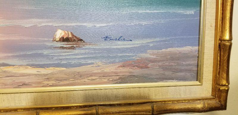 Decorative painting signed "Enslie" - 1980's seascape done in pink/blue/green. Framed, measures 39.5" wide, 28" tall. Good condition.