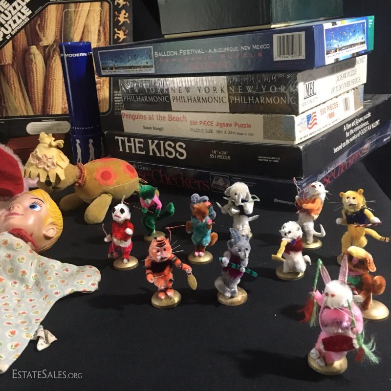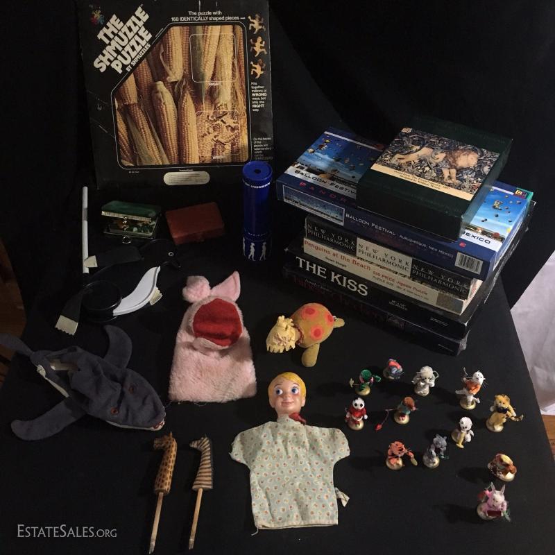 Games and puzzles. Some new in box. Dakin Dream Pet Turtle. Vintage puppets, Card sets in carrying cases. Cute handmade set of Pipe cleaner animals