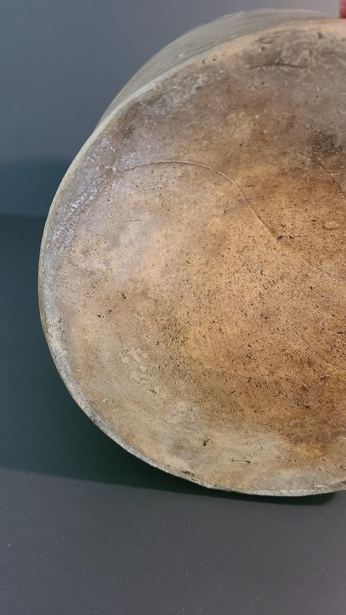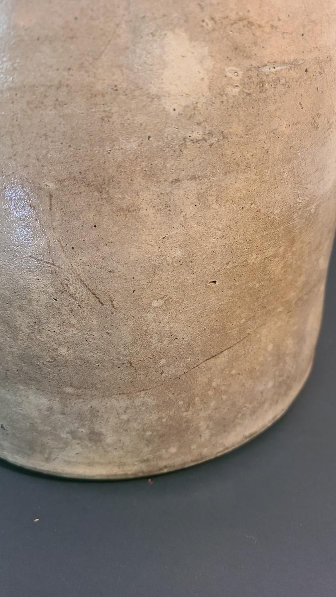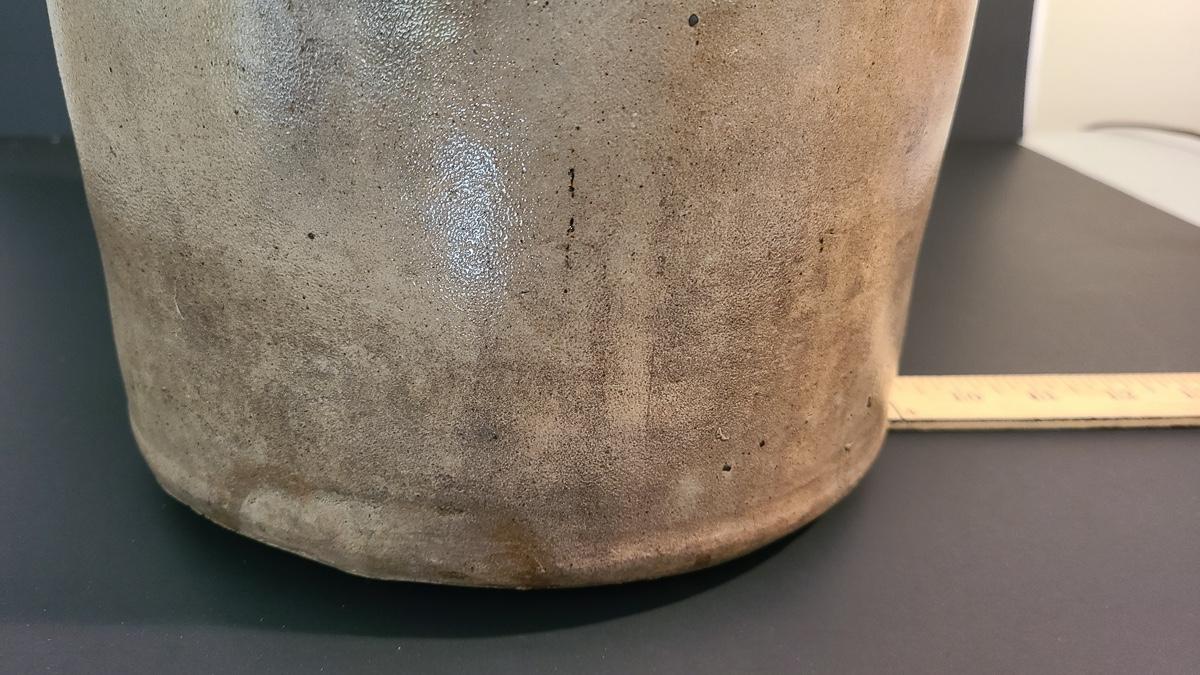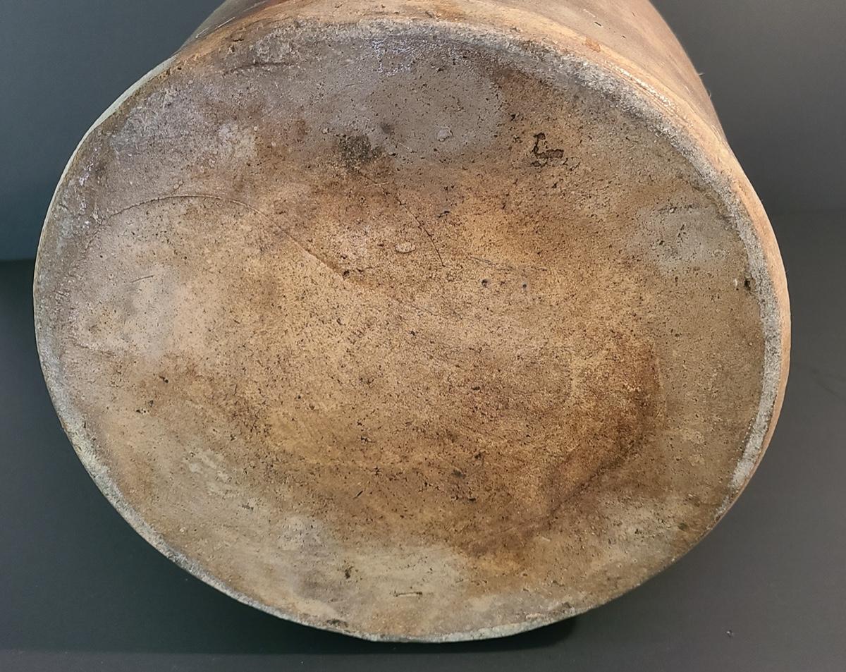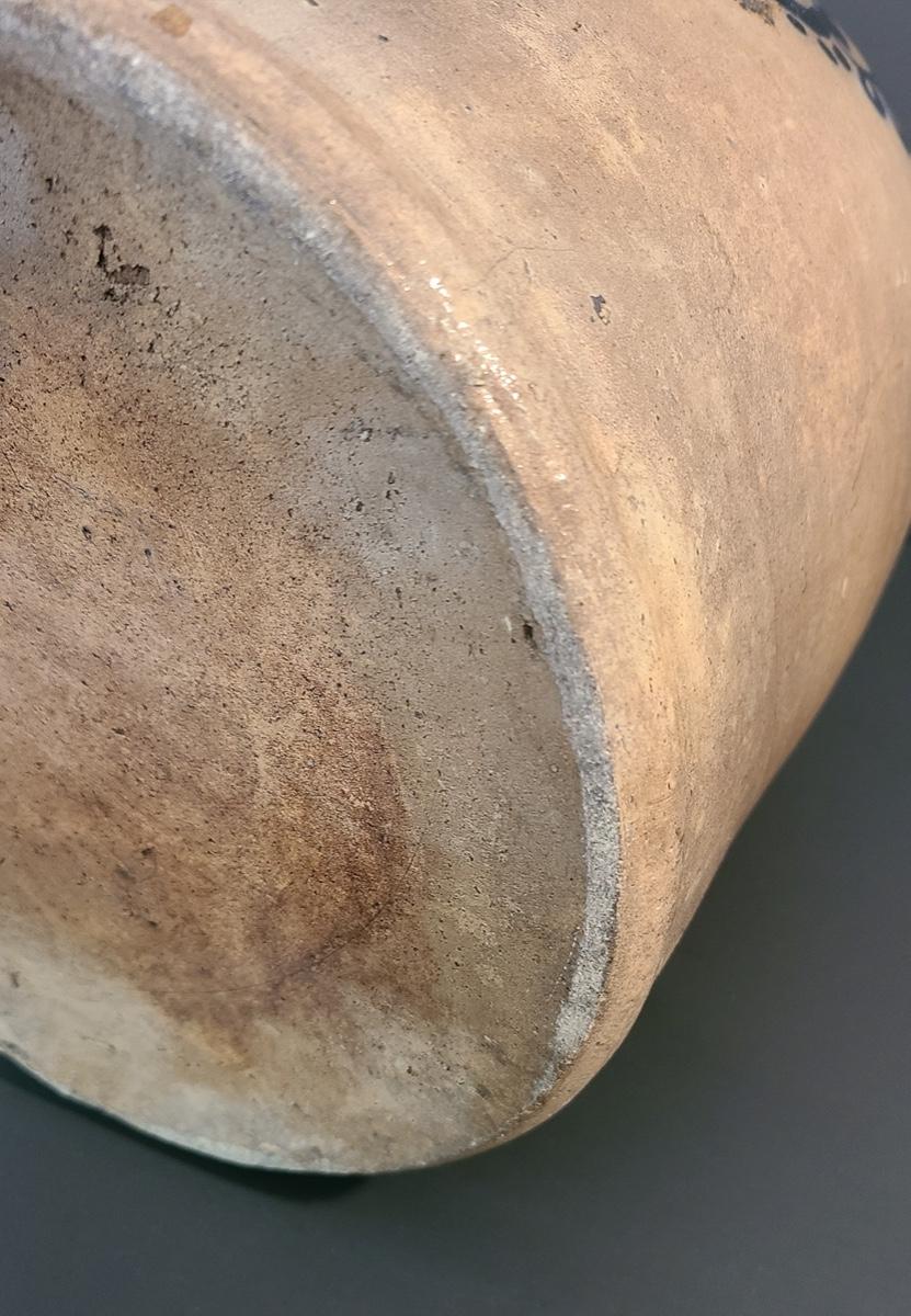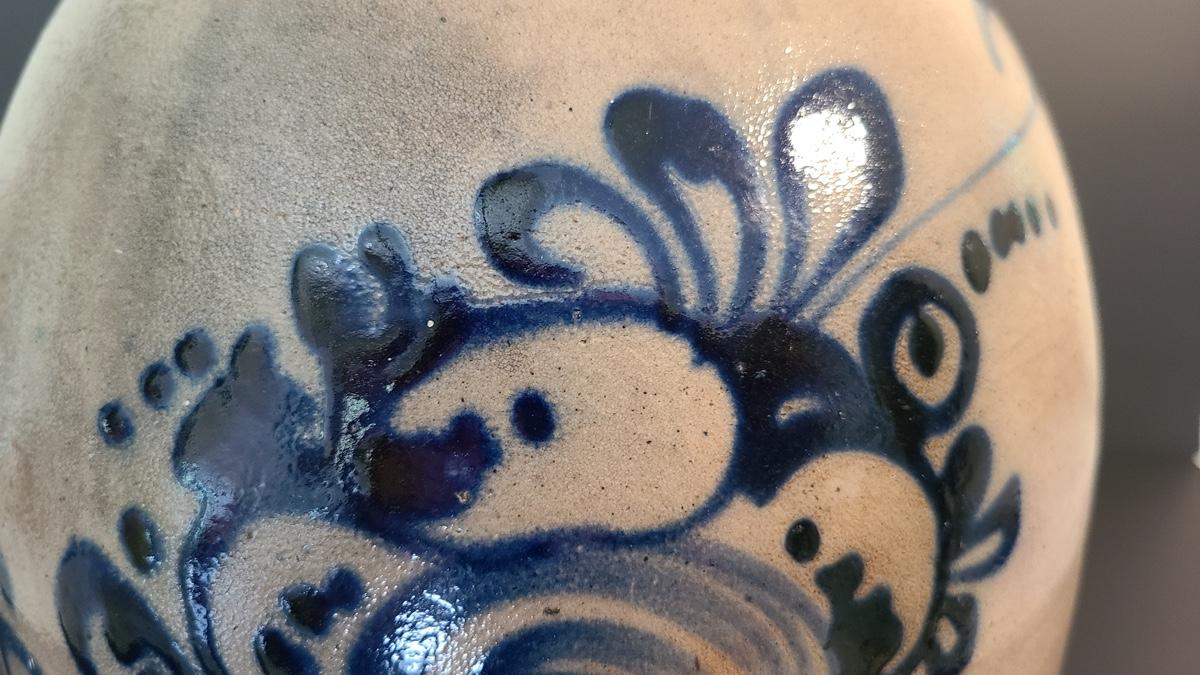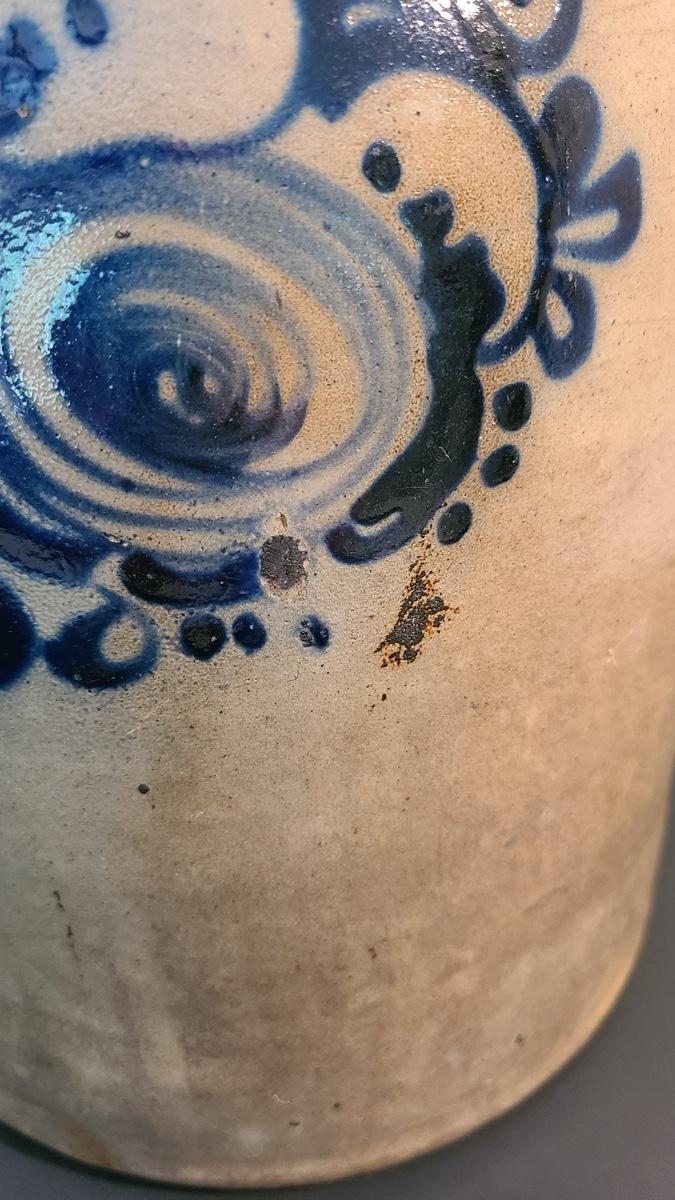The color on this jug is deep and pops! Jug has a nice glaze shine to it, and shows minimal wear for its age including a chip in the lip, and a nick in the floral "circles", not sure if the dark spot is turkey drippings. The design on this is large and an eye catcher! Please see all pictures as they are the best representation of the items, the condition of the items, and show measurements if taken. Pictures have been taken from all angles of the crocks and jugs so that you can determine condition according to your collecting.
