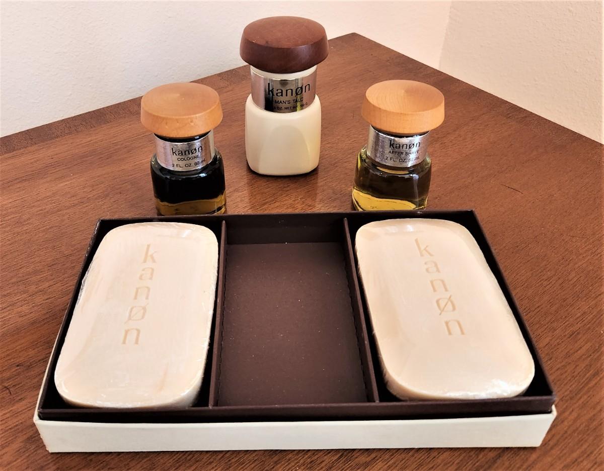 You get all you see here - box with two unopened full size soaps, 2 oz aftershave, men's talc (3.5 oz - 1/2 full), 2 oz cologne. The aftershave and cologne appear to be full. From a Swedish Company that specialized in high-quality men's toiletries. I did a little research and was shocked at what these retail for.