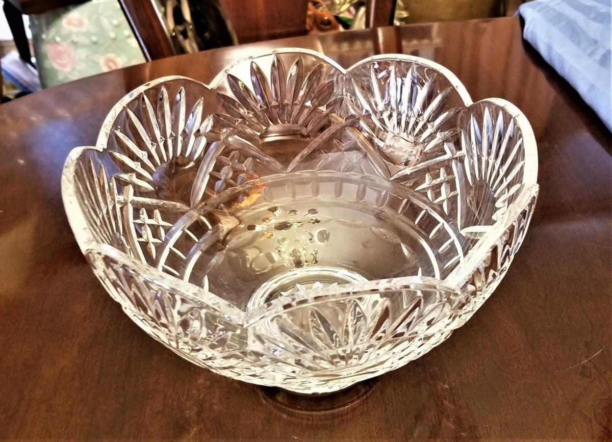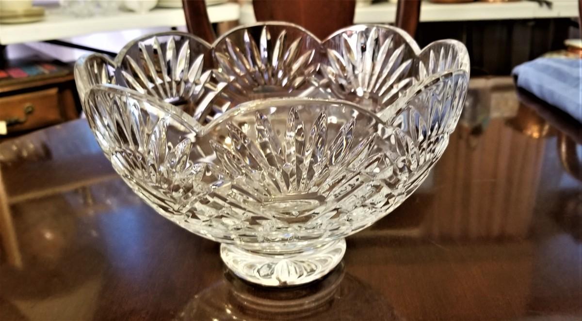 Very nice WATERFORD crystal footed bowl - we are pretty sure it is in the "Dorset" pattern. Scalloped edge, no box - 9.75" across, 6" tall. Good condition.