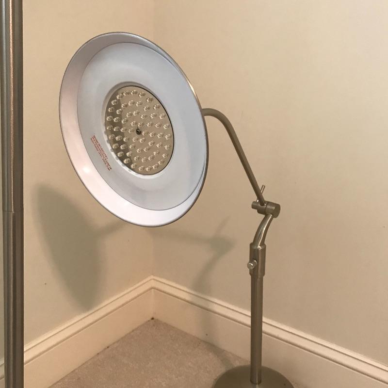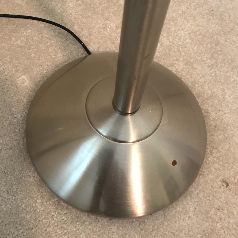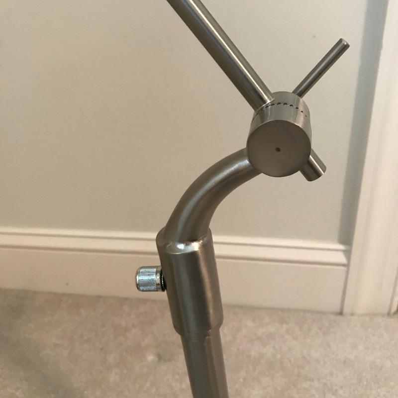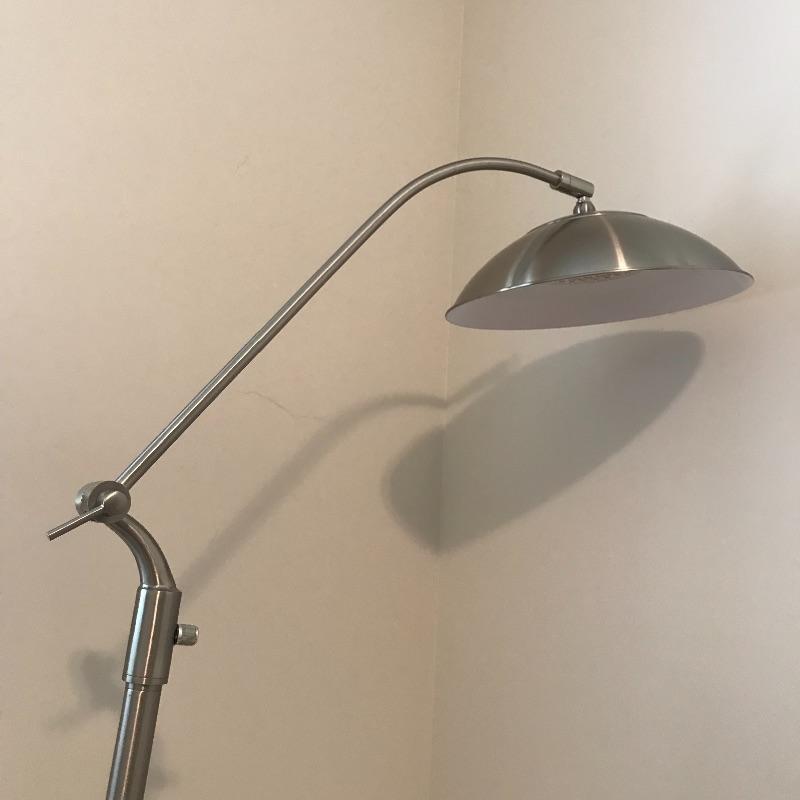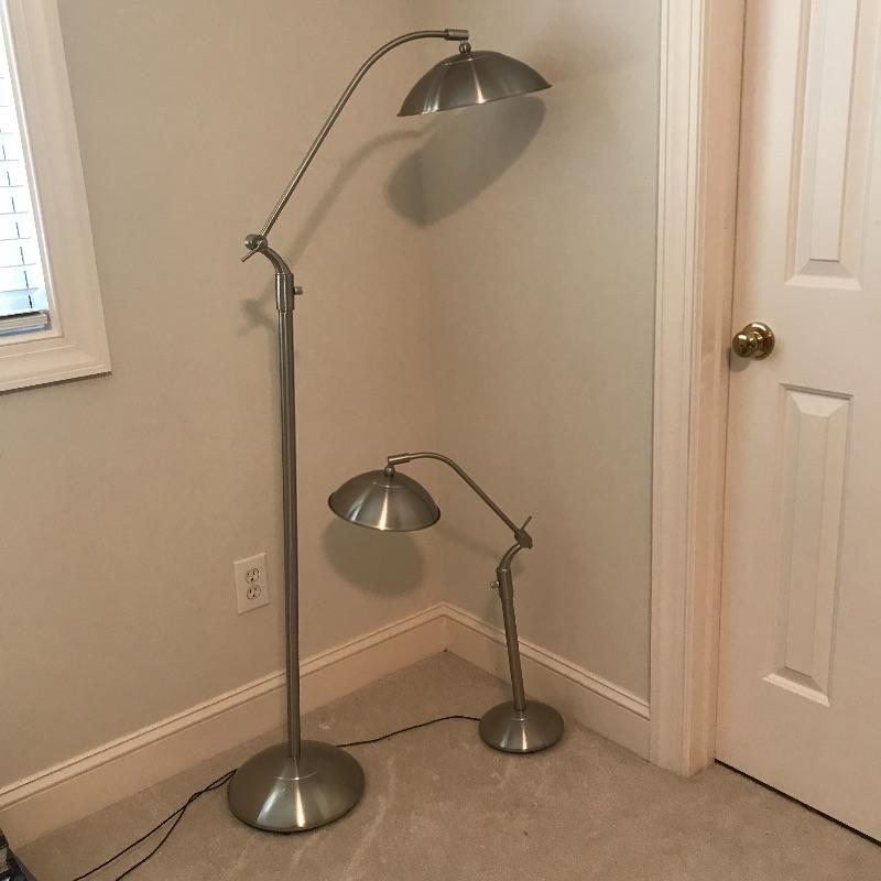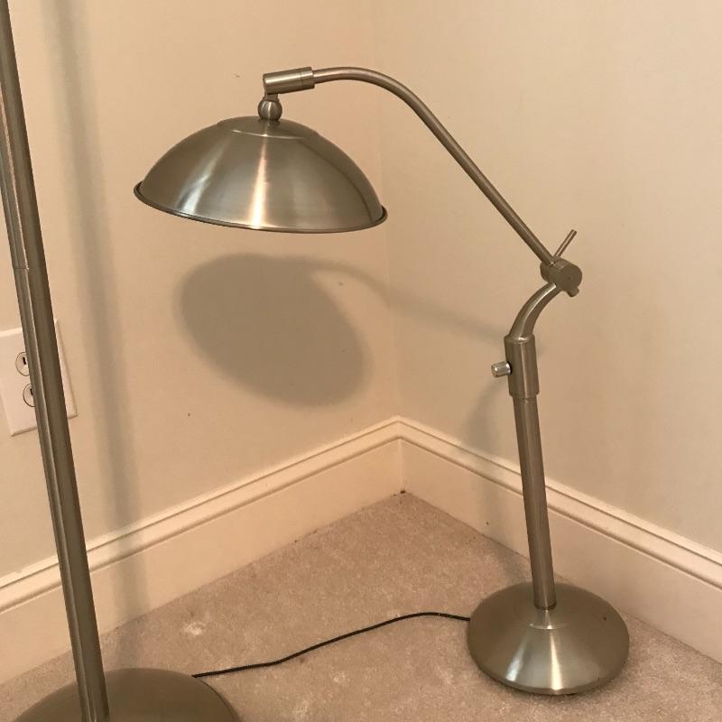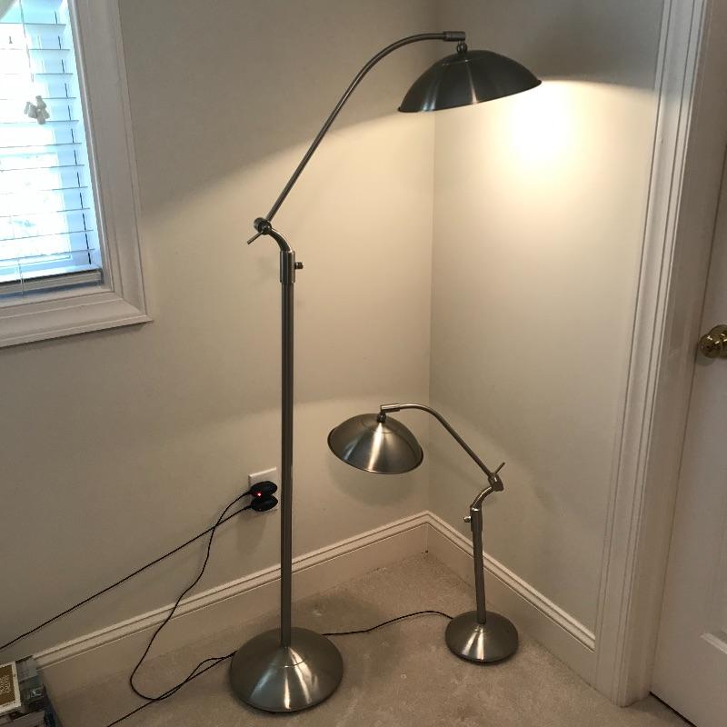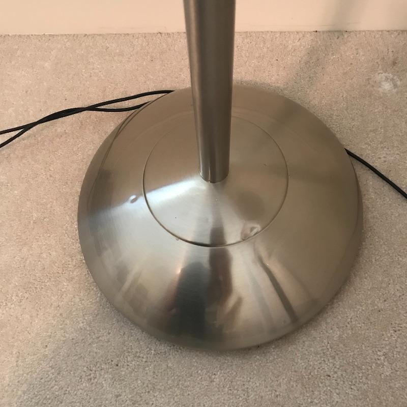 Nice silver metal duo of lamps with both an MCM and futuristic feel. Both lamps work and have two brightness settings. The lamps both adjust at the shade and again lower down the arm. The tallest lamp is photographed at 58” while the lower one is shown at about 2’. See photos. No shipping.