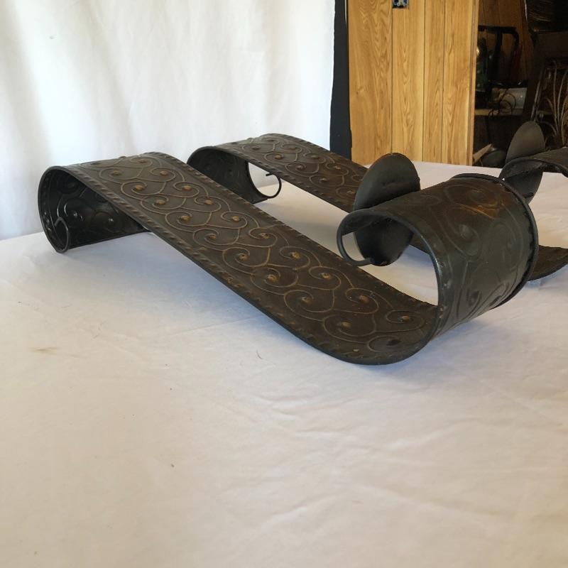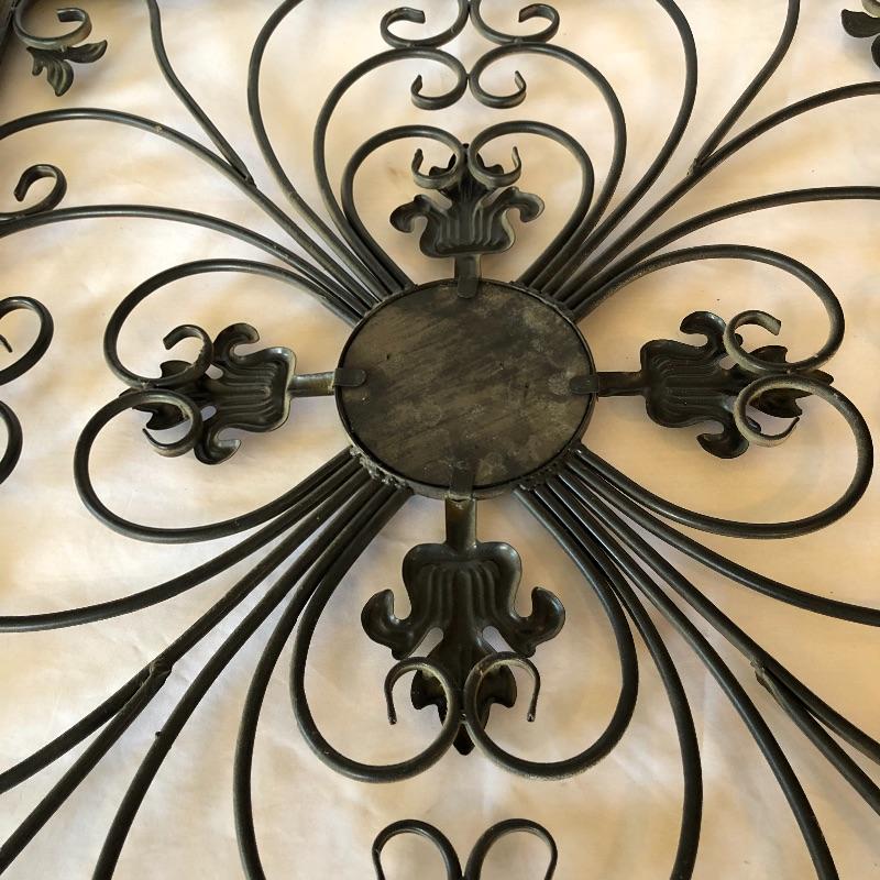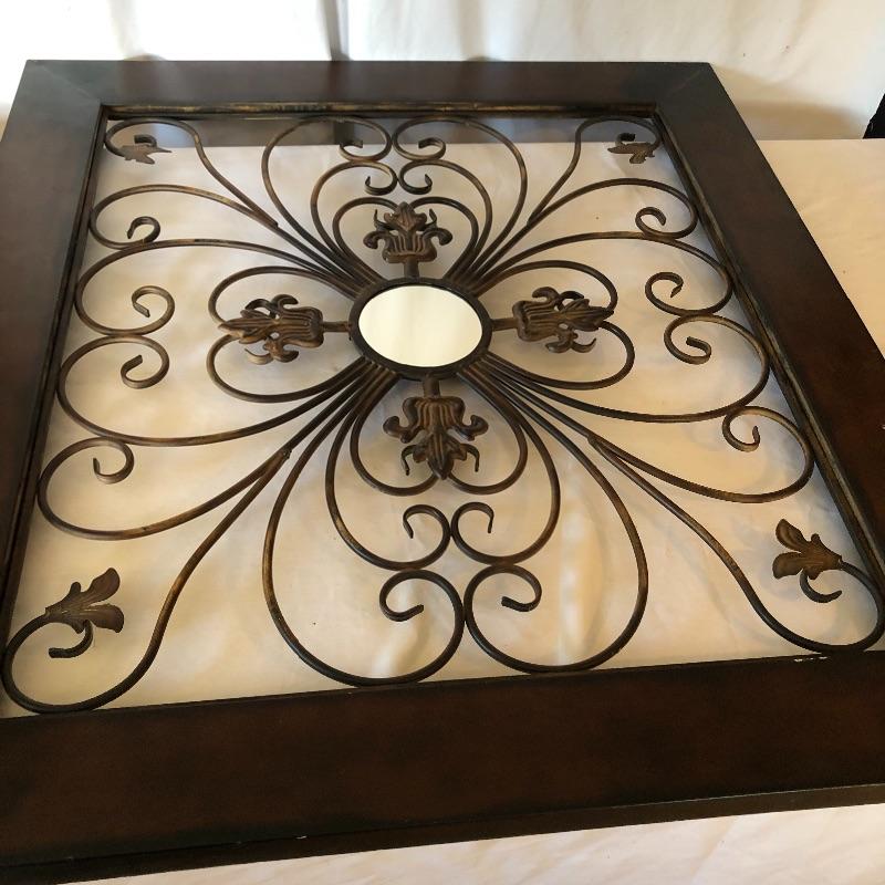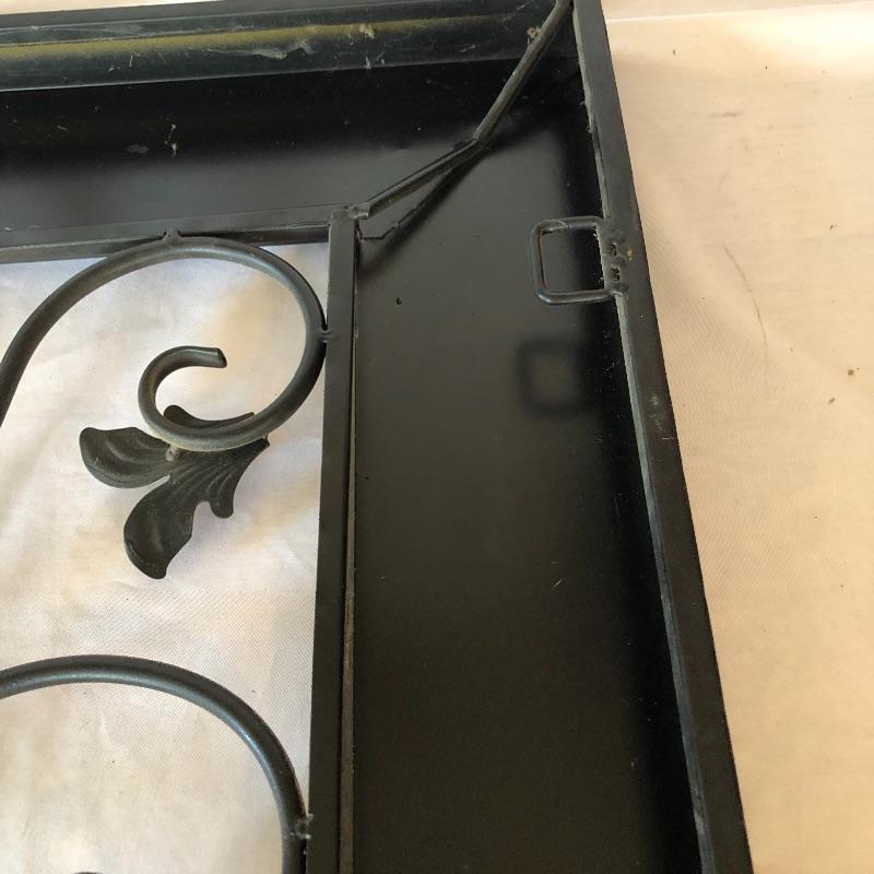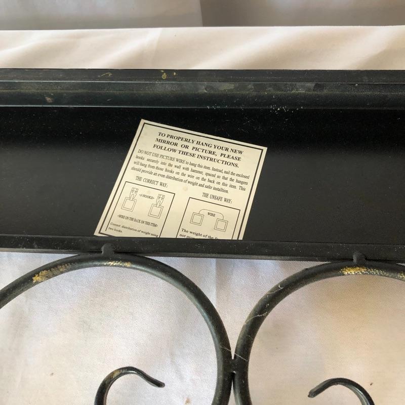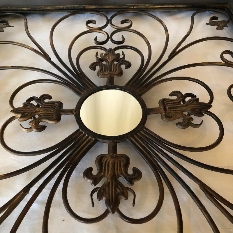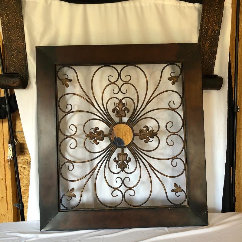 Add a bit of flair to your wall with this unique metal mirror and matching scrolling candle holders. Dimensions of mirror: 42” x 38”. Dimensions of candle holders: 24” x 5”. Local pick up only.