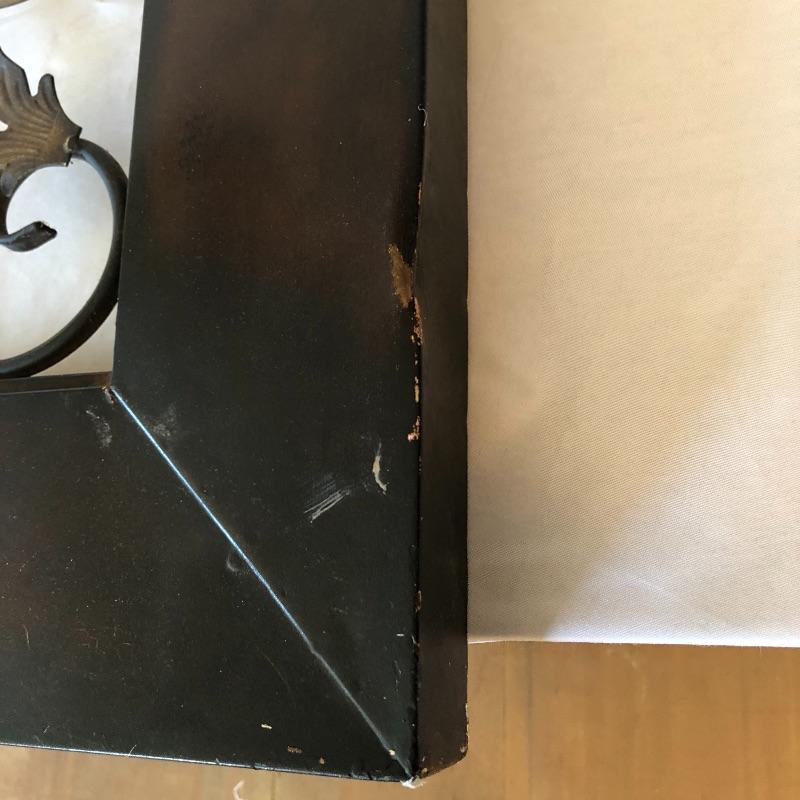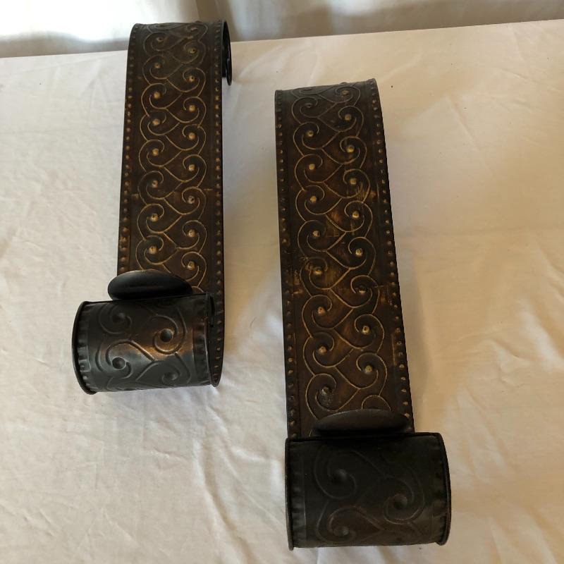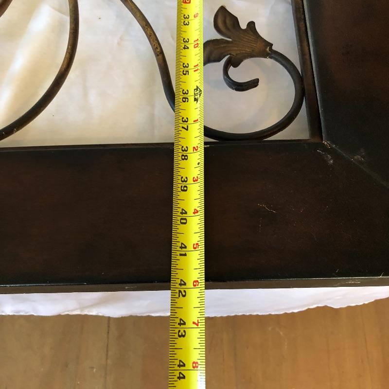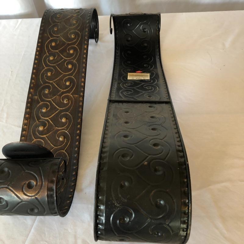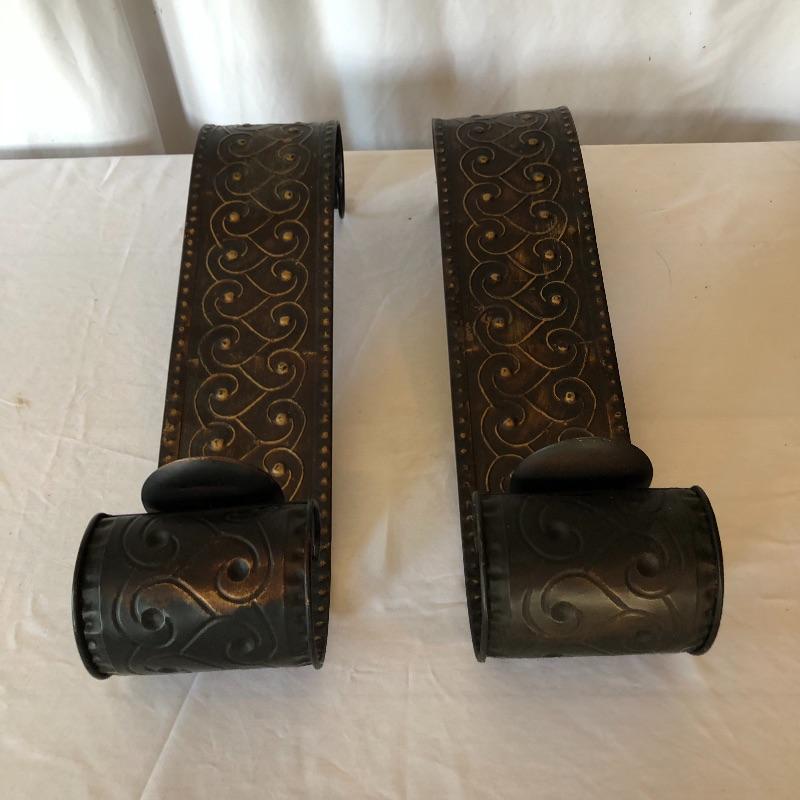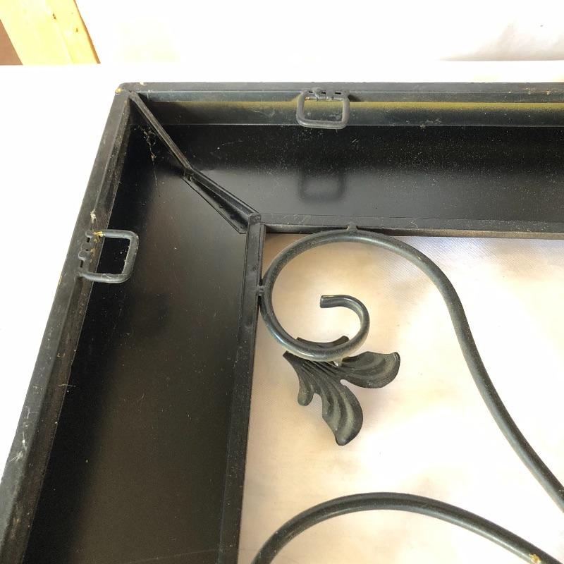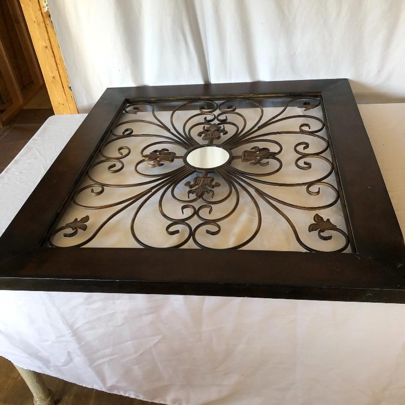 Add a bit of flair to your wall with this unique metal mirror and matching scrolling candle holders. Dimensions of mirror: 42” x 38”. Dimensions of candle holders: 24” x 5”. Local pick up only.