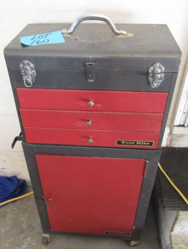 2 PIECE TOOL CHEST WITH 3 DRAWERS, STORAGE CABINET ON THE BOTTOM AND TOOLBOX LIKE STORAGE ON TOP.